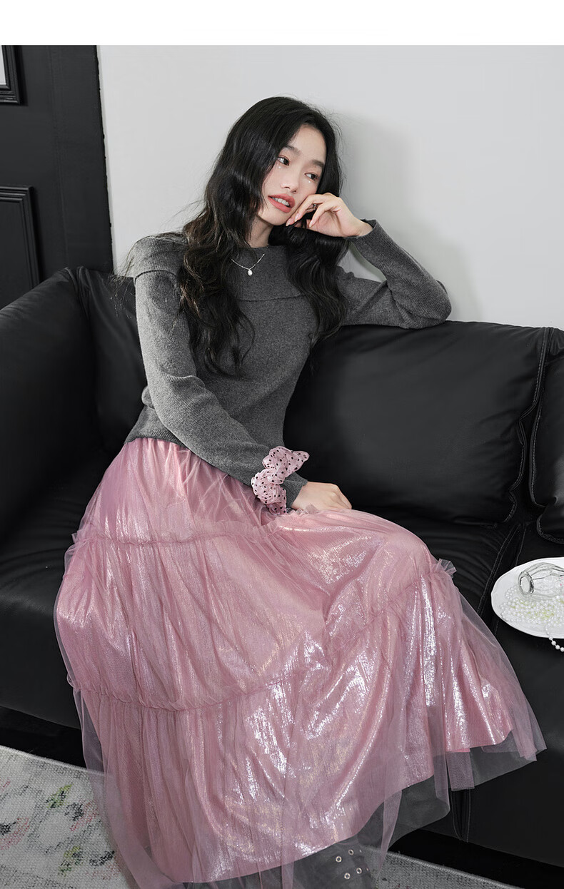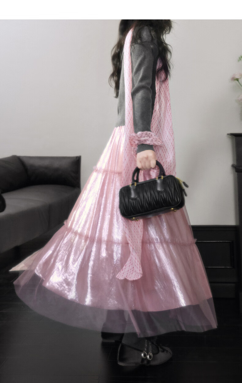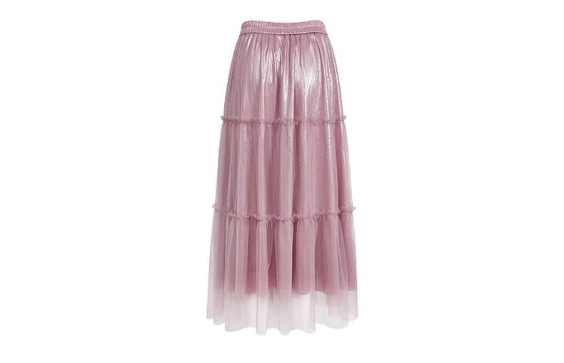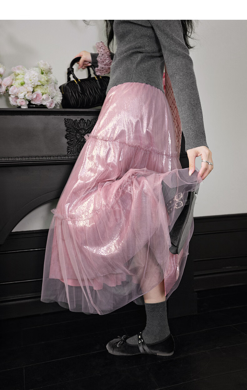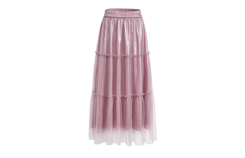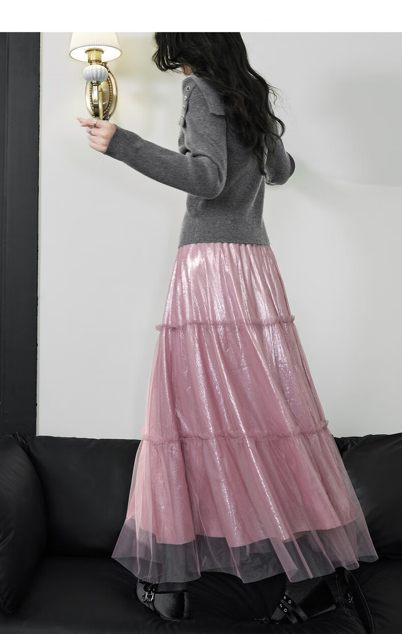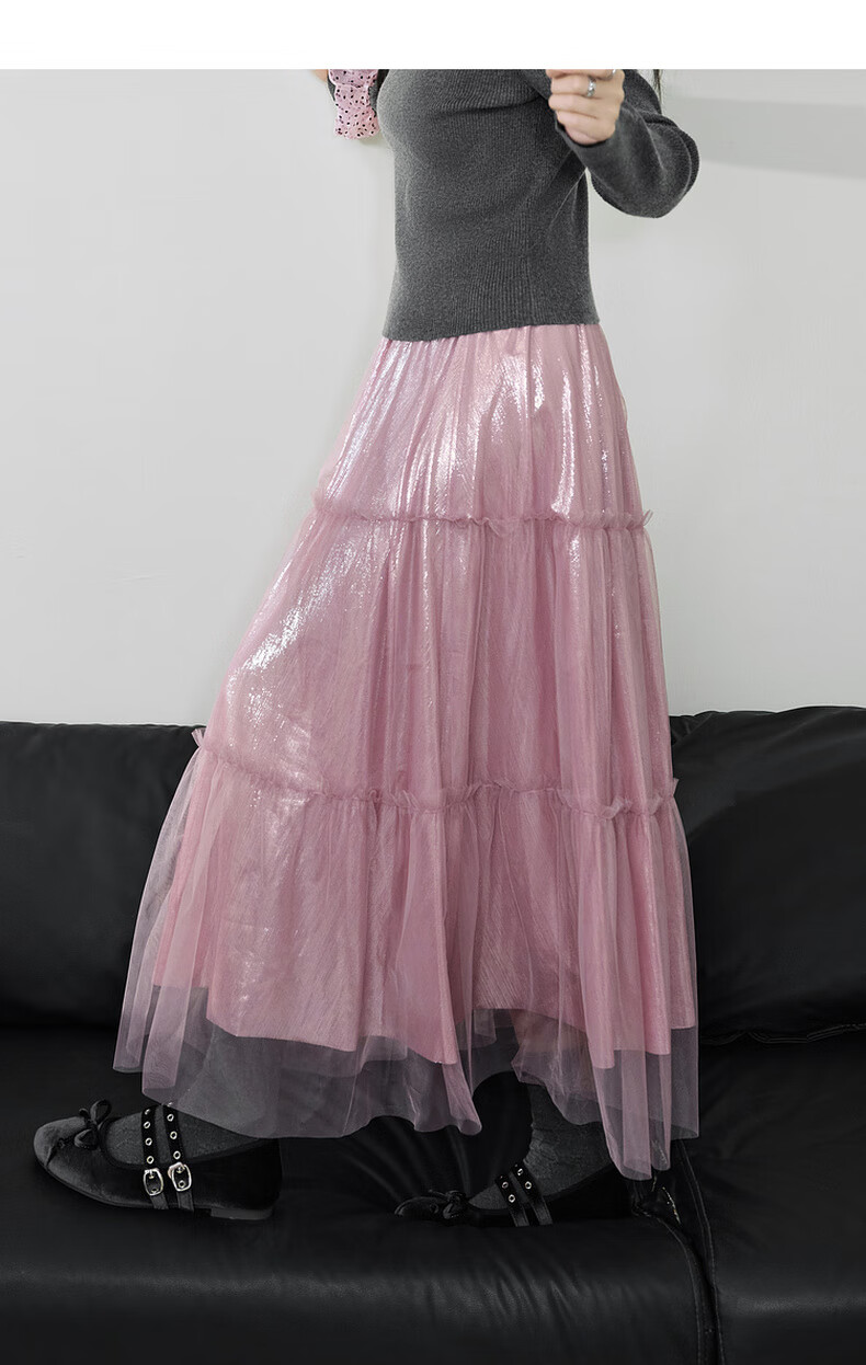 阔色粉色亮闪纱裙气质半身裙a字长裙子2025秋冬季新款女伞裙半裙 粉色 S