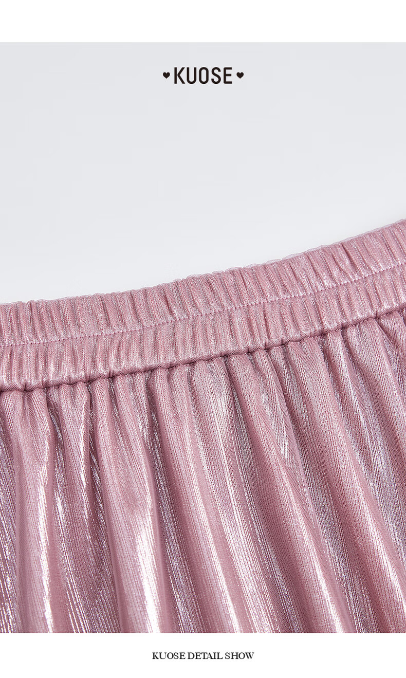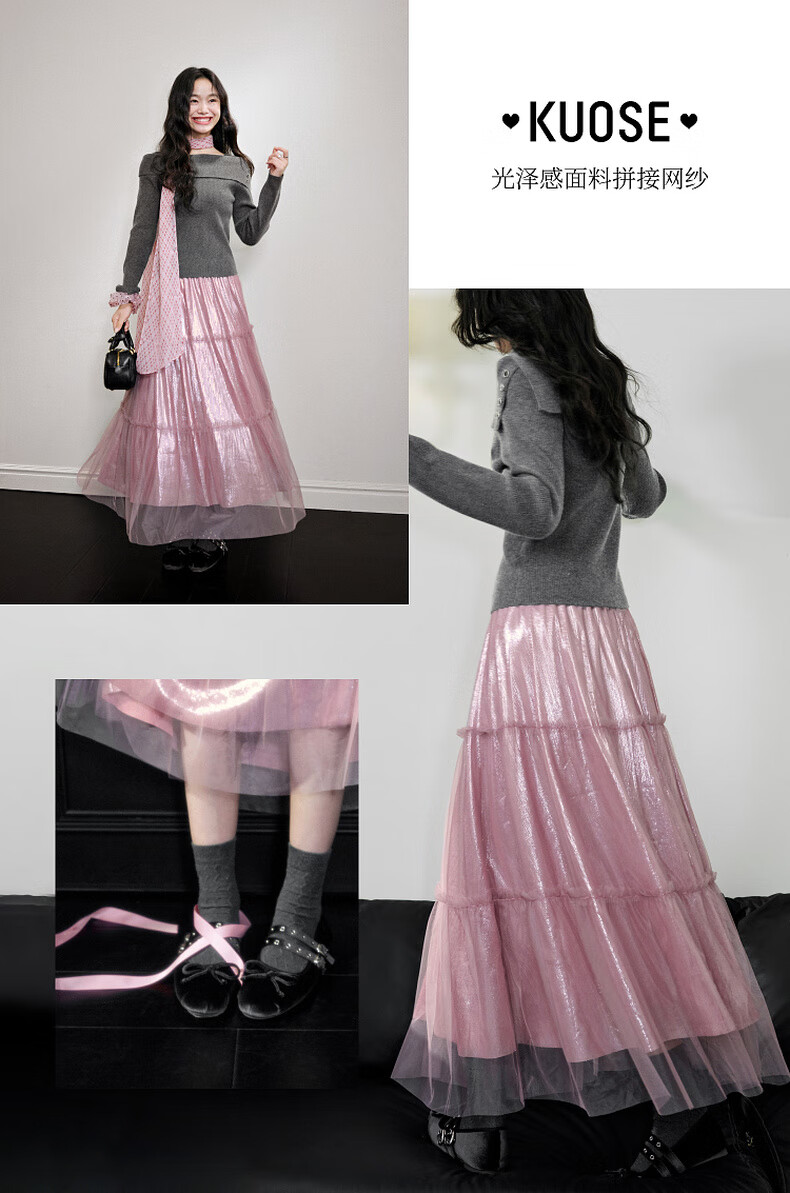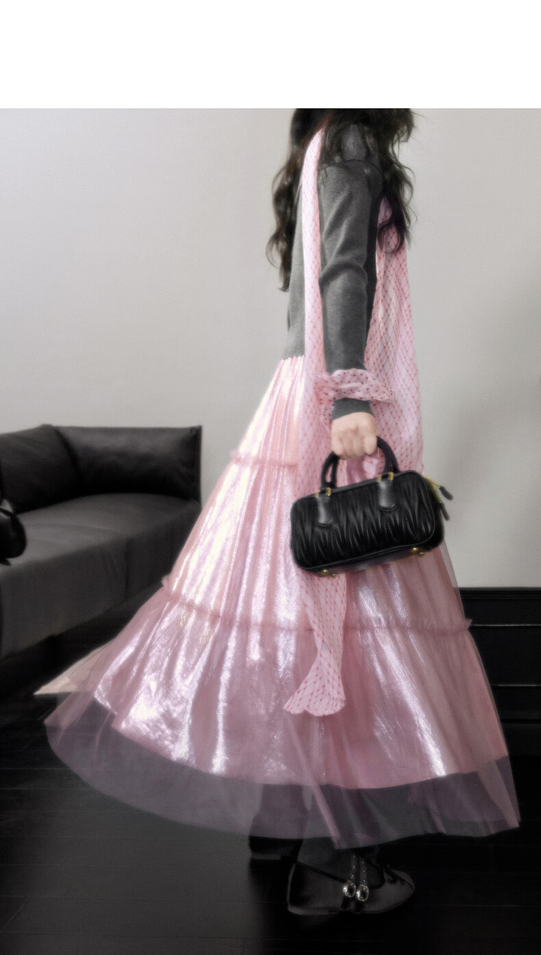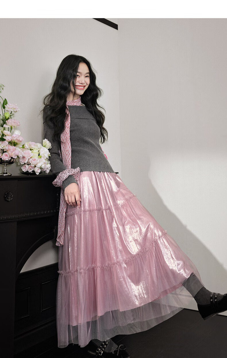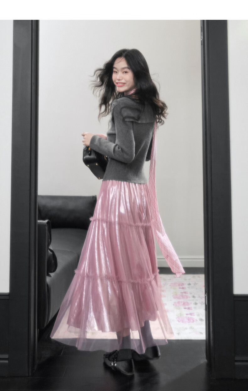 阔色粉色亮闪纱裙气质半身裙a字长裙子2025秋冬季新款女伞裙半裙 粉色 S