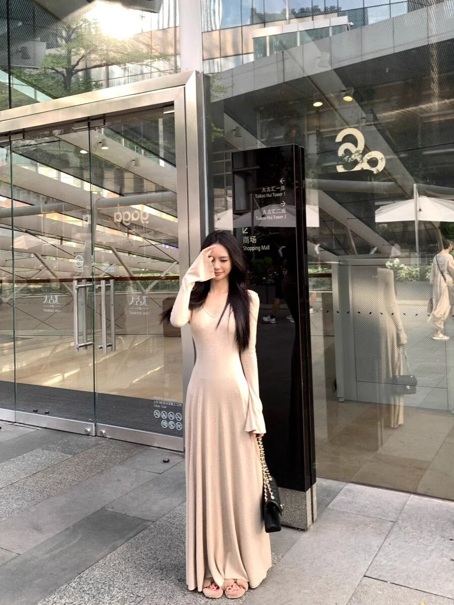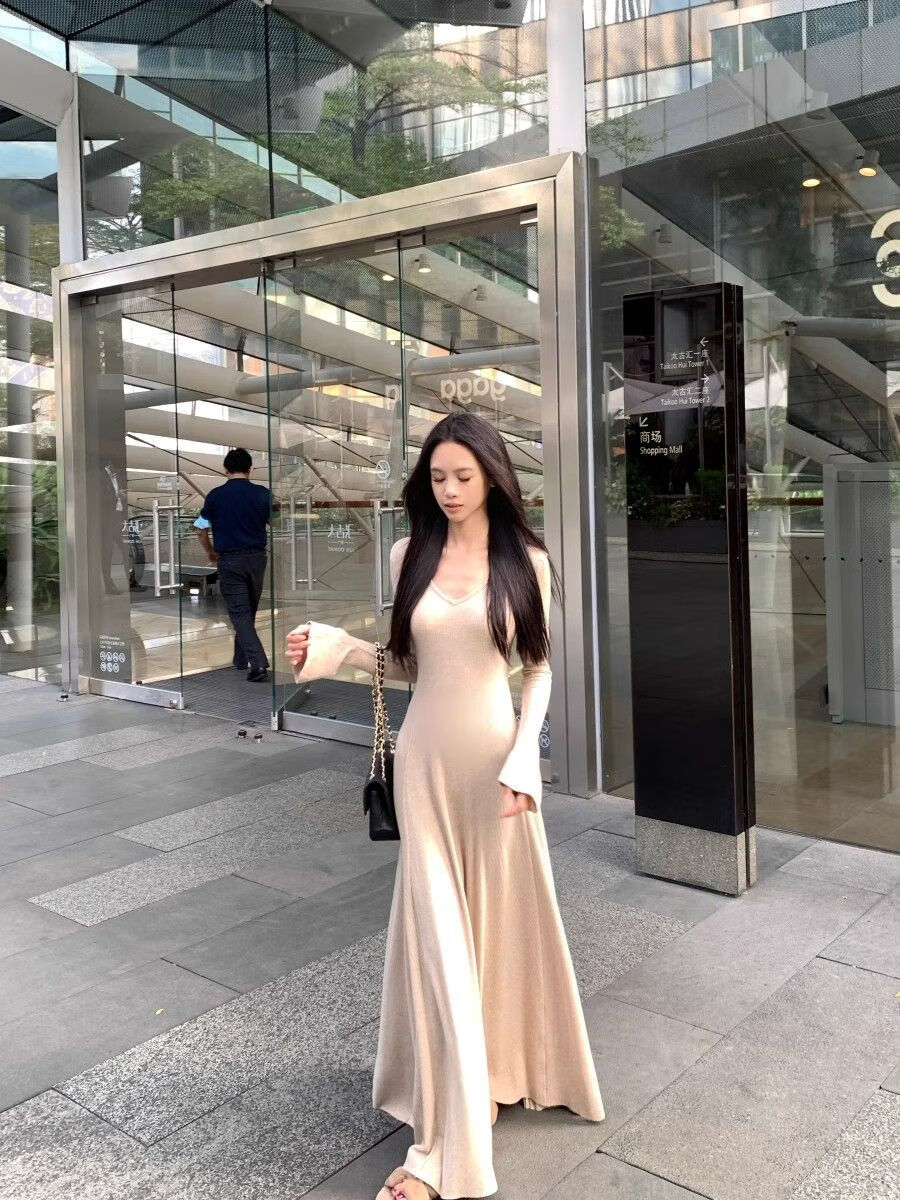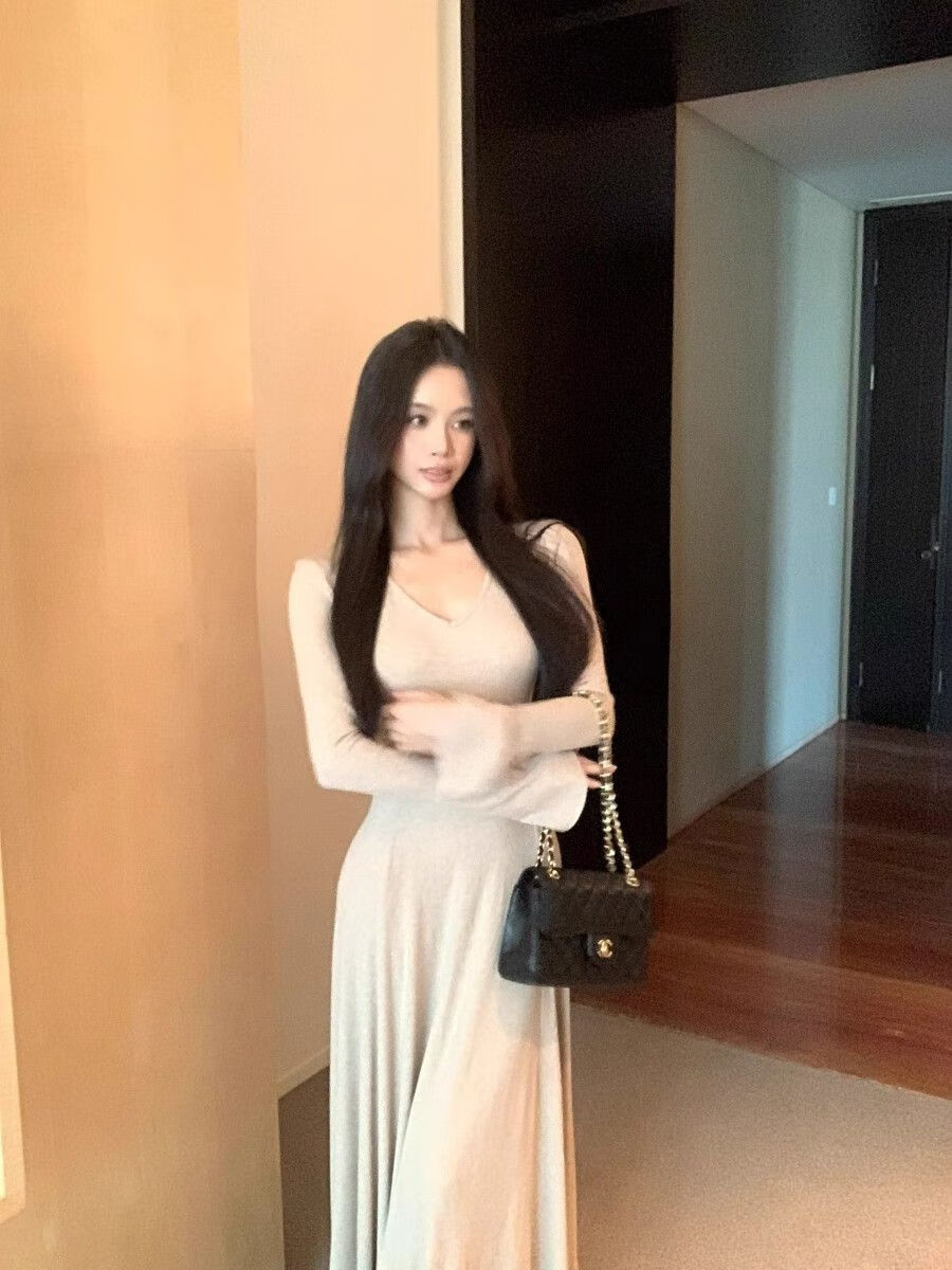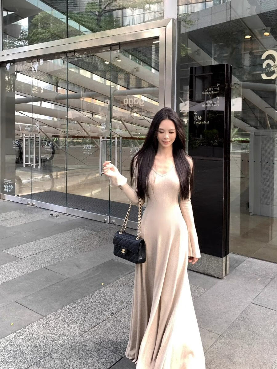 温柔风气质V领内搭长袖针织连衣裙女冬季黑色性感收腰修身长裙子 杏色 L 【建议110-120斤】