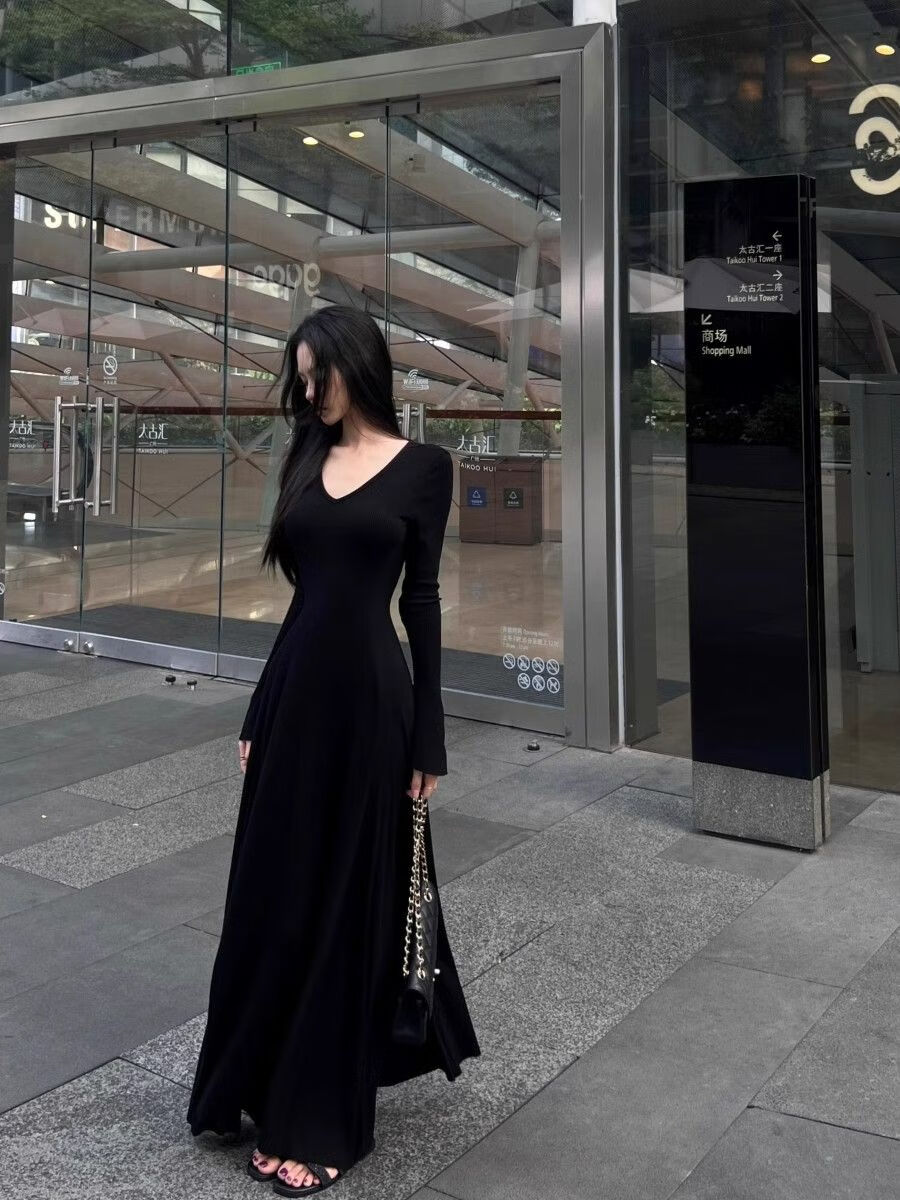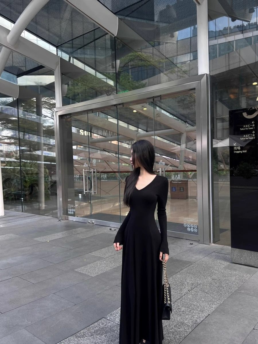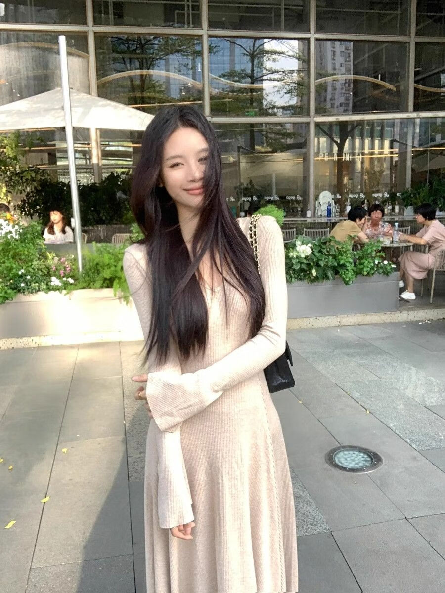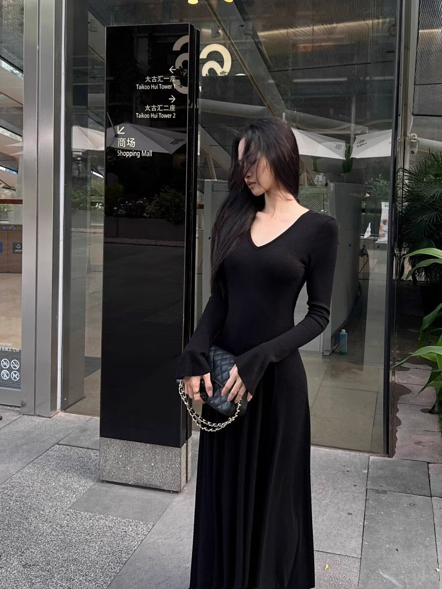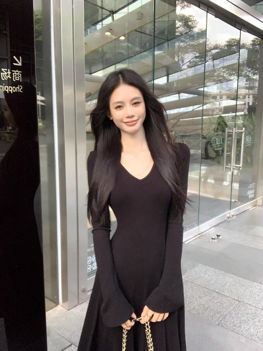 温柔风气质V领内搭长袖针织连衣裙女冬季黑色性感收腰修身长裙子 杏色 L 【建议110-120斤】