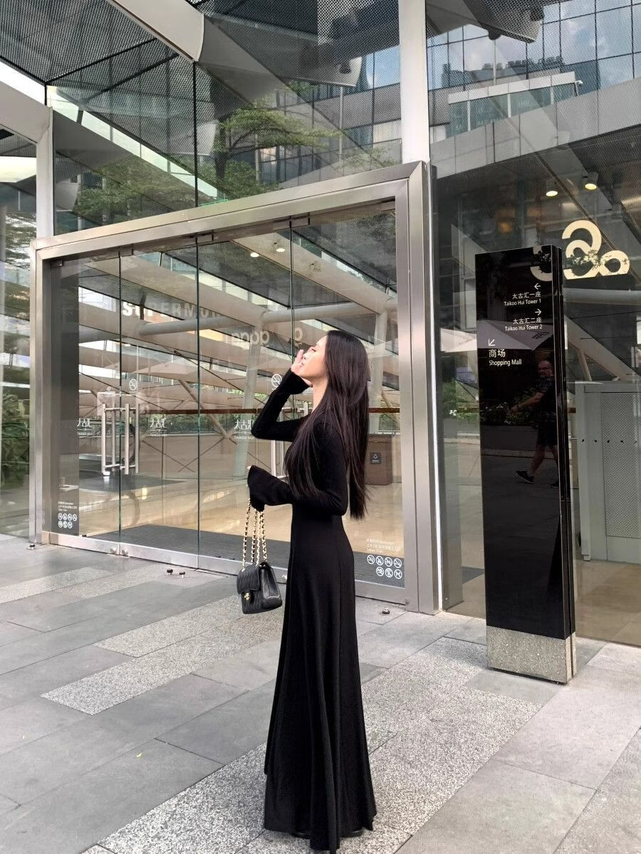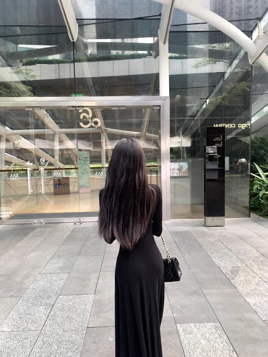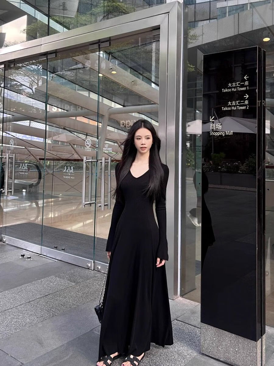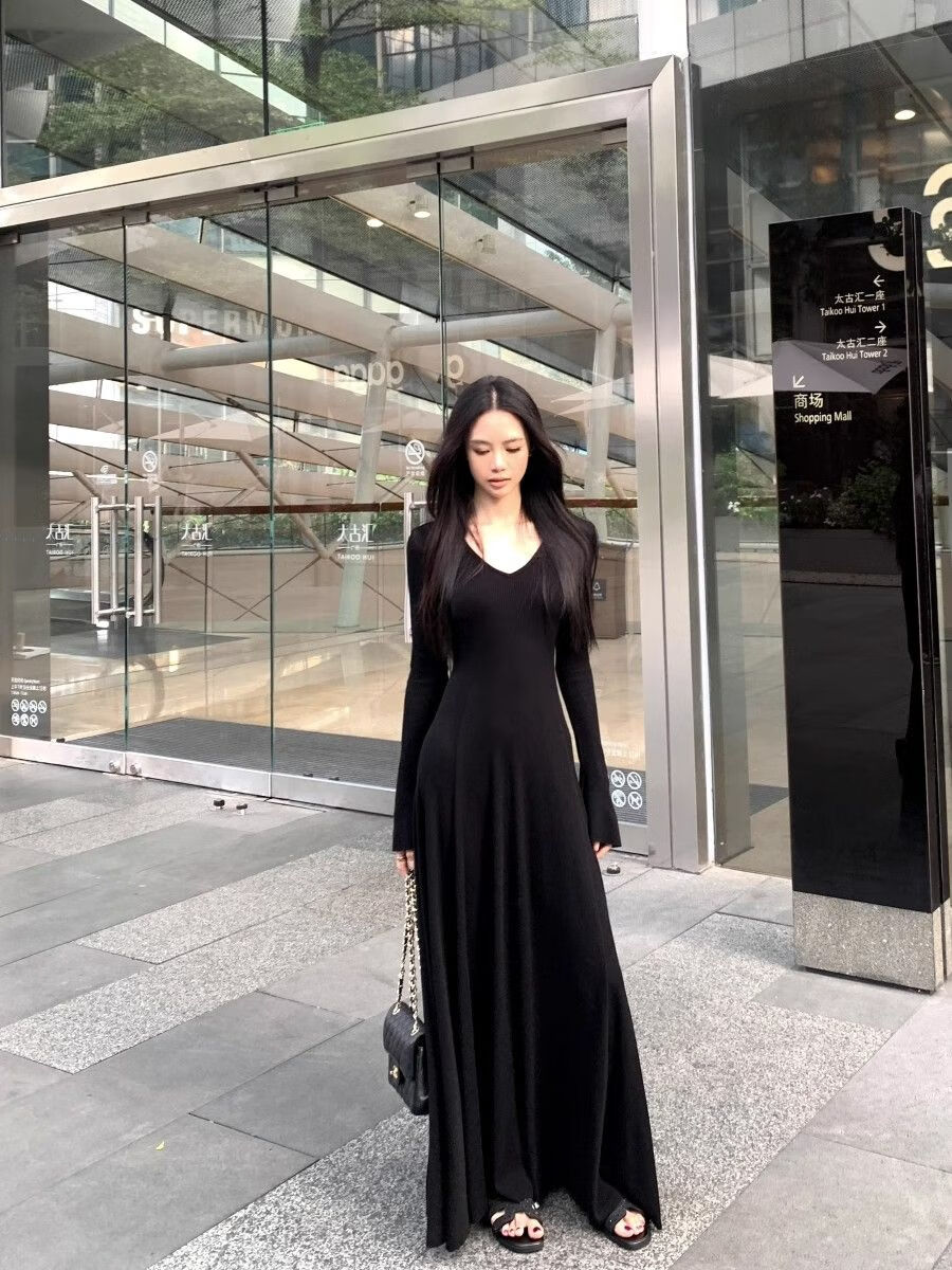 温柔风气质V领内搭长袖针织连衣裙女冬季黑色性感收腰修身长裙子 杏色 L 【建议110-120斤】