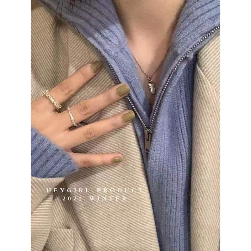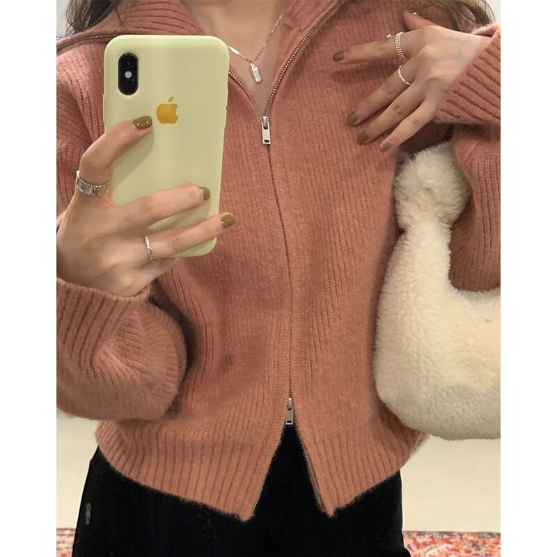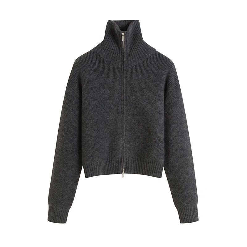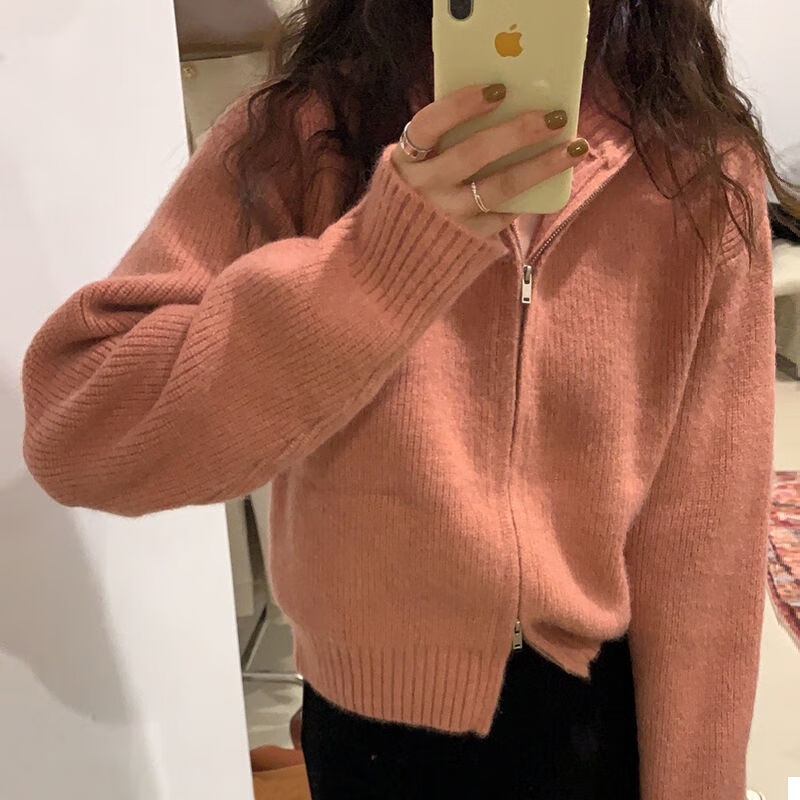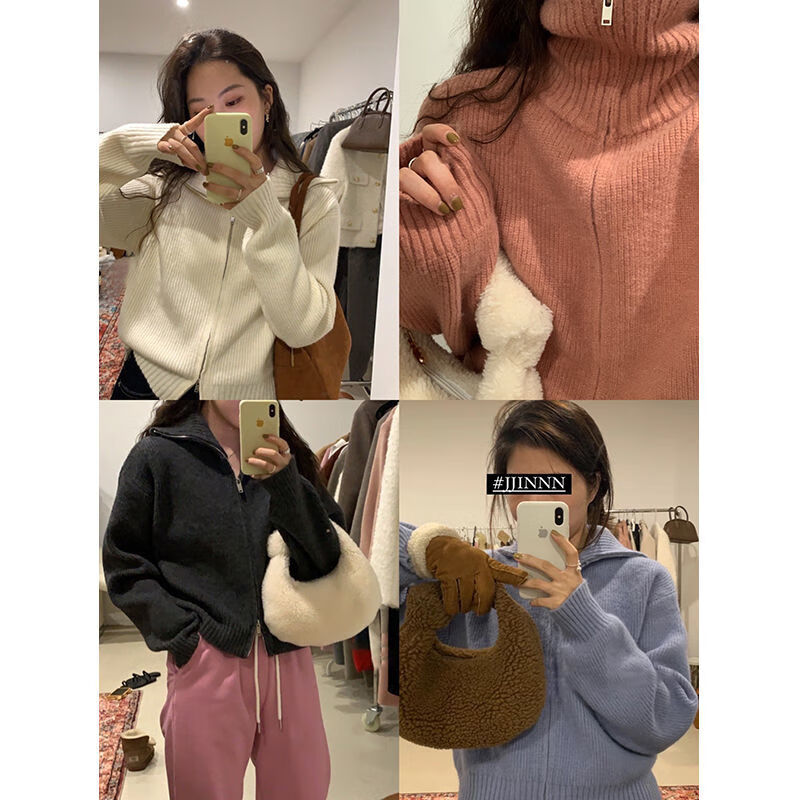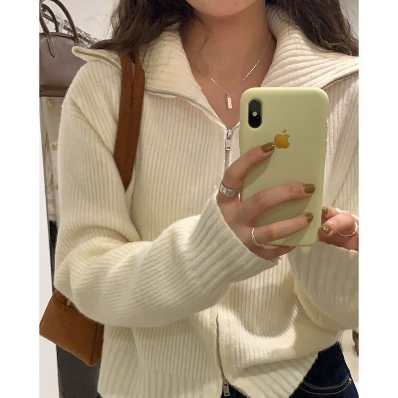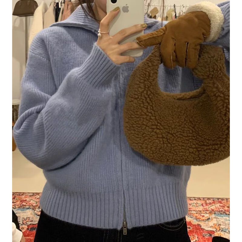 兰威费雷白色拉链毛衣外套女秋冬设计感小众翻领宽松加厚针织开衫外穿上衣 烟雾蓝 S