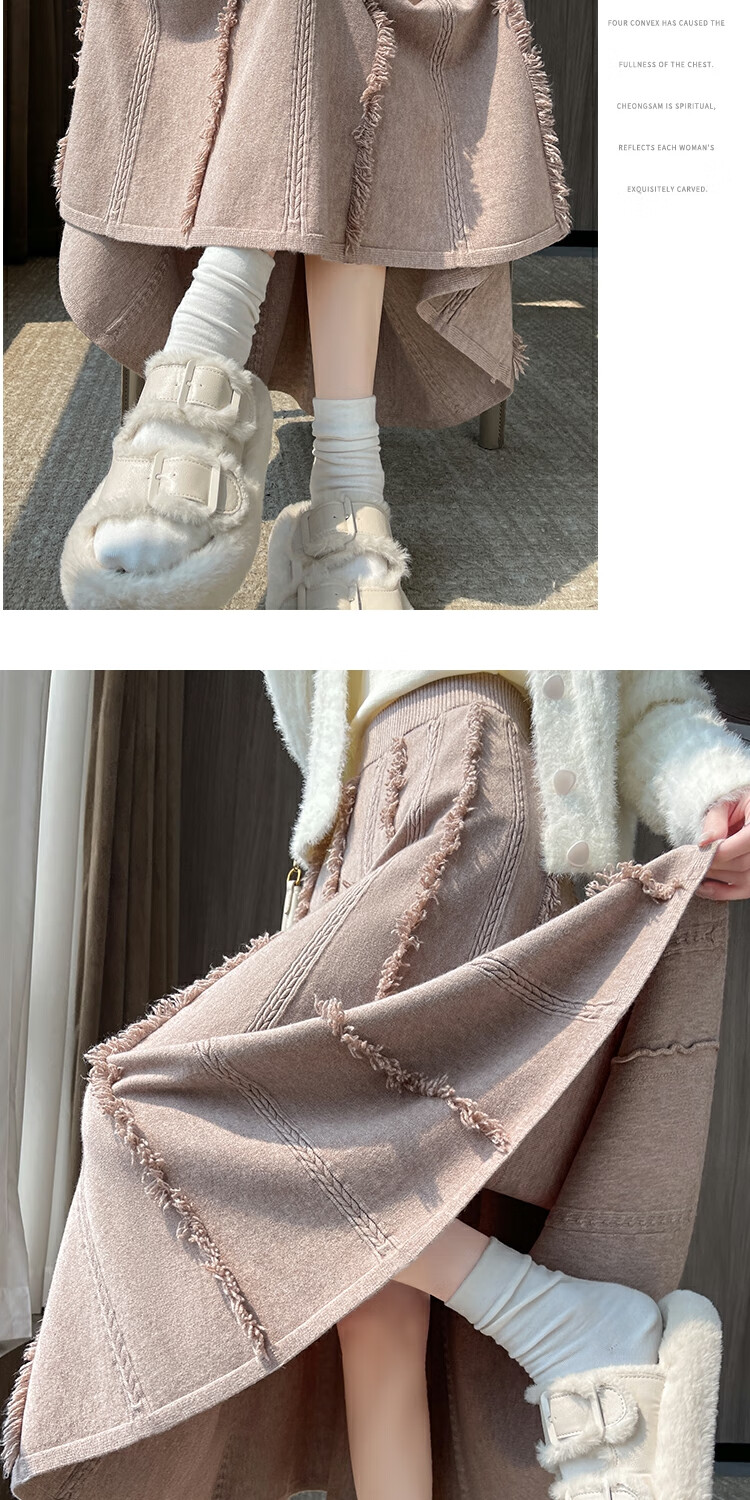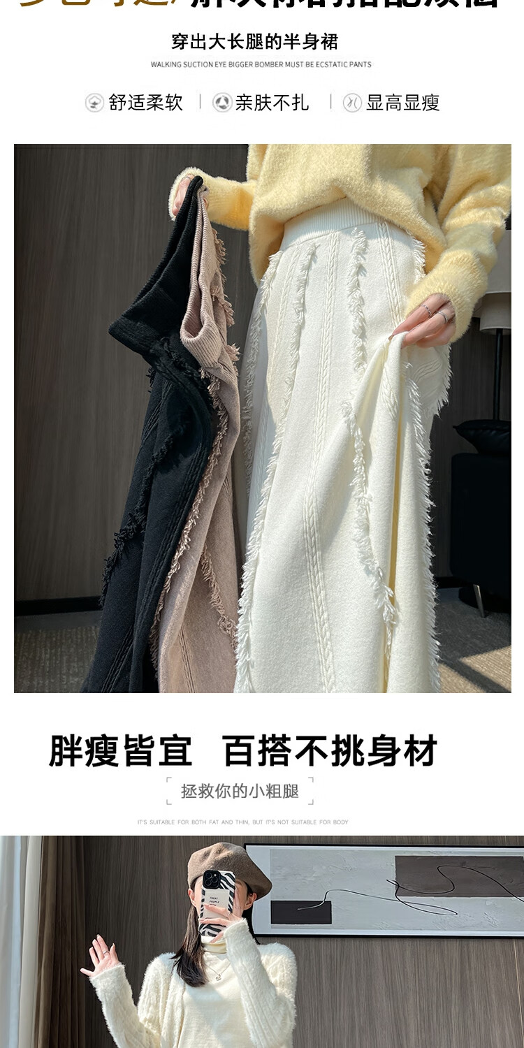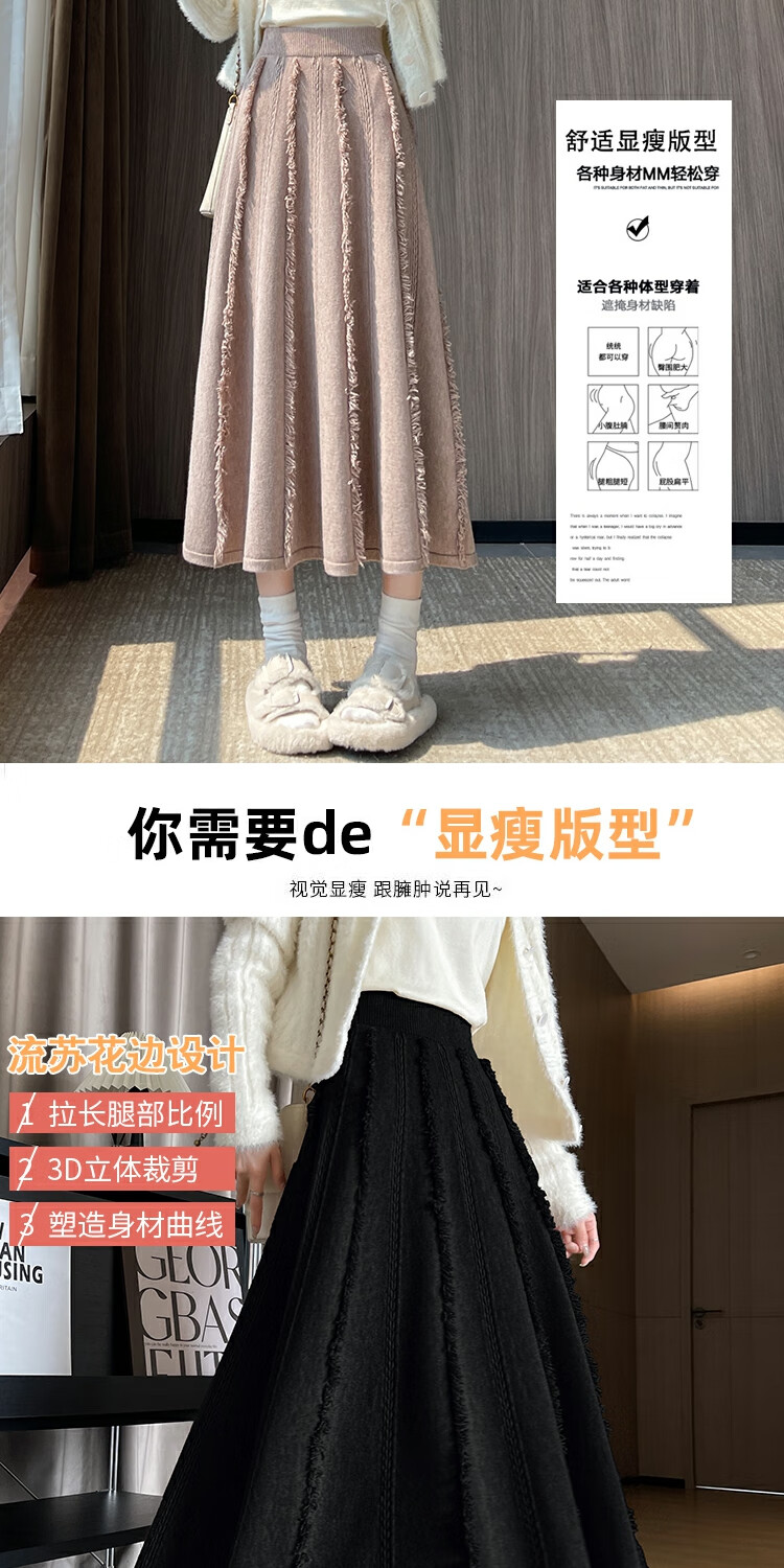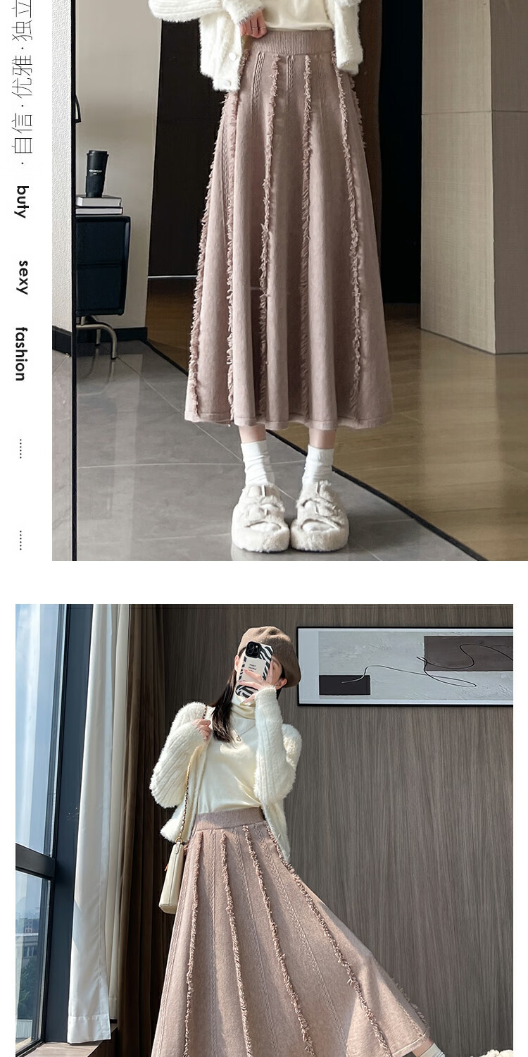 针织流苏糯米裙女秋冬2025新款高腰显瘦大摆软糯a字裙长款半身裙 4447杏色 S 【建议80斤-95斤】