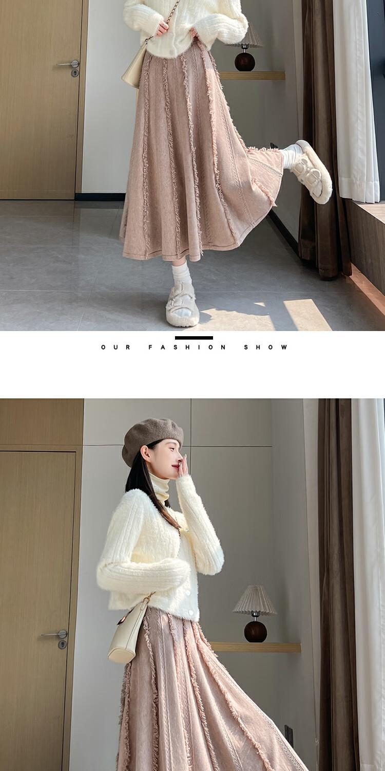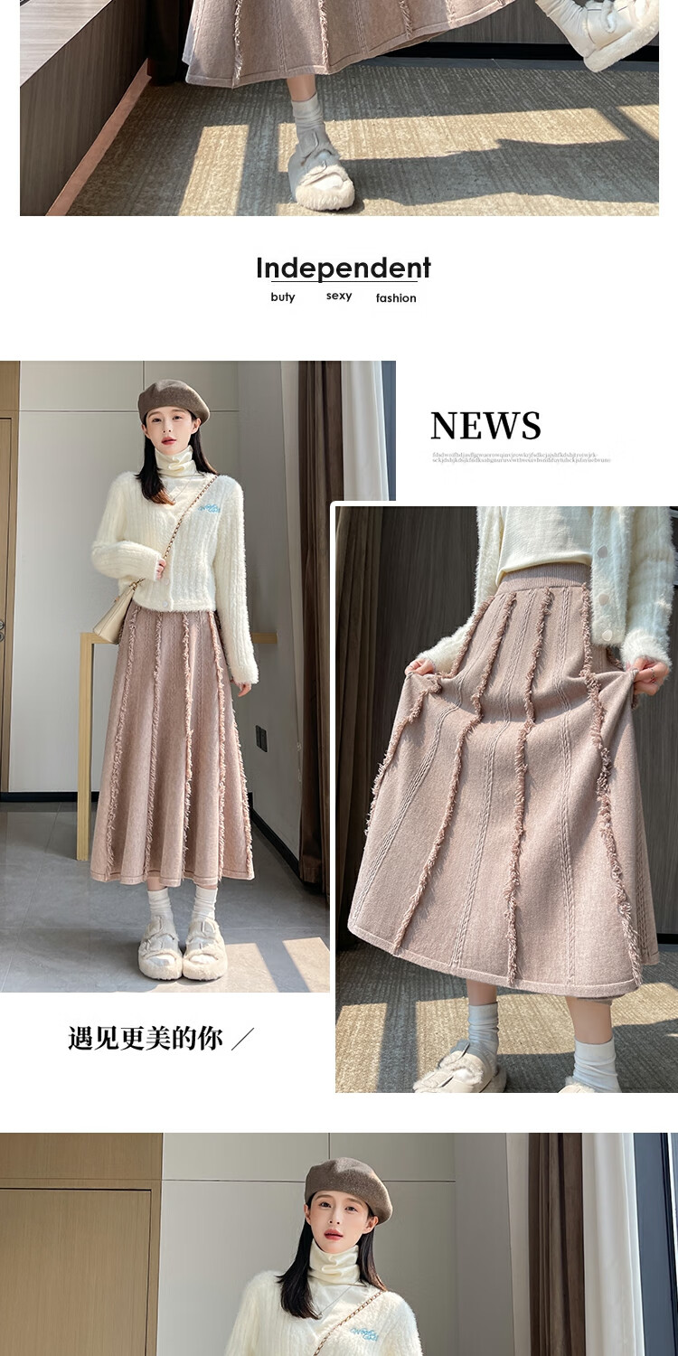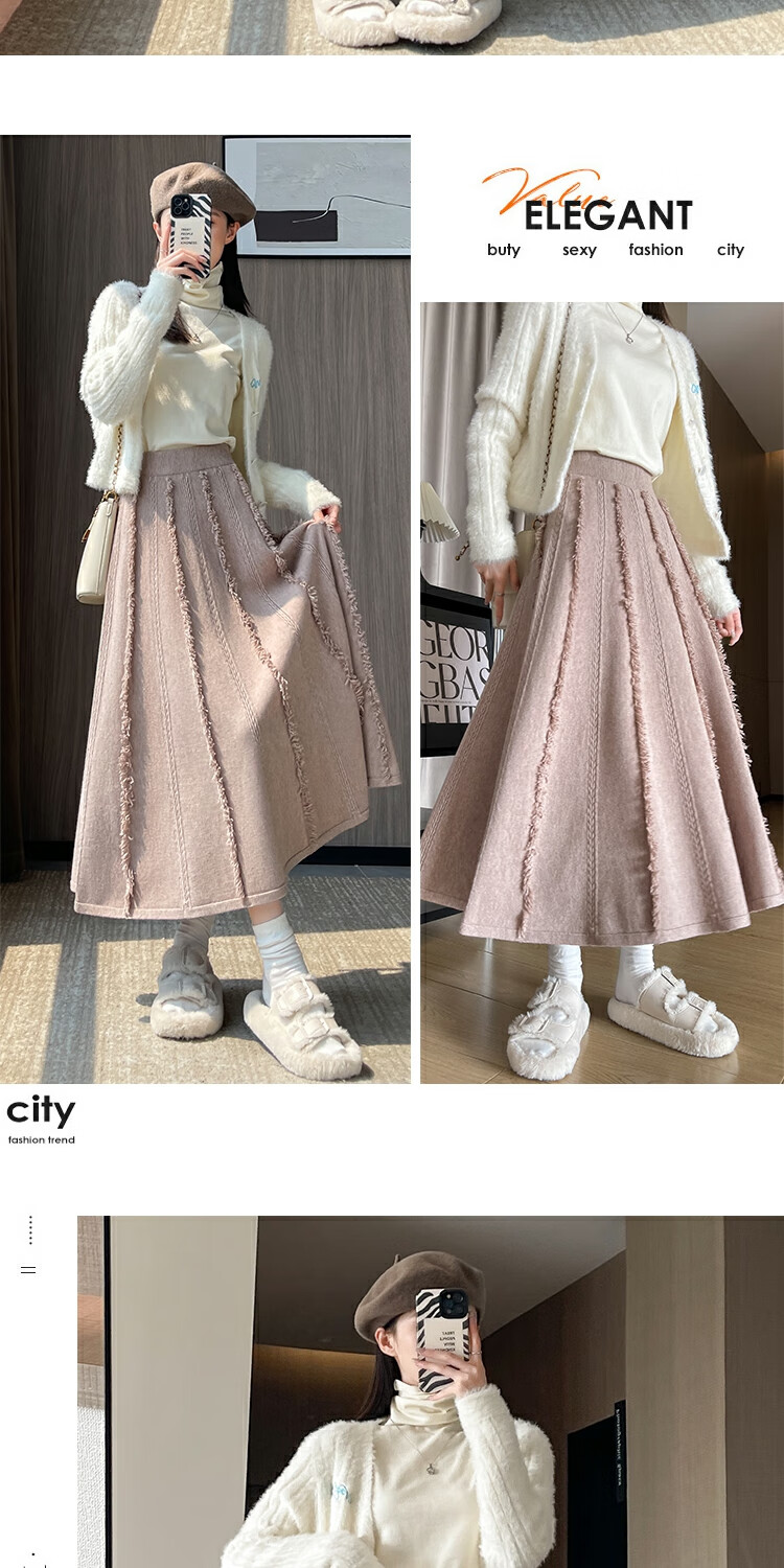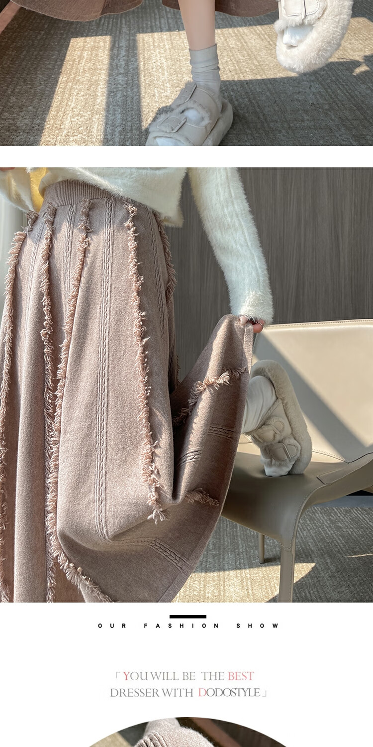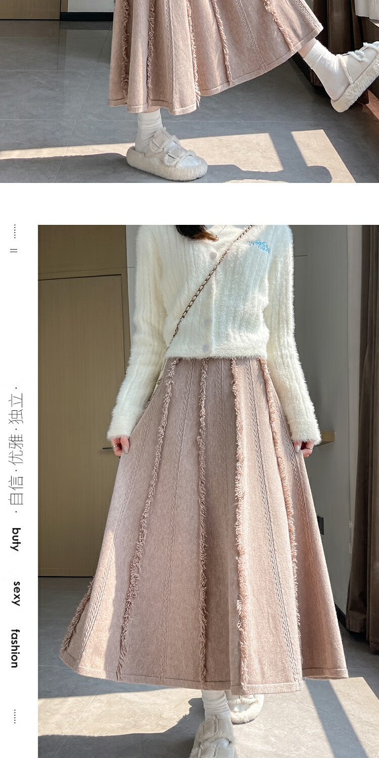 针织流苏糯米裙女秋冬2025新款高腰显瘦大摆软糯a字裙长款半身裙 4447杏色 S 【建议80斤-95斤】