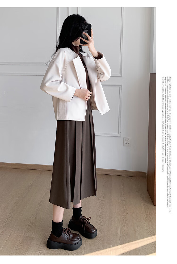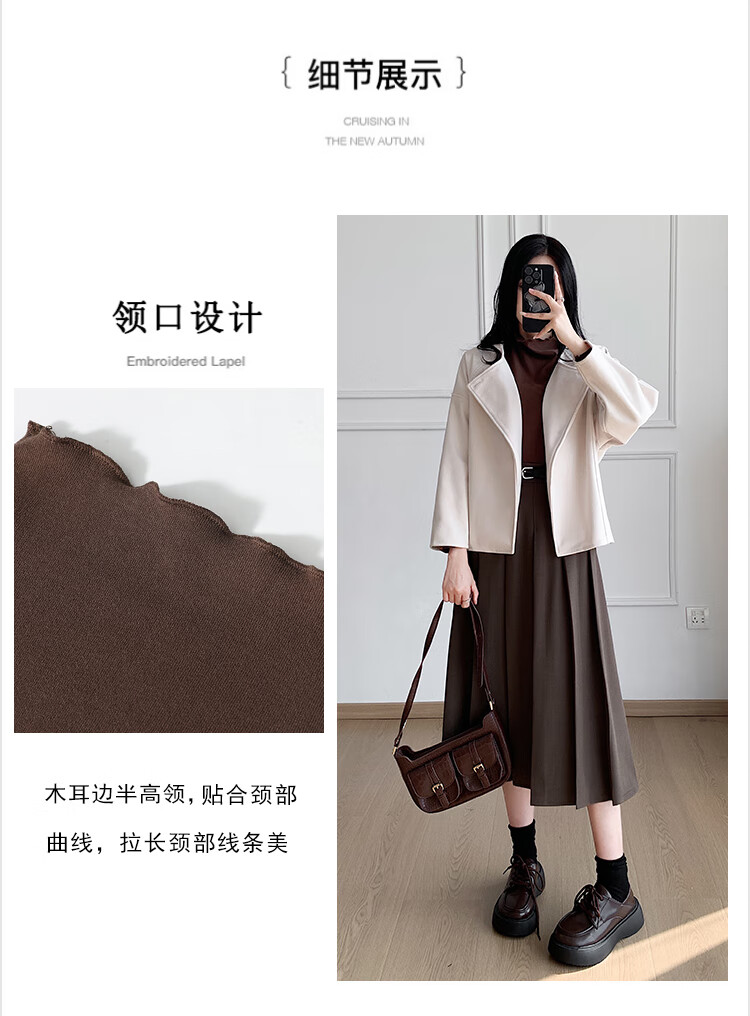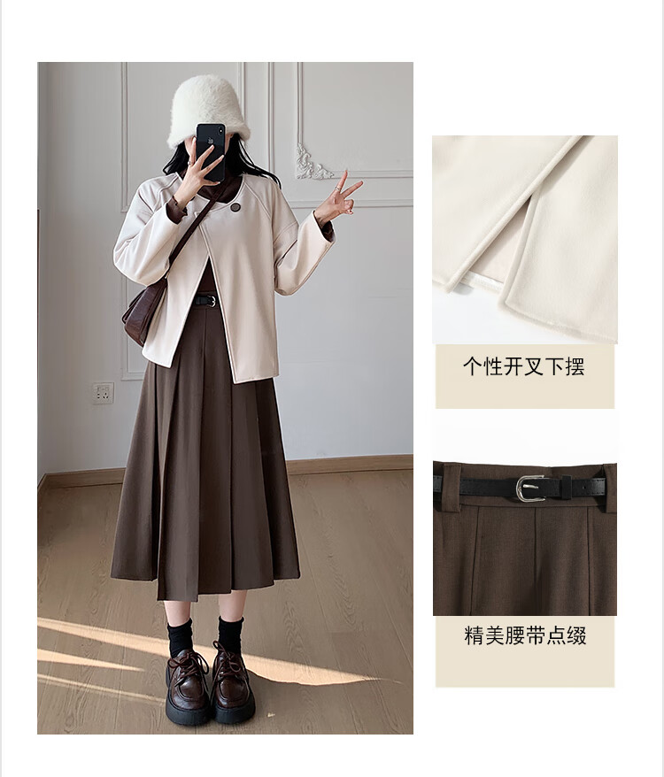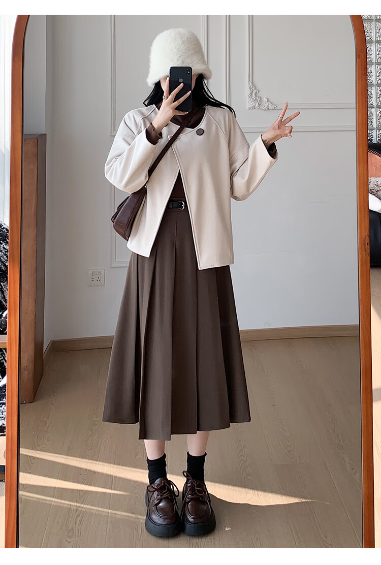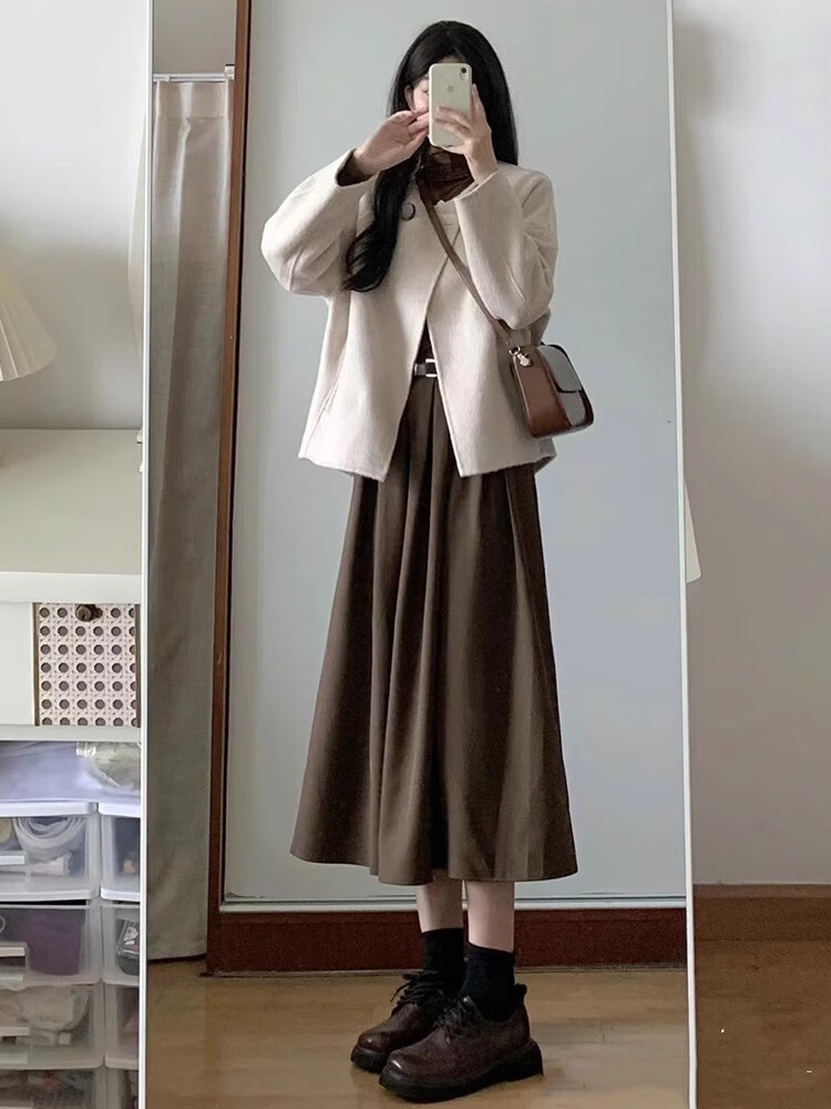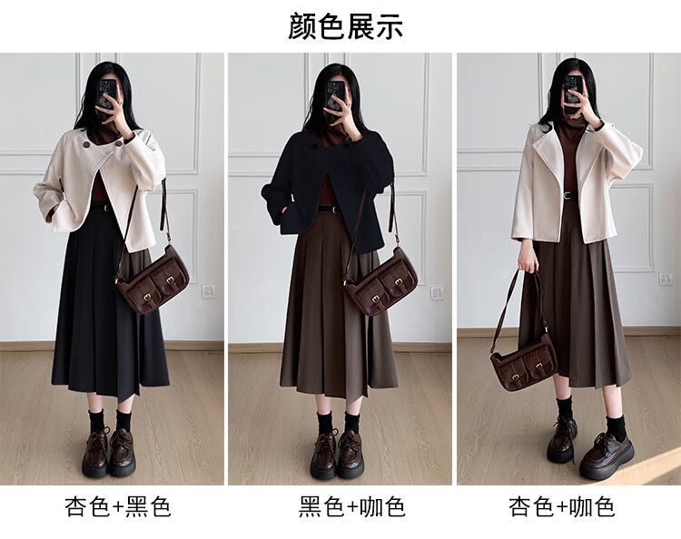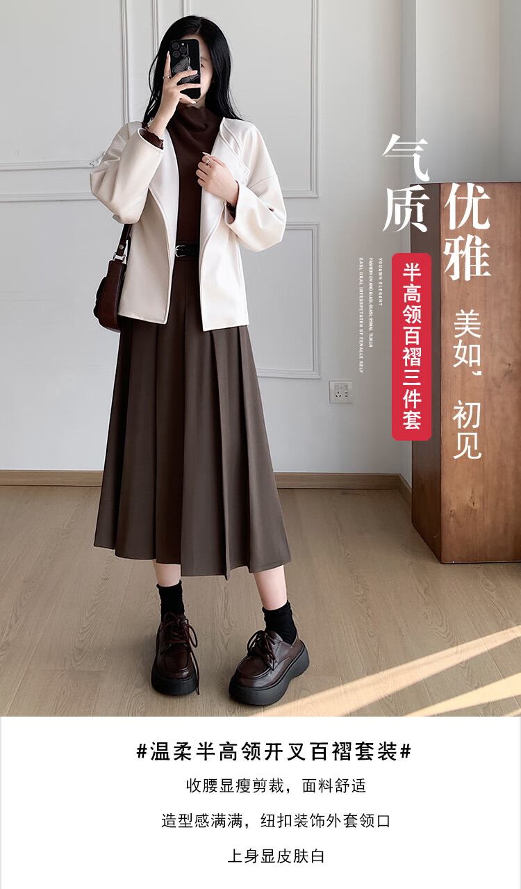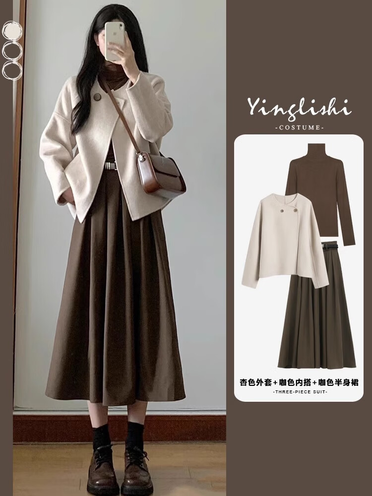 雪妃蓝琪秋季连衣裙2025新款秋冬搭配一整套盐系高级感小香风穿搭套装裙子 杏色外套+咖色内搭+咖色裙子 L 【建议110-125斤】