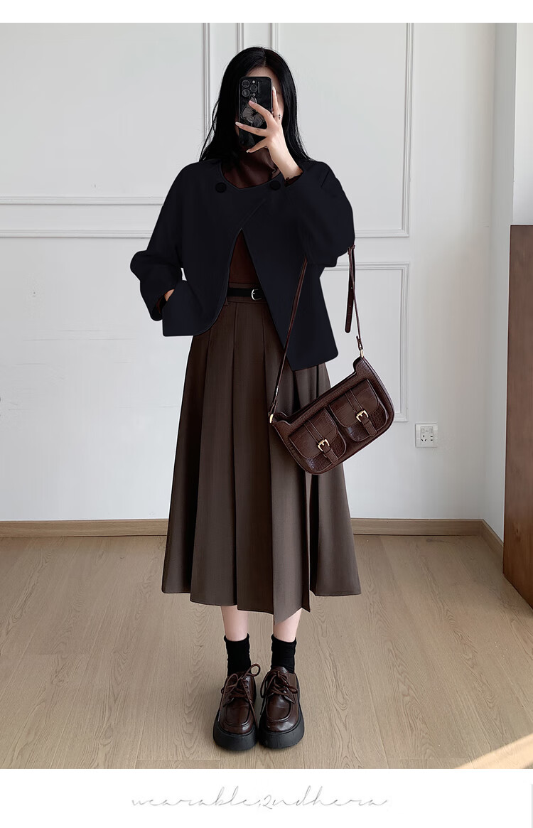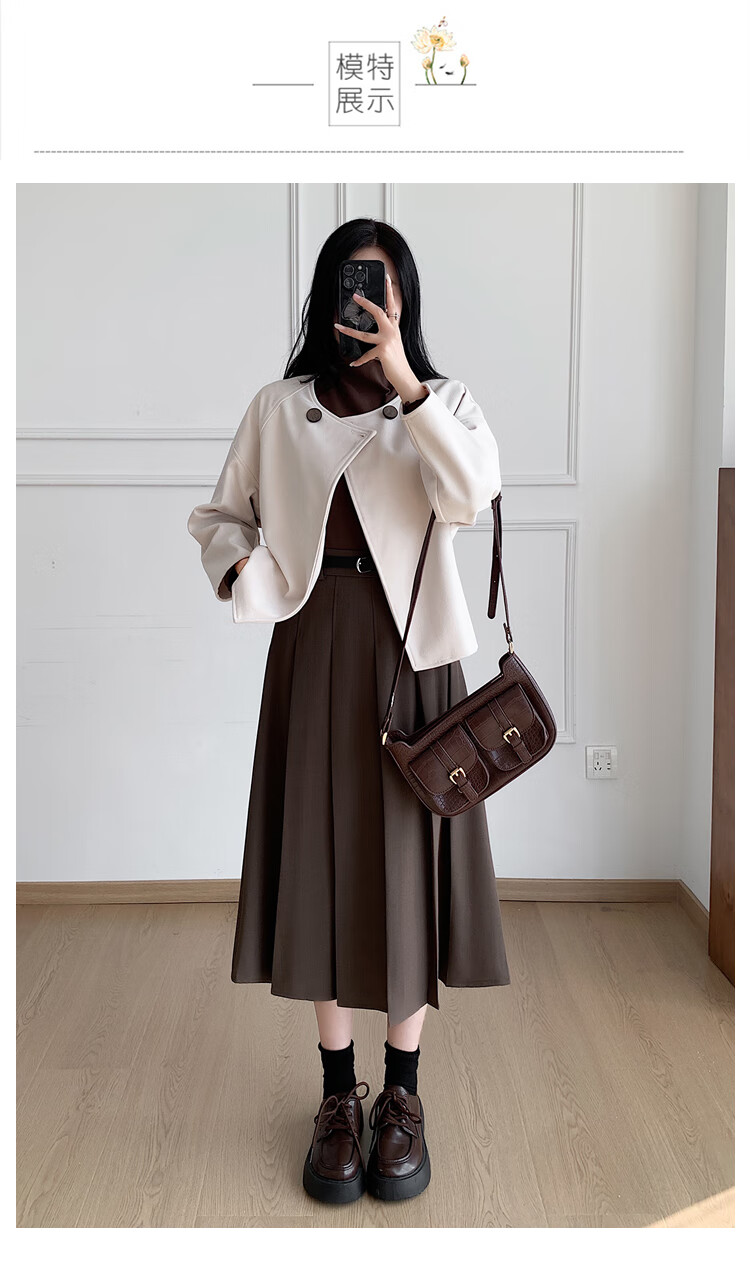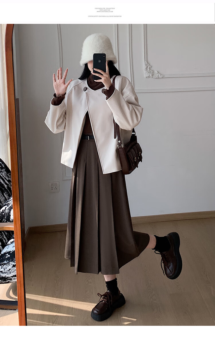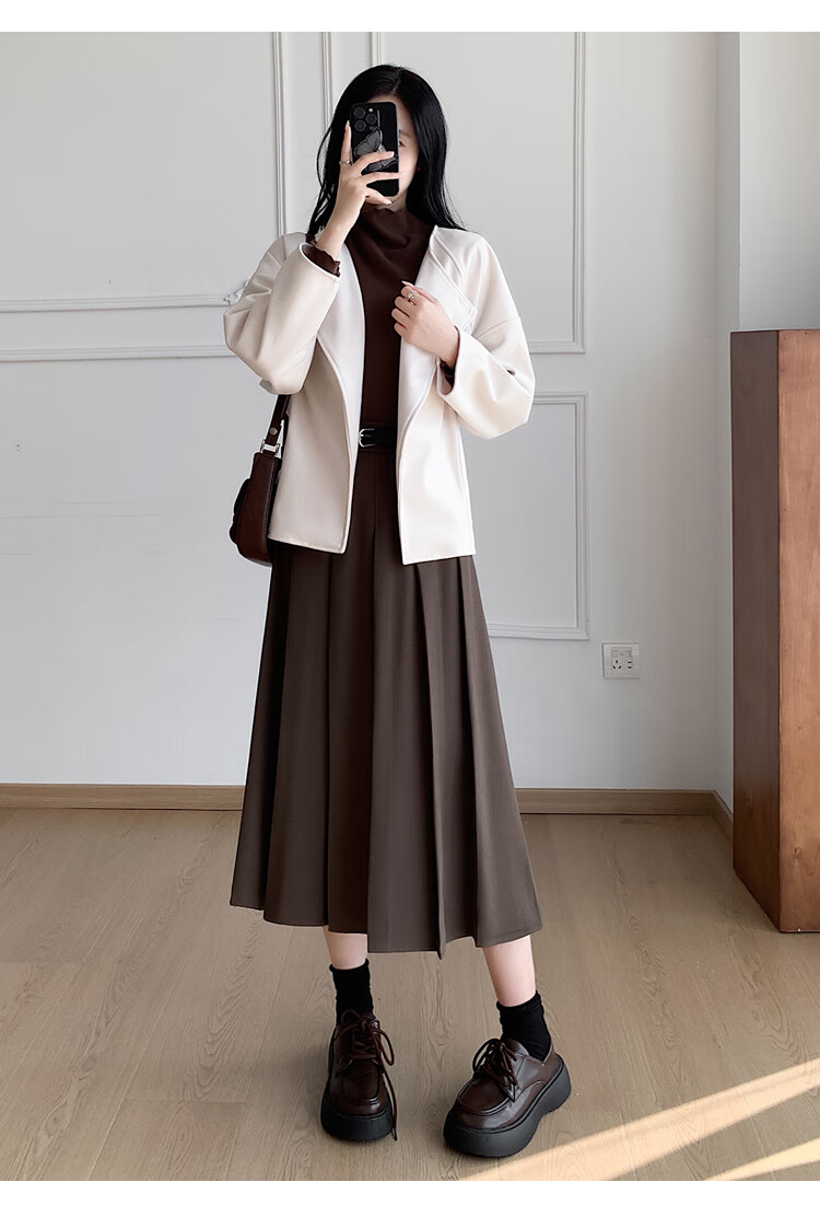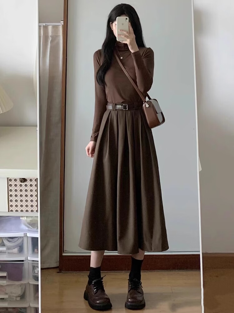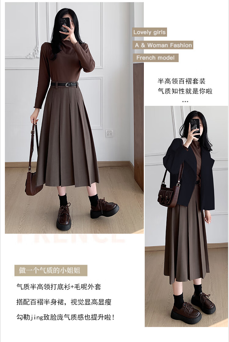 雪妃蓝琪秋季连衣裙2025新款秋冬搭配一整套盐系高级感小香风穿搭套装裙子 杏色外套+咖色内搭+咖色裙子 L 【建议110-125斤】