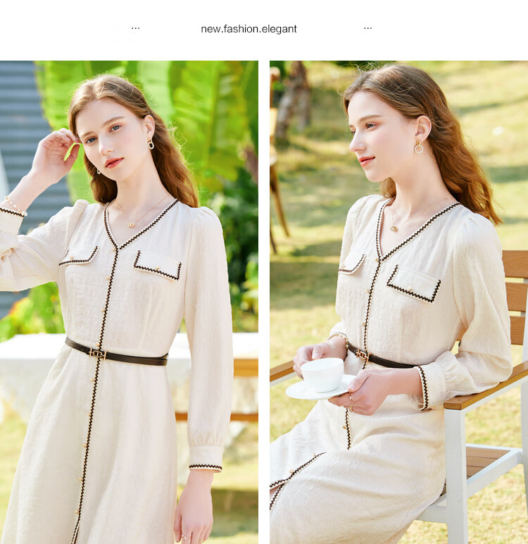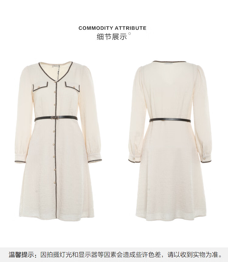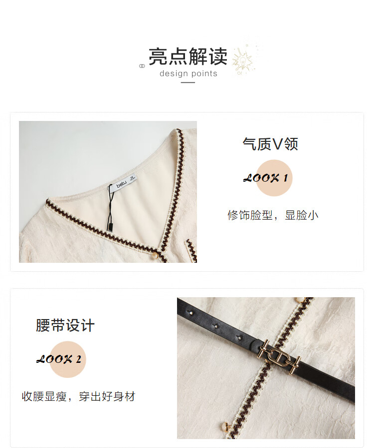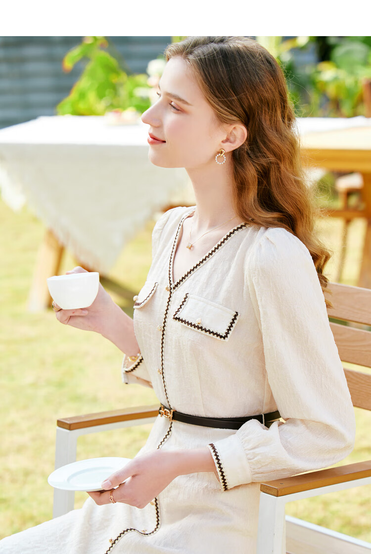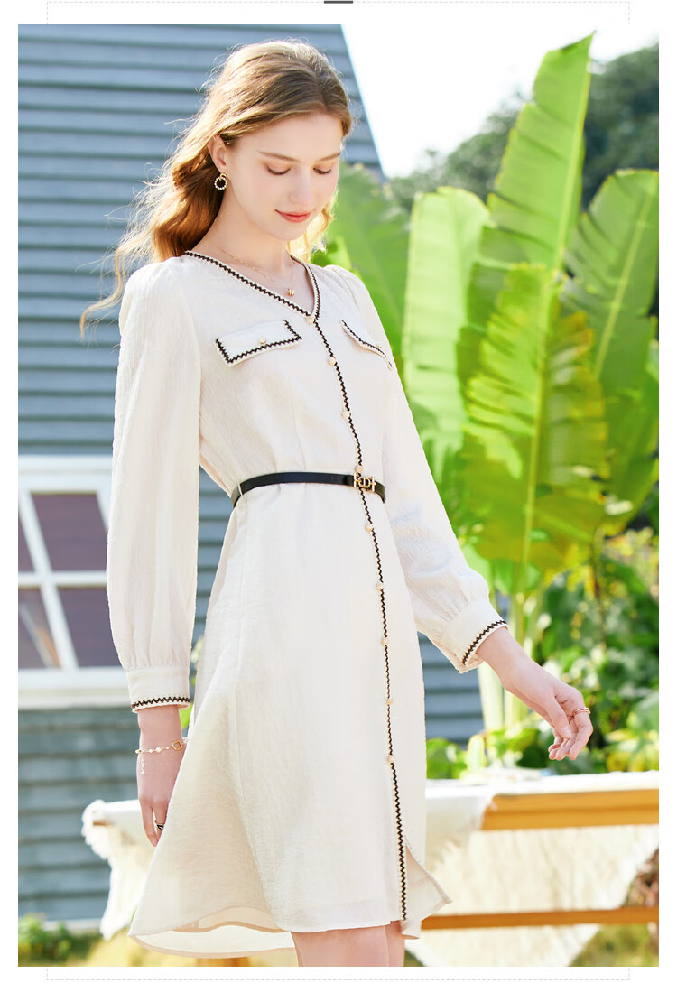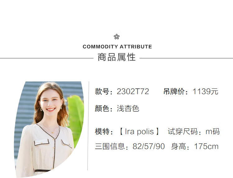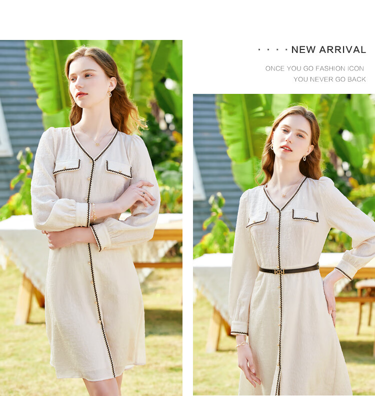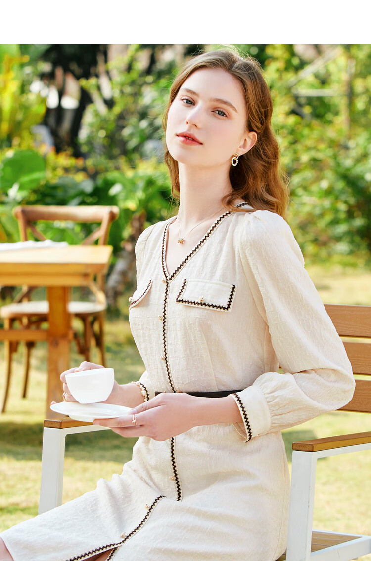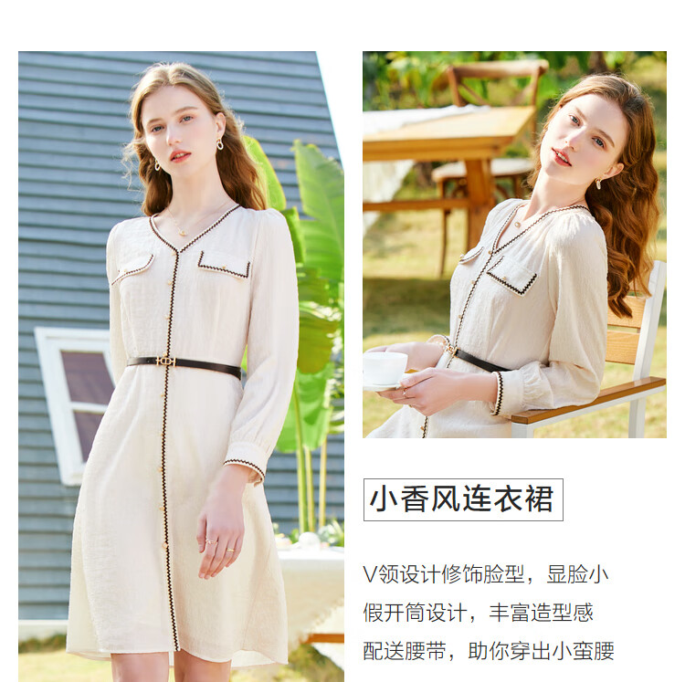 百图betu女装春夏新款连衣裙小香风长袖V领假开筒连衣裙女2302T72 浅杏色 L