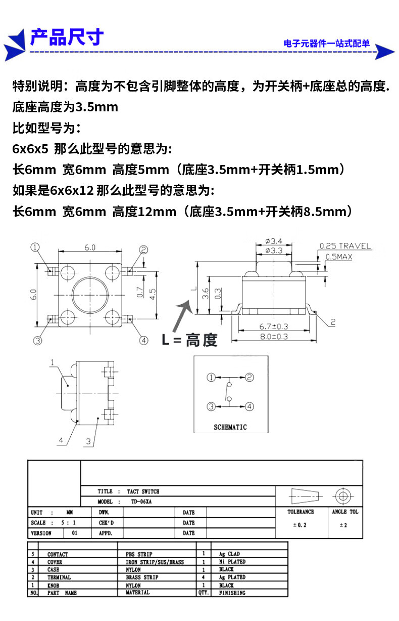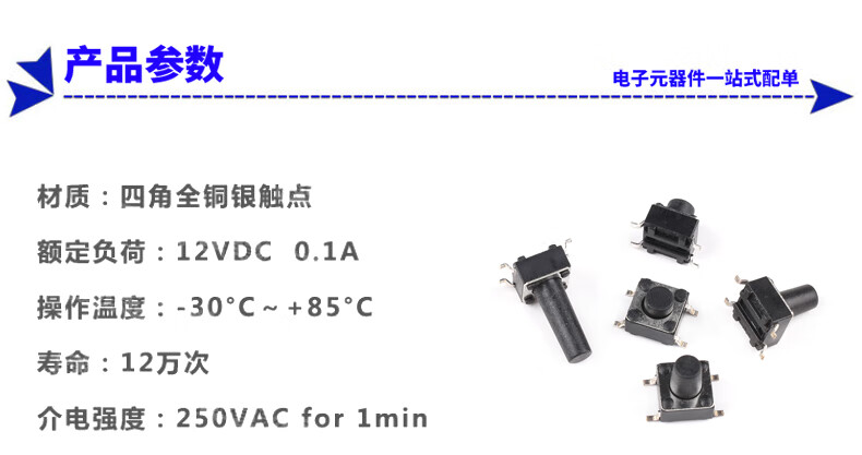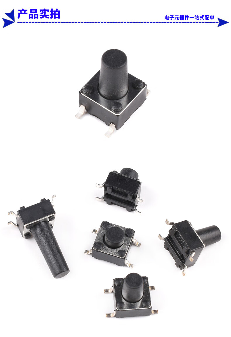 泽杰 轻触开关6*6*5/6/8/9/13mm微动按键按钮4脚立式贴片耐高温 6mm(20只)