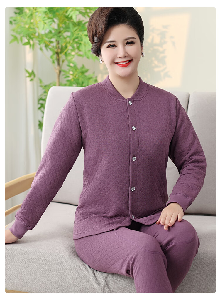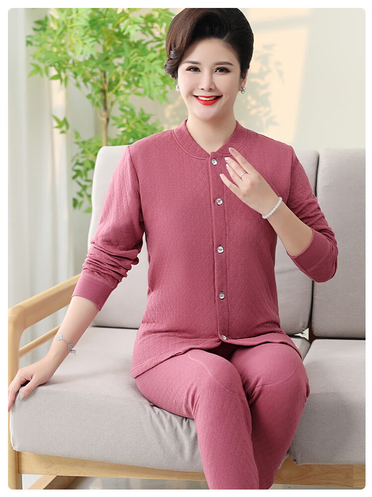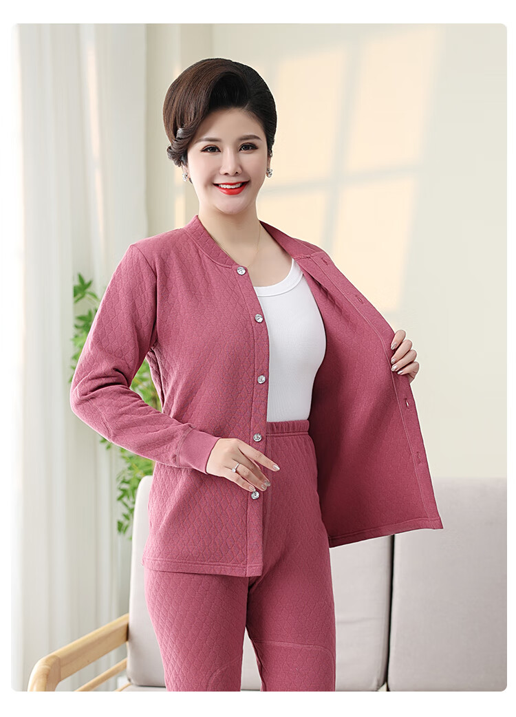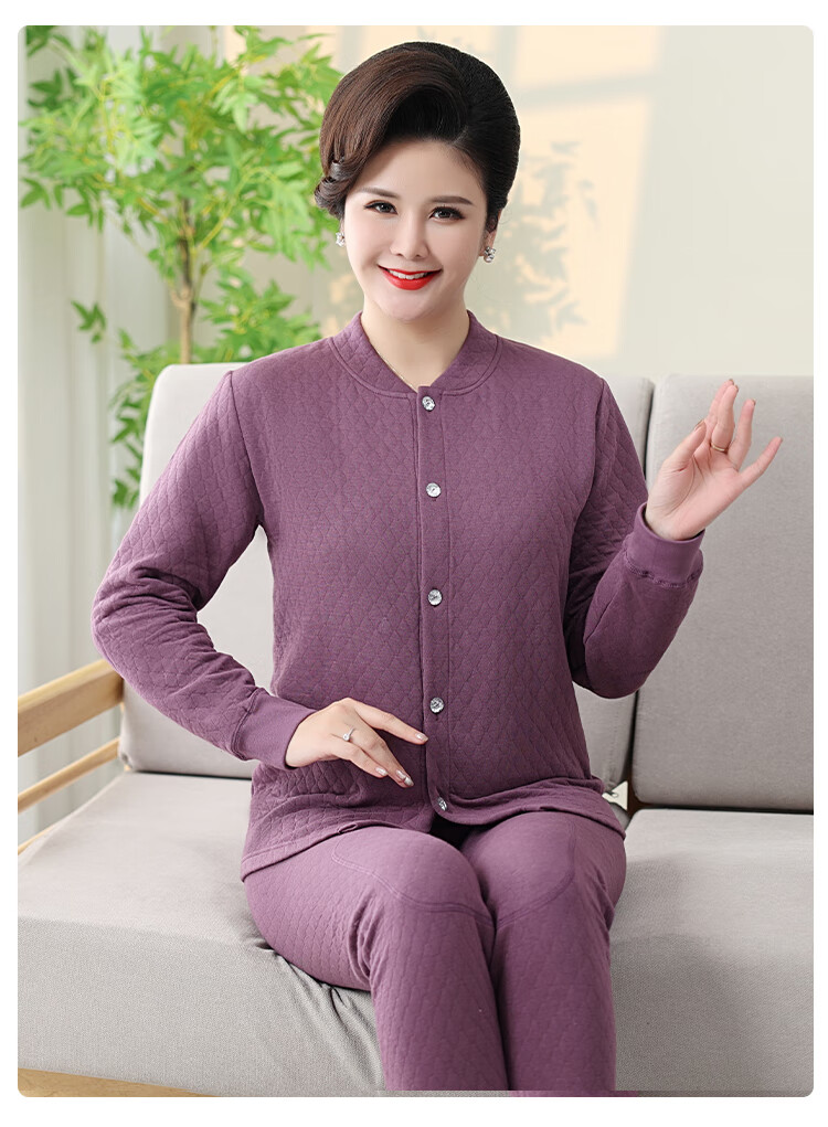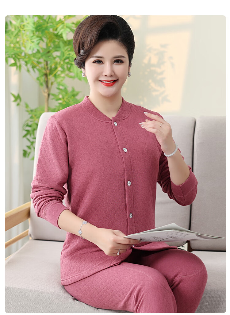宜而爽中老年保暖内衣秋冬季女士三层夹棉加厚开衫套装送妈妈