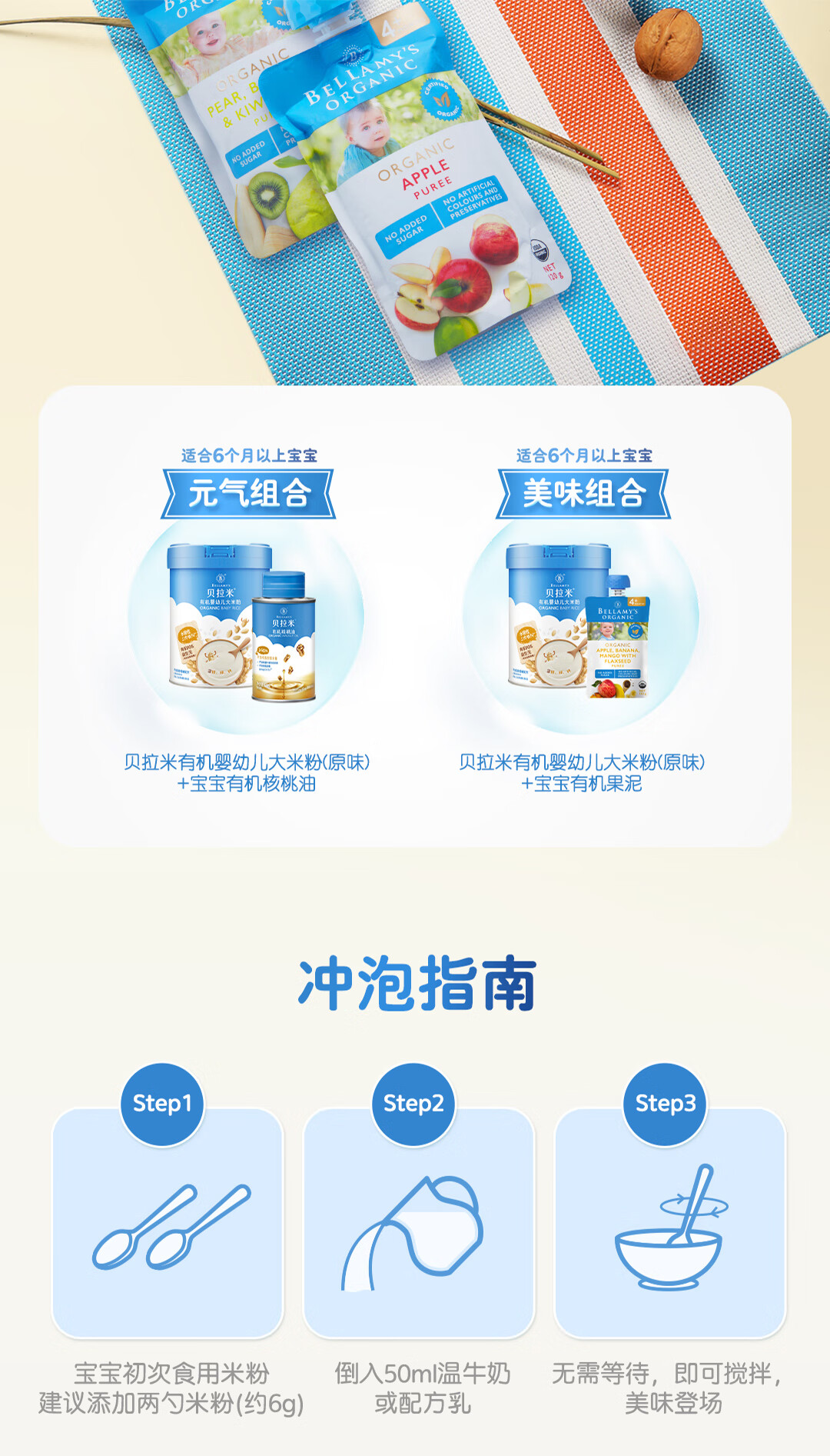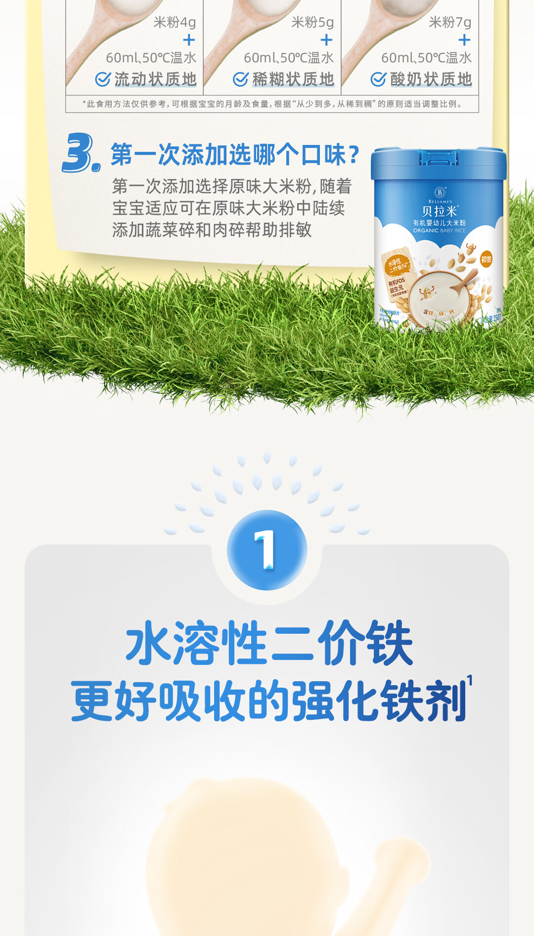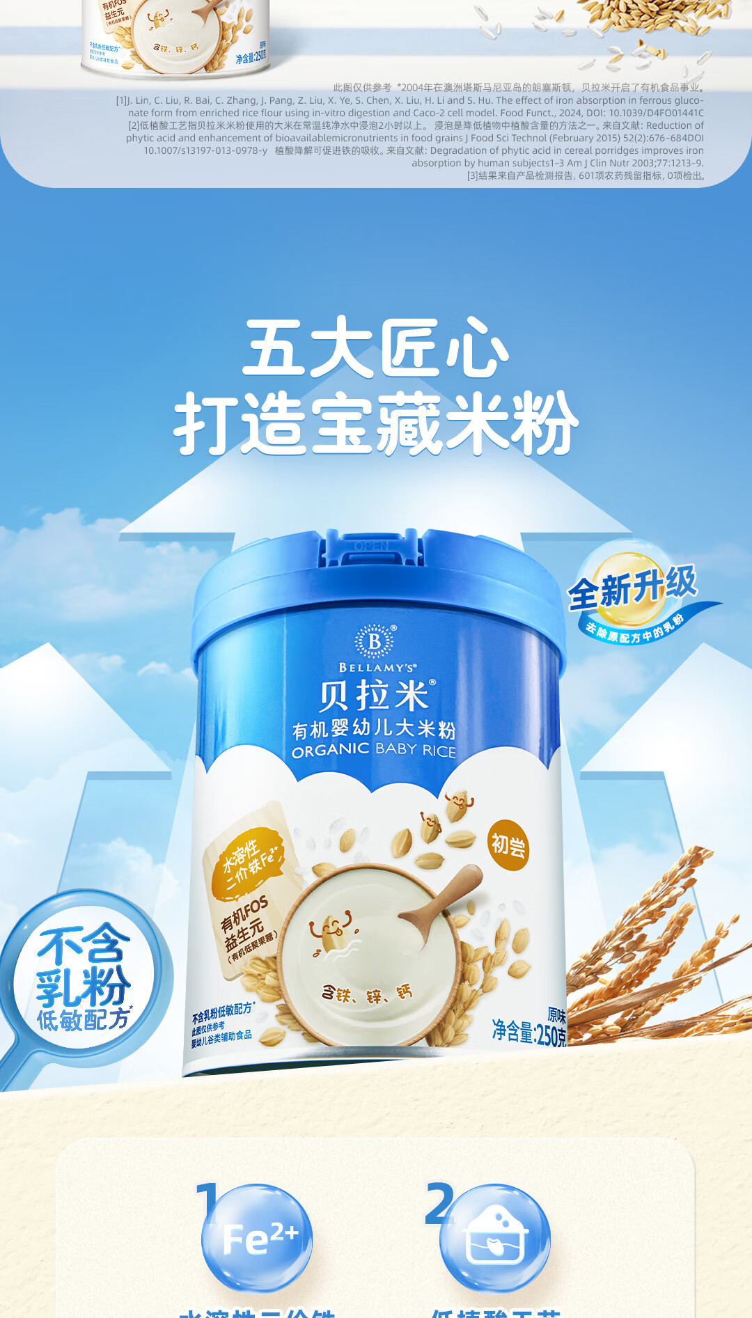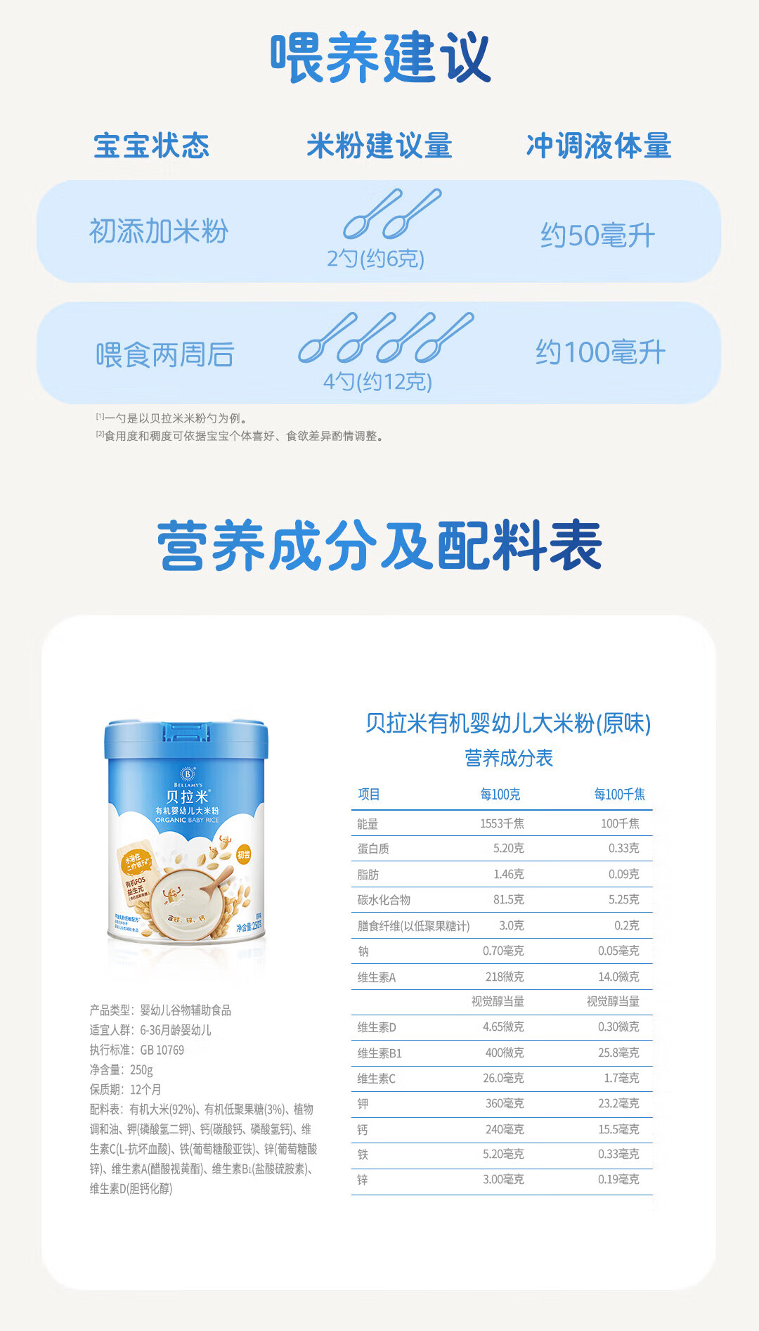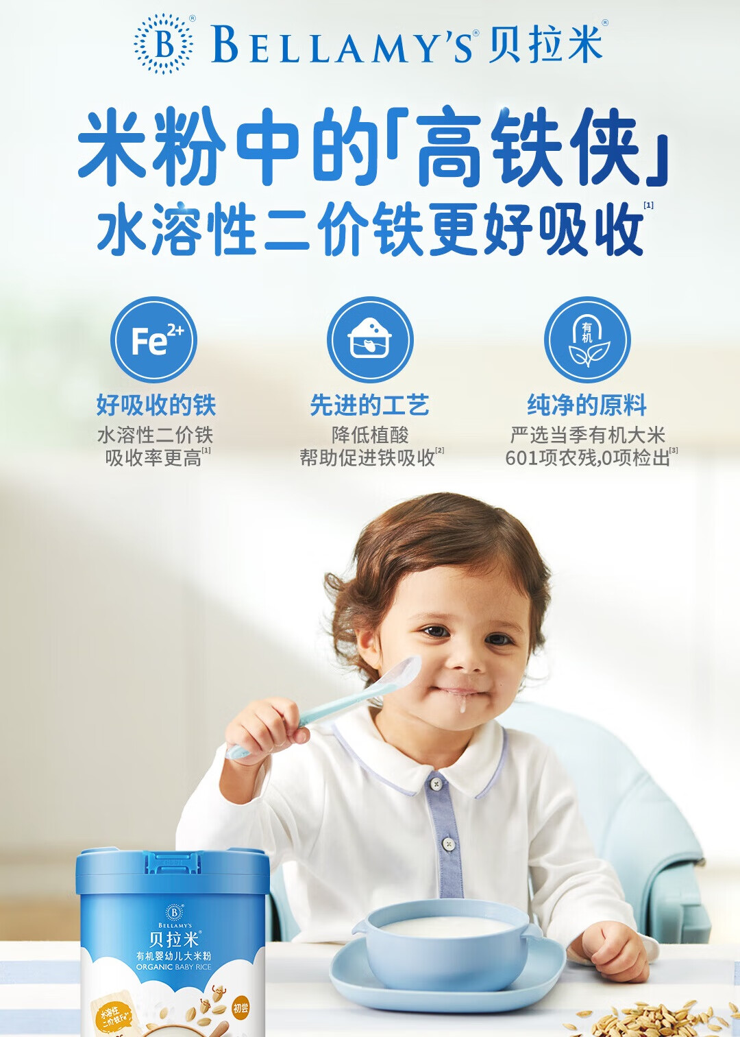贝拉米(Bellamy's)婴幼儿高铁有机低敏无乳粉米糊原味250g 水溶性二价铁6月+
