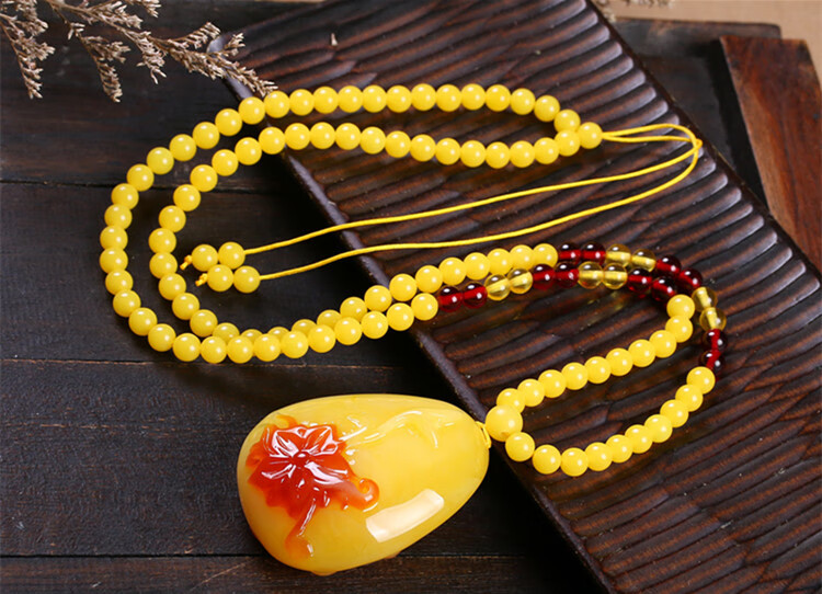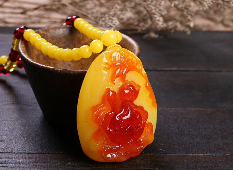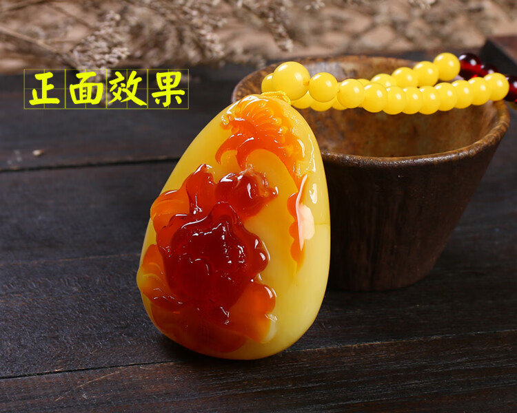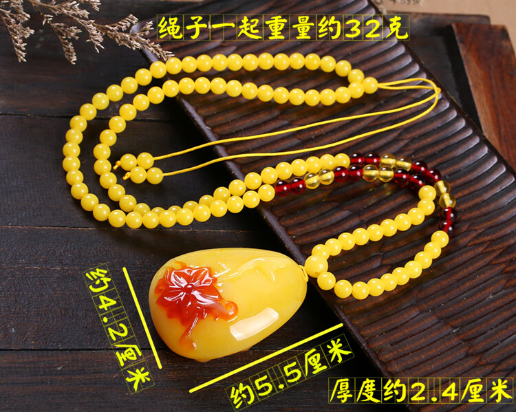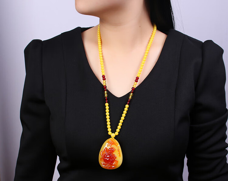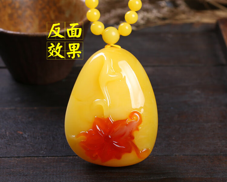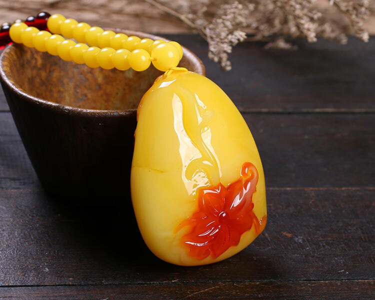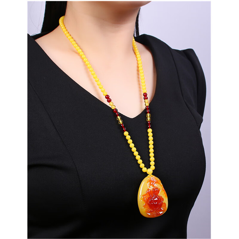 碧秀堂鸡油黄老蜜蜡原石带皮双面雕刻花朵吊坠琥珀水滴形挂件项链女毛衣