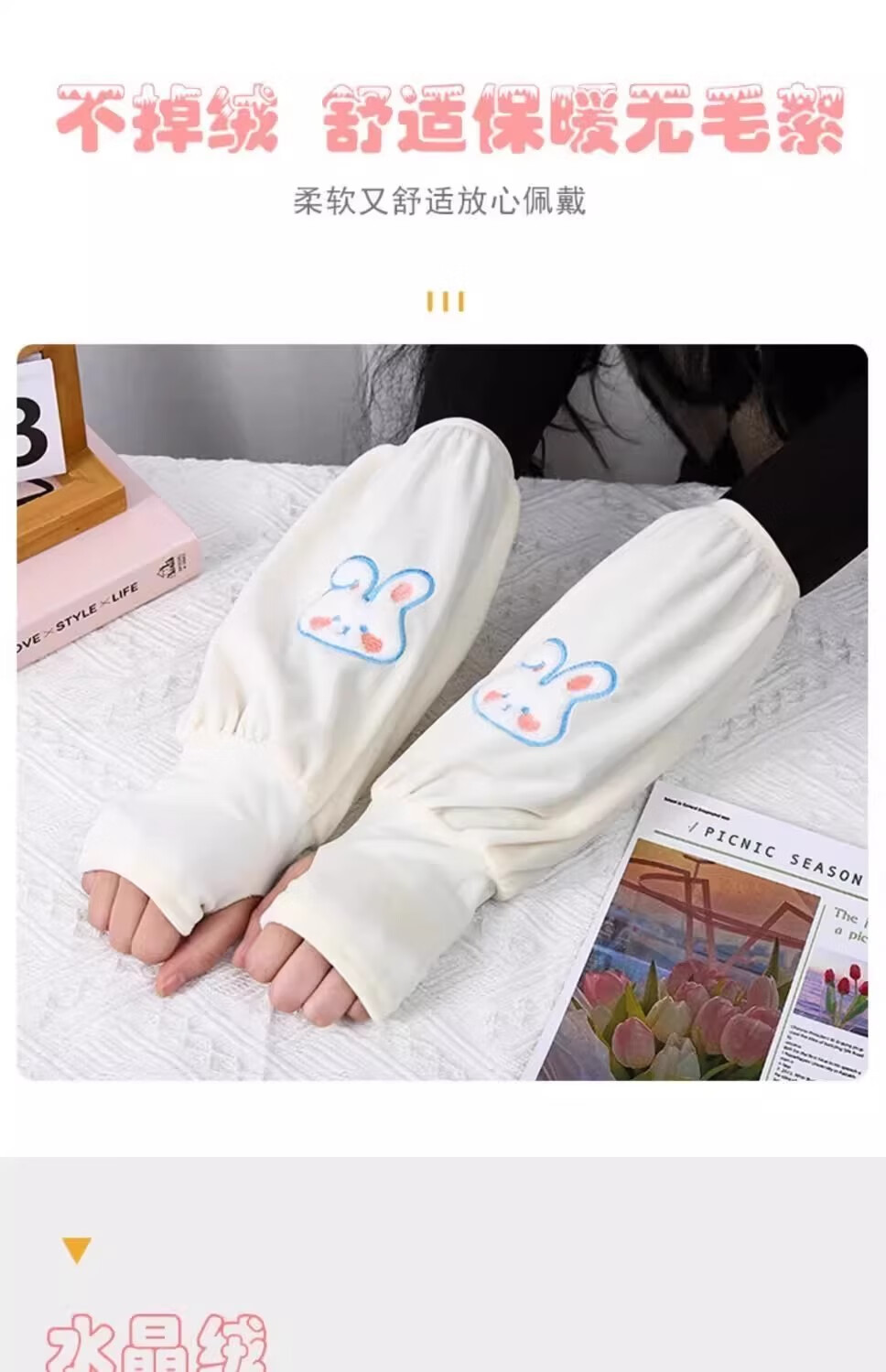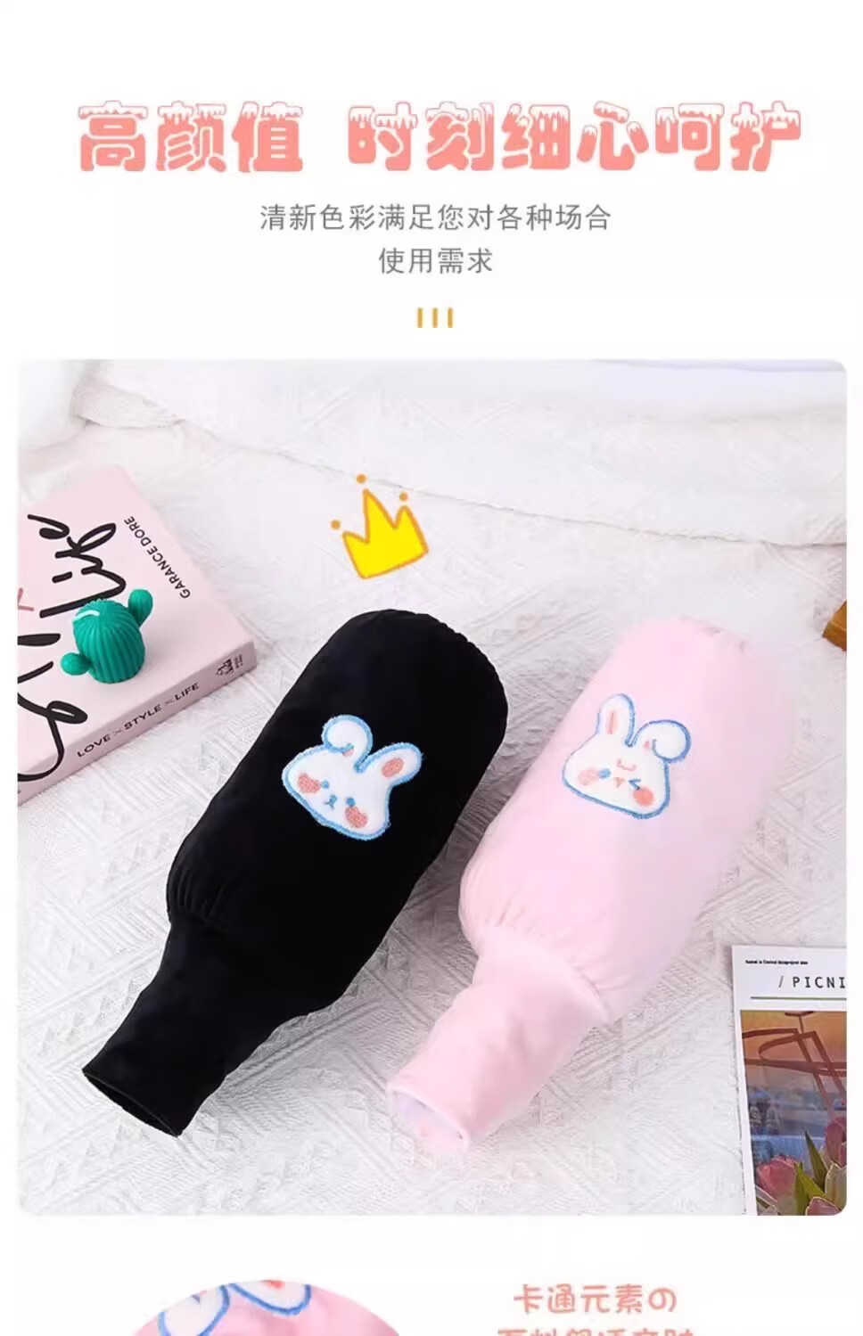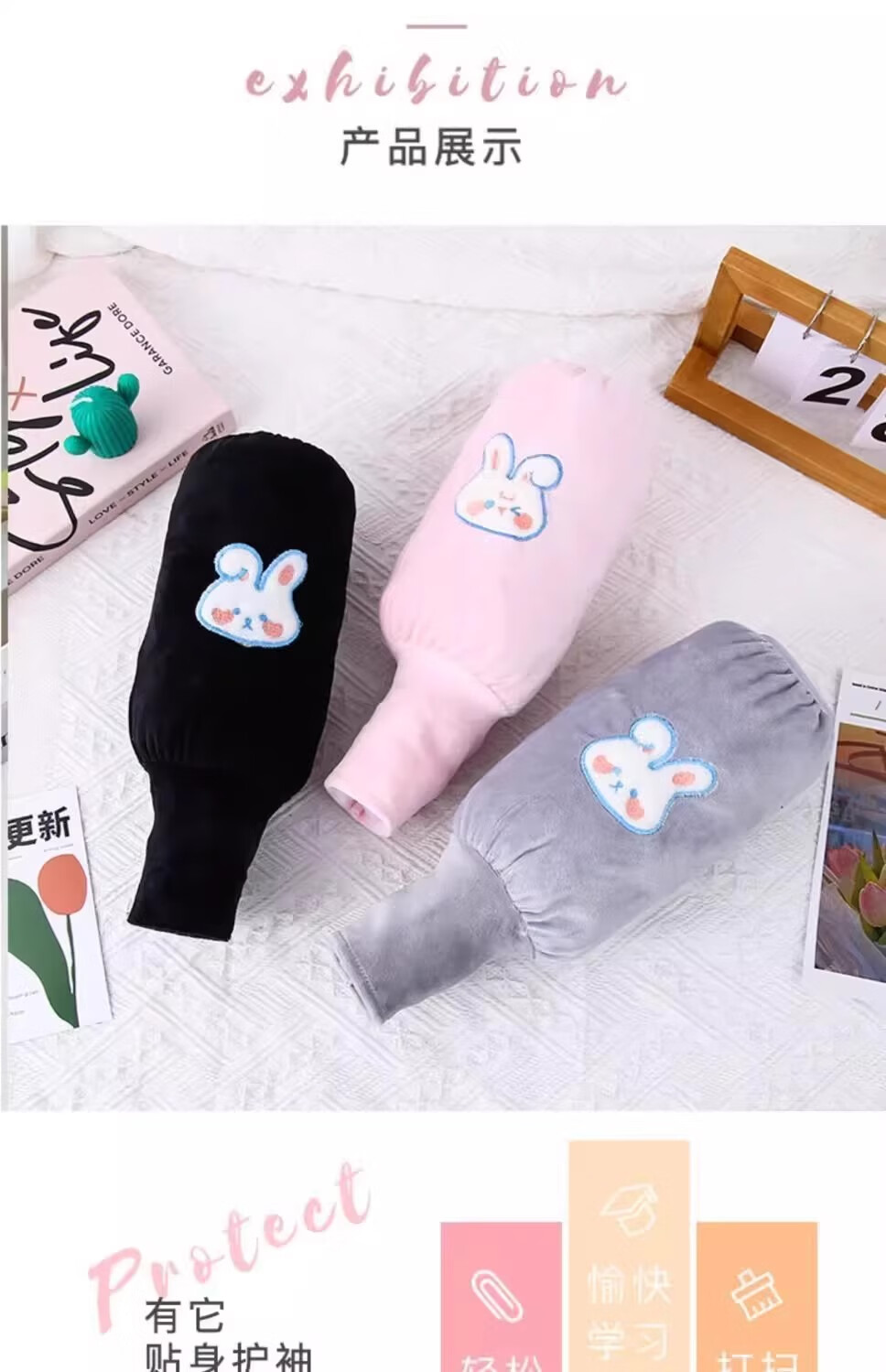 可爱兔子二合一袖套手套儿童成人防脏保暖学生写字护袖防污护袖套 两双装【米色+灰色】加厚保暖
