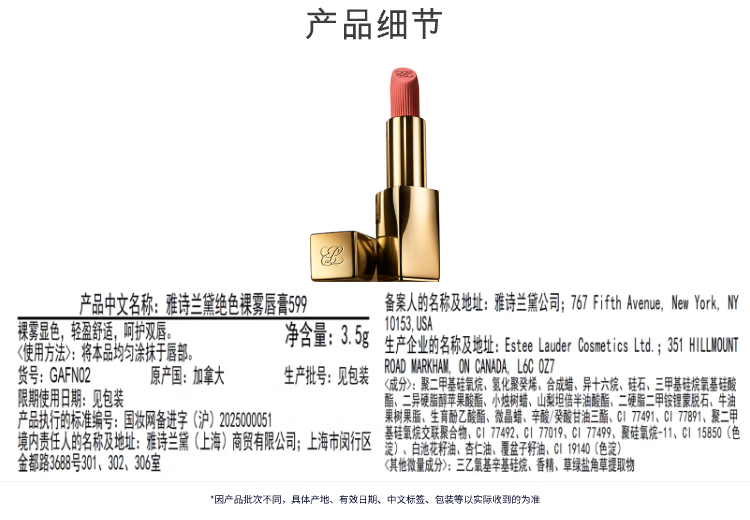 雅诗兰黛丝雾小金管唇膏599#无声奶杏色口红礼盒化妆品套装生日礼物送女友