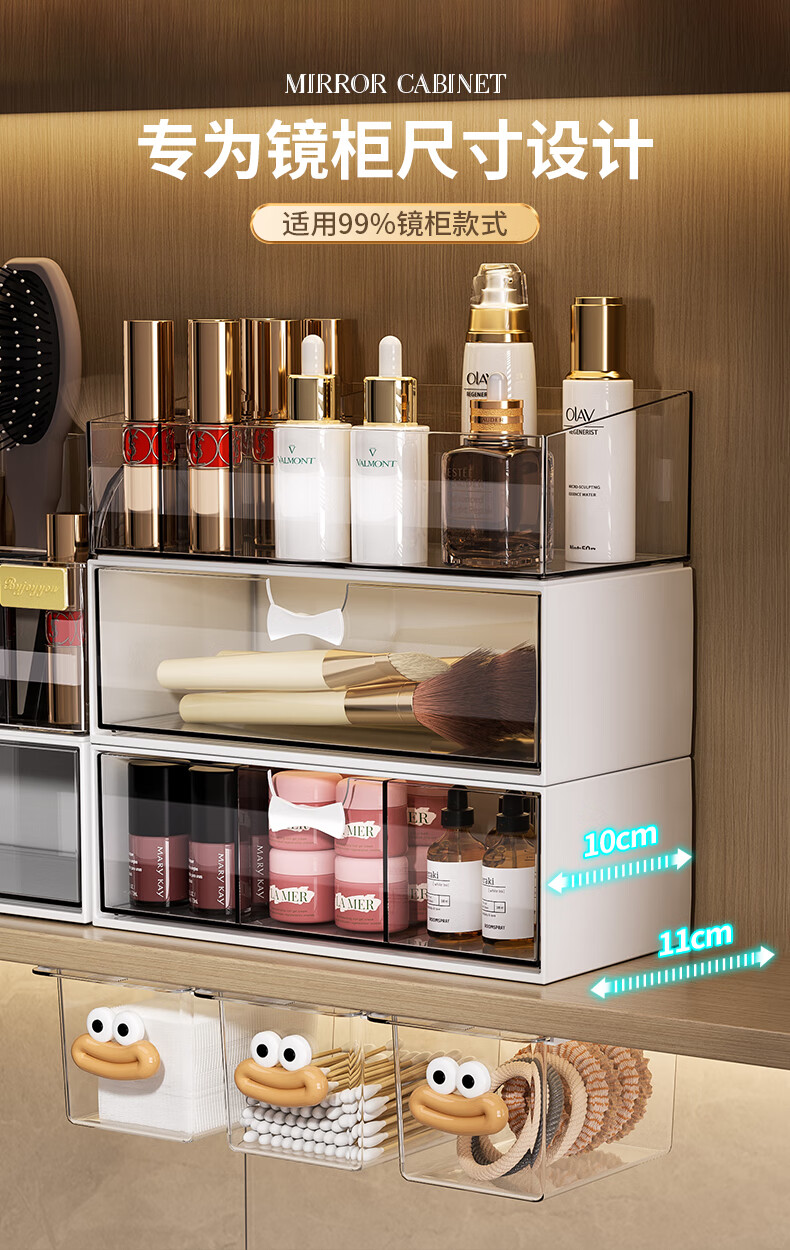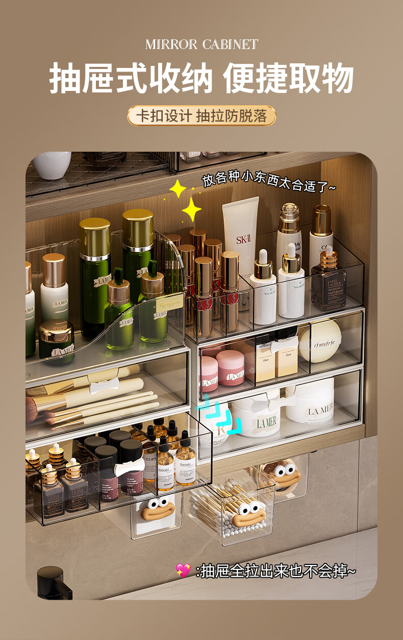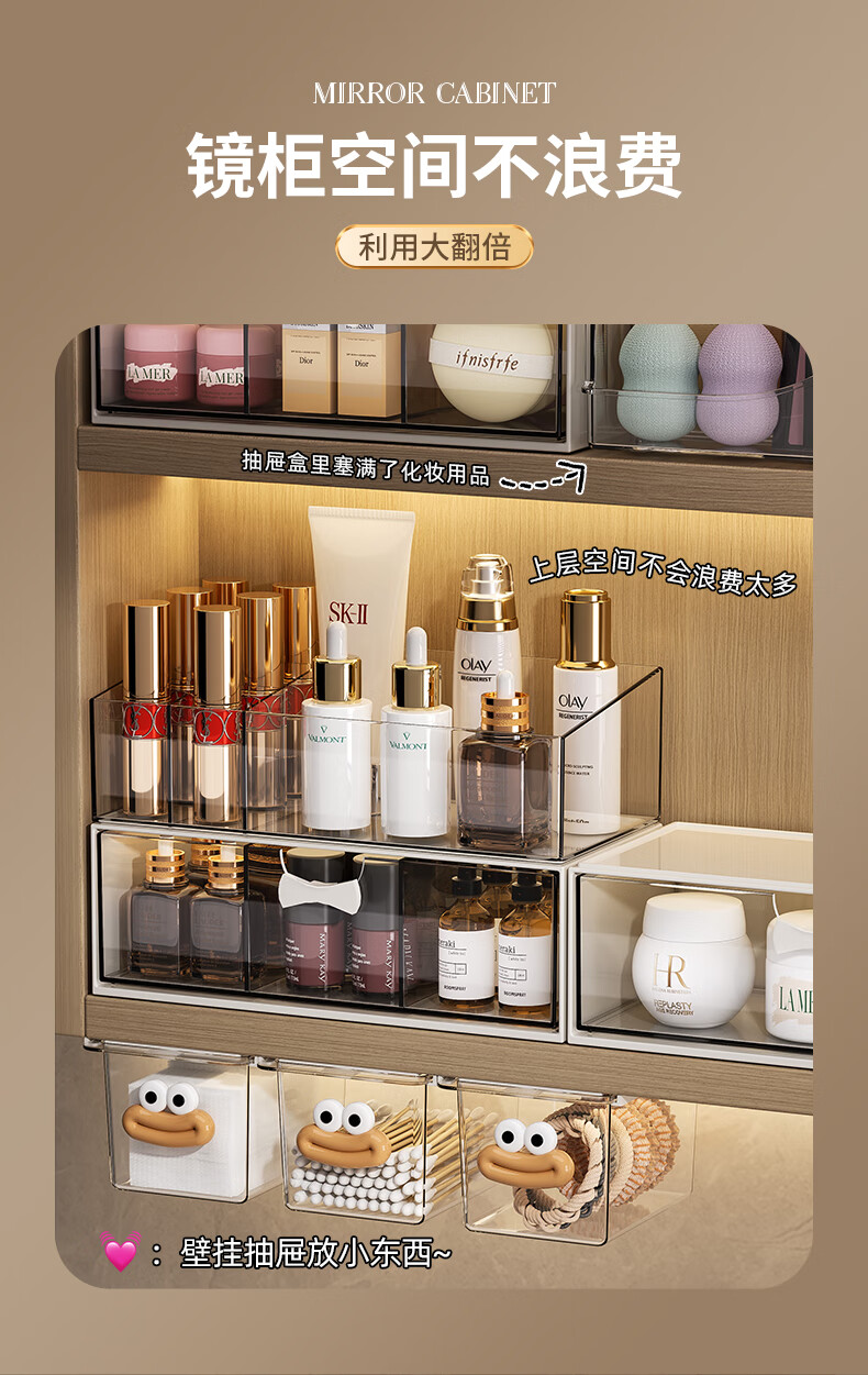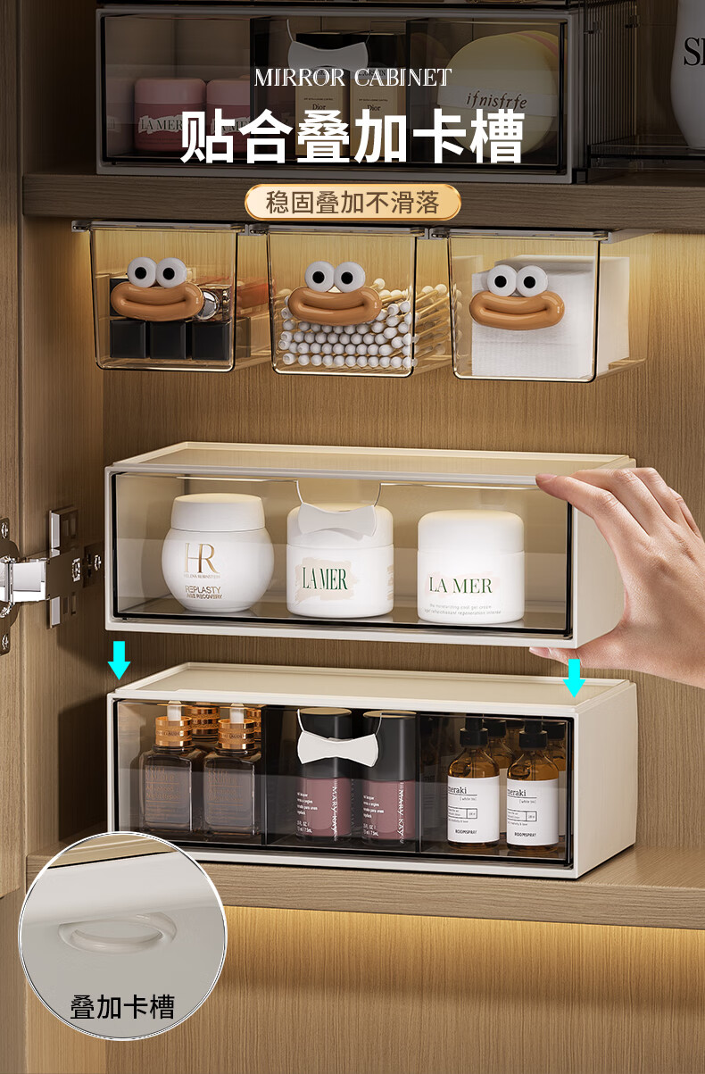 KAMAN镜柜收纳盒抽屉式化妆品置物架卫生间口红化妆刷整理盒壁挂棉签盒 三件套【顶盒+单格+三格】