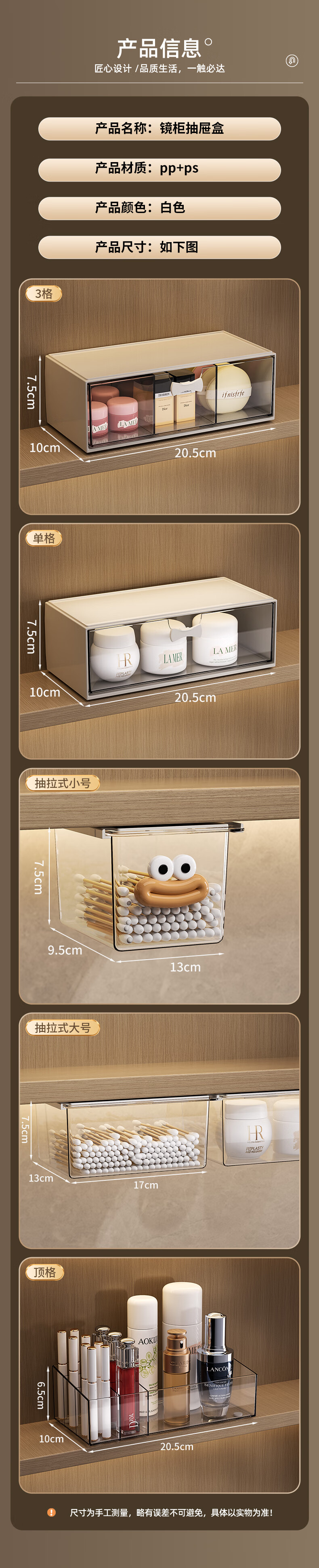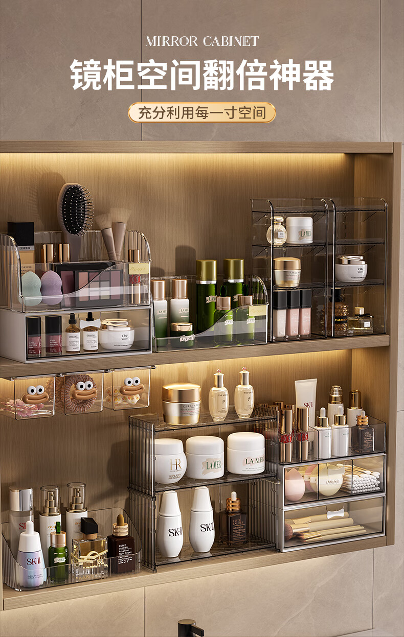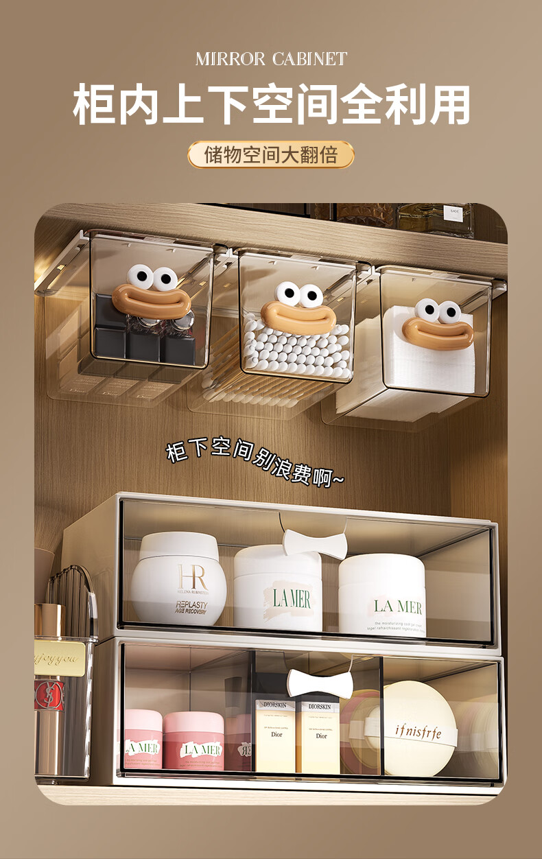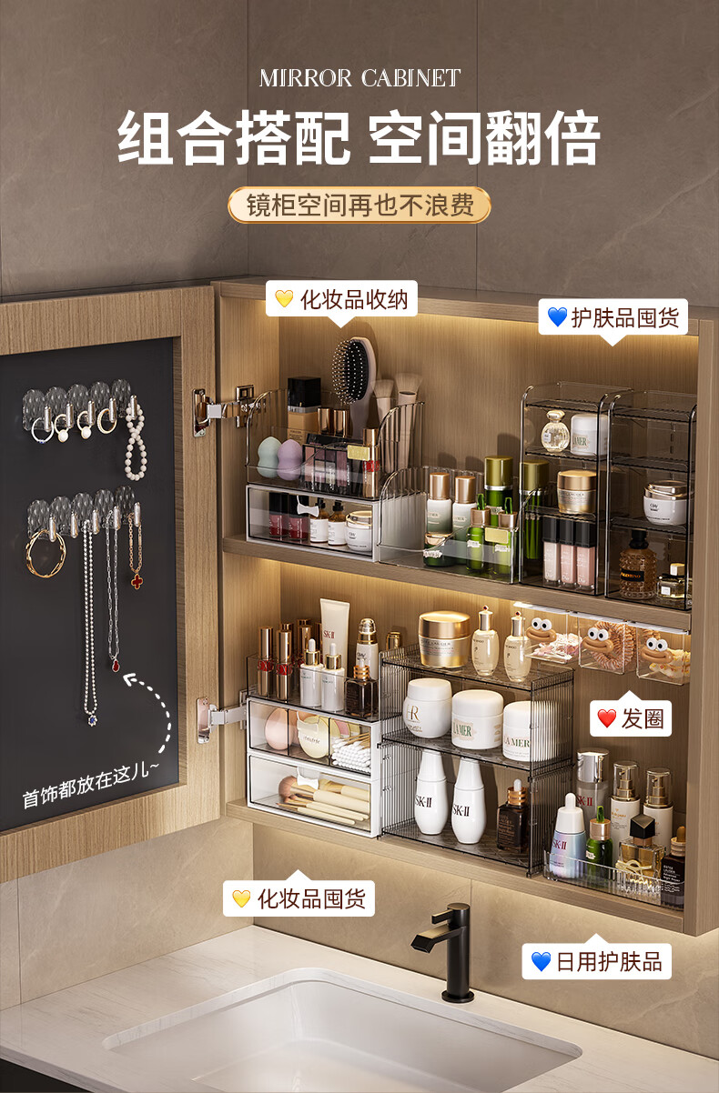 KAMAN镜柜收纳盒抽屉式化妆品置物架卫生间口红化妆刷整理盒壁挂棉签盒 三件套【顶盒+单格+三格】