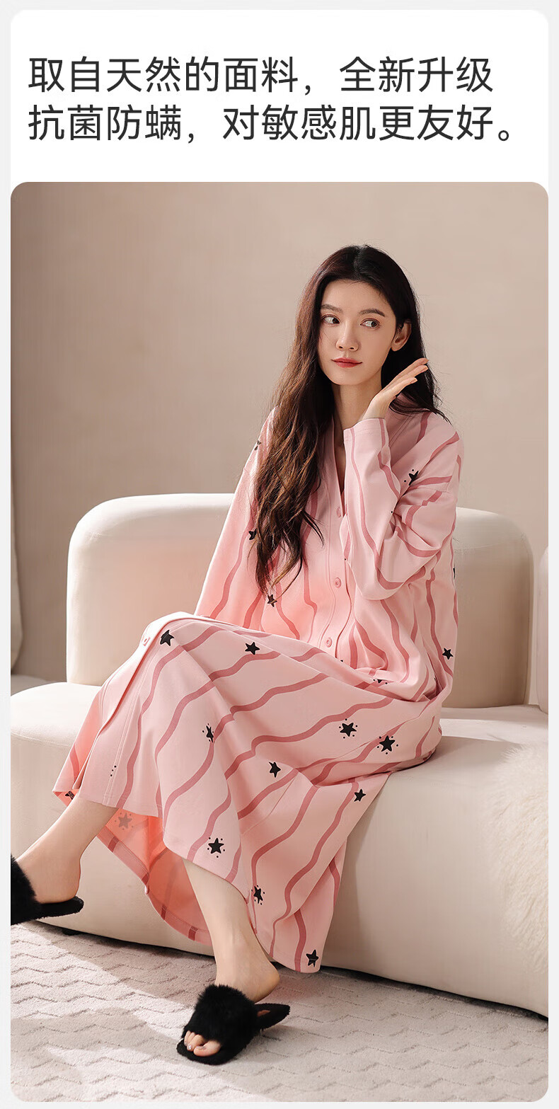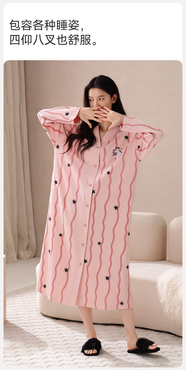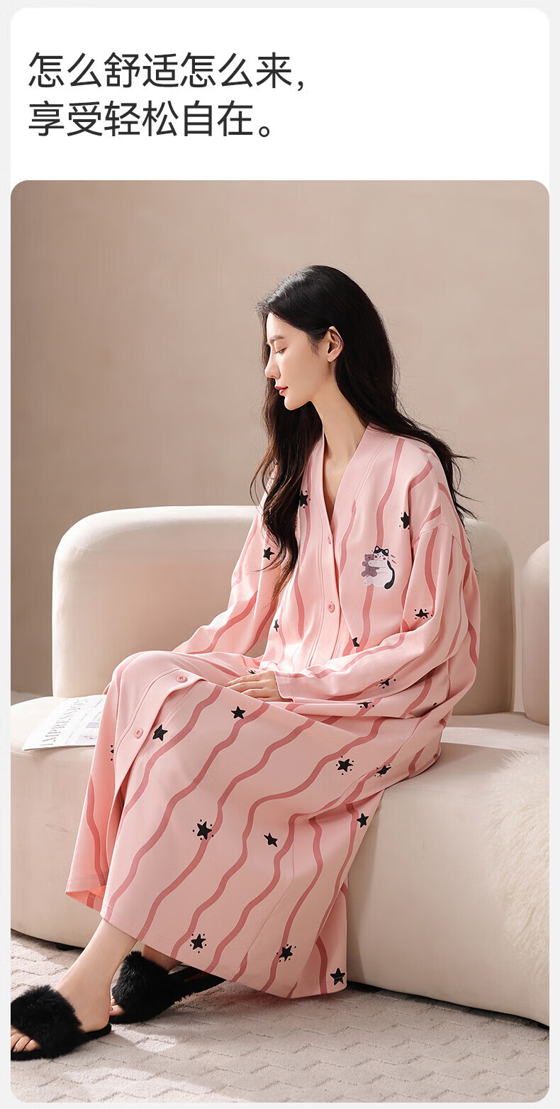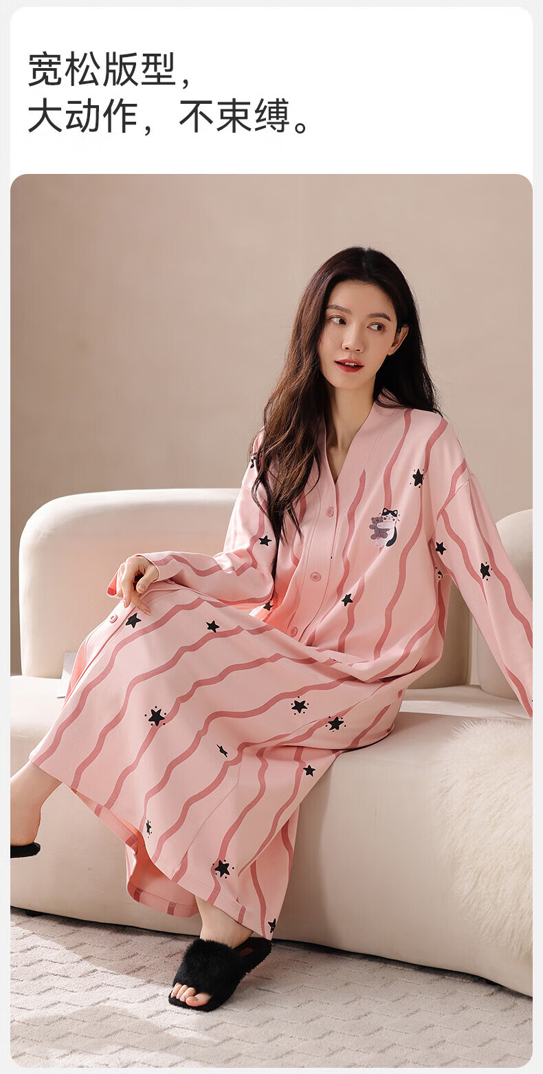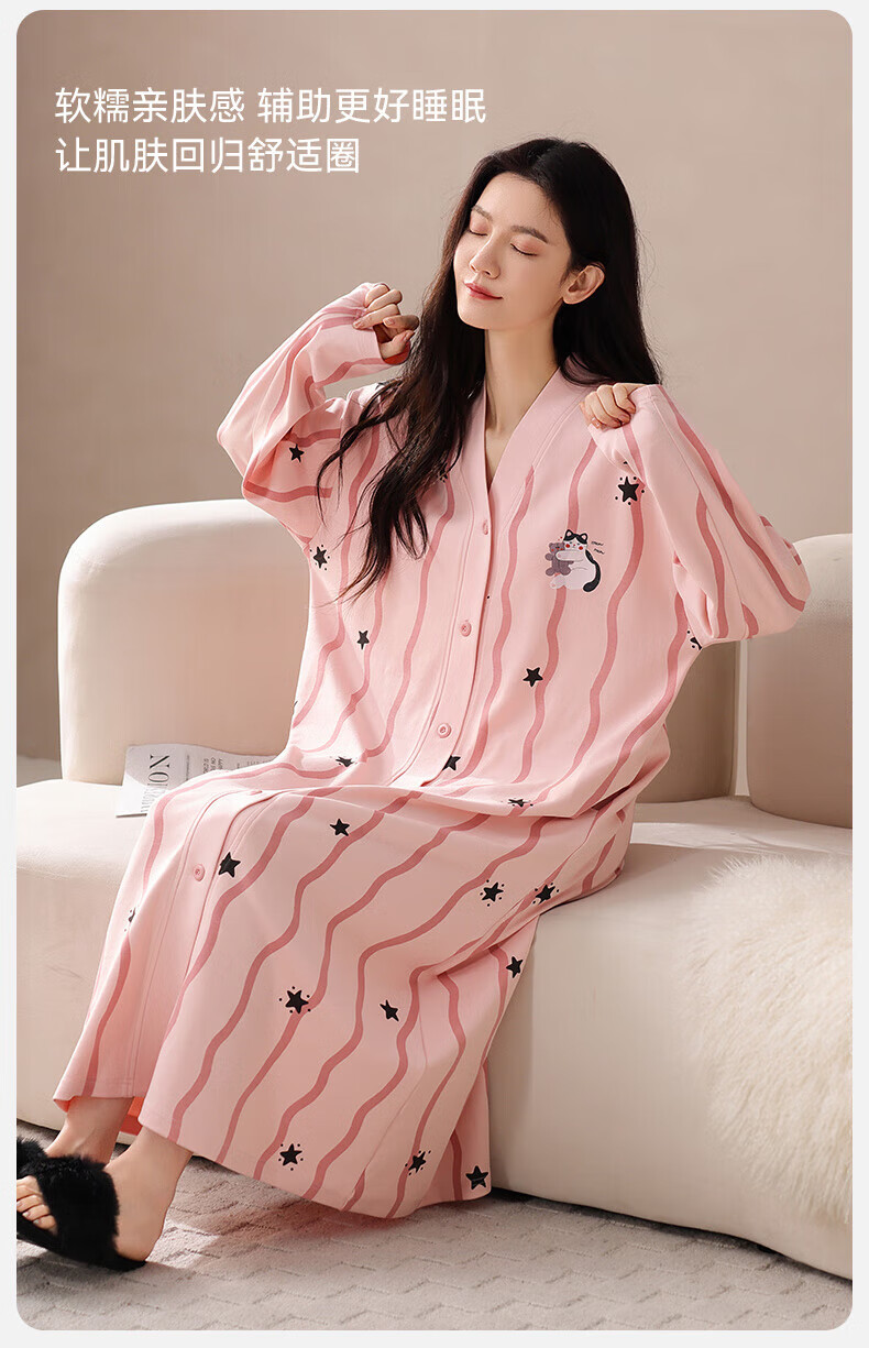 猫人(MiiOW)纯棉睡裙女秋冬季长袖睡衣女大码待产裙连衣裙开衫家居服可外穿 桃粉小猫 【舒适纯棉 柔软亲肤】 L 【建议100-120斤】