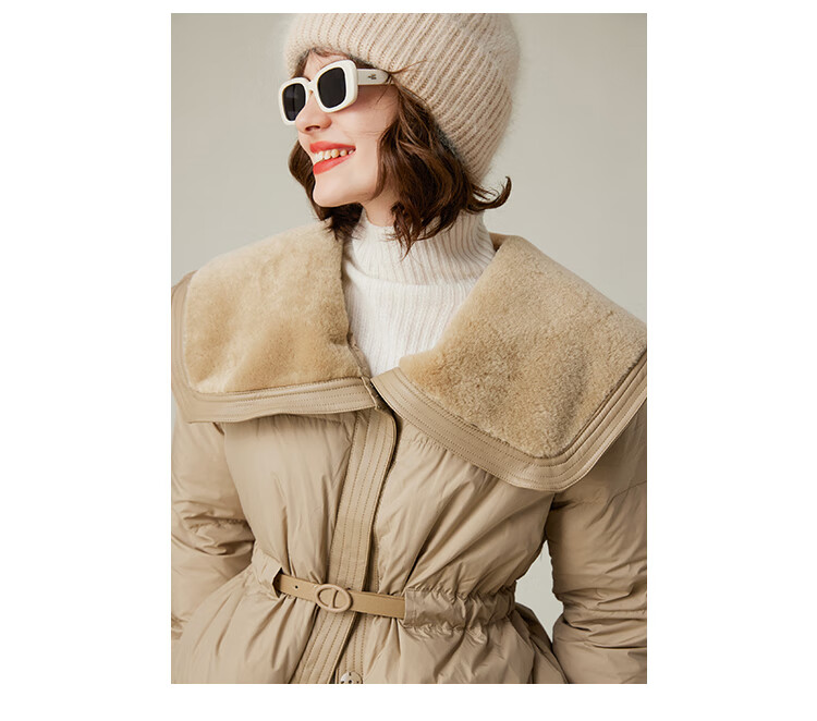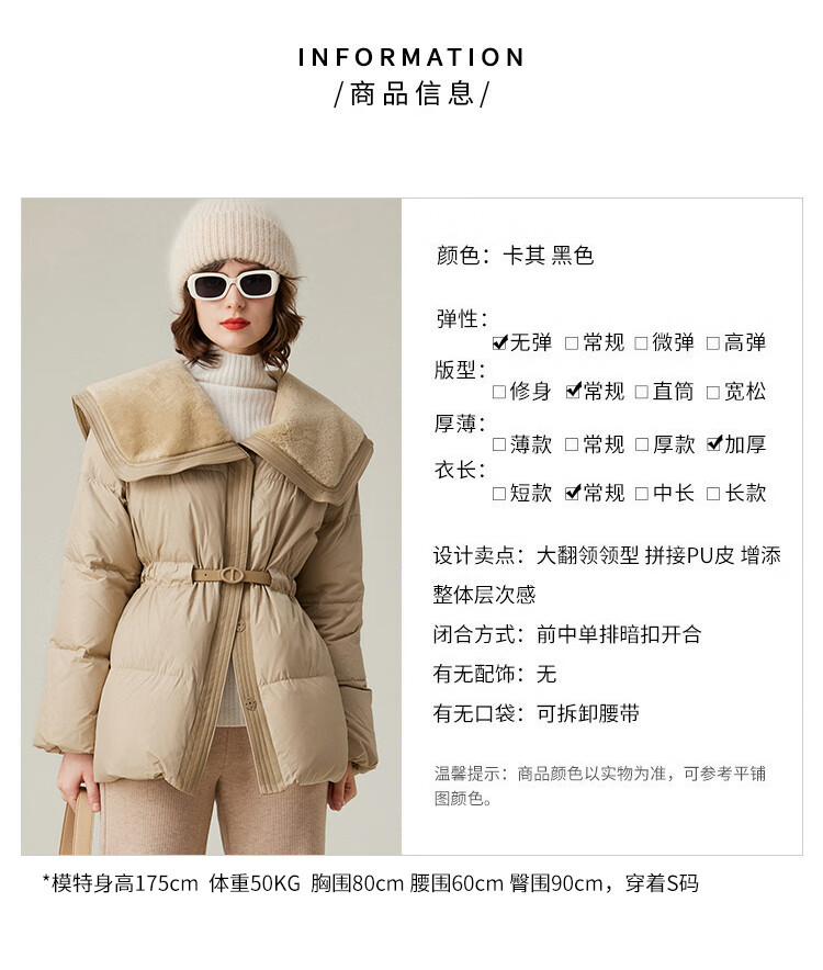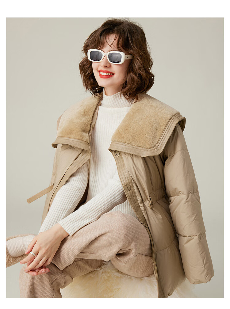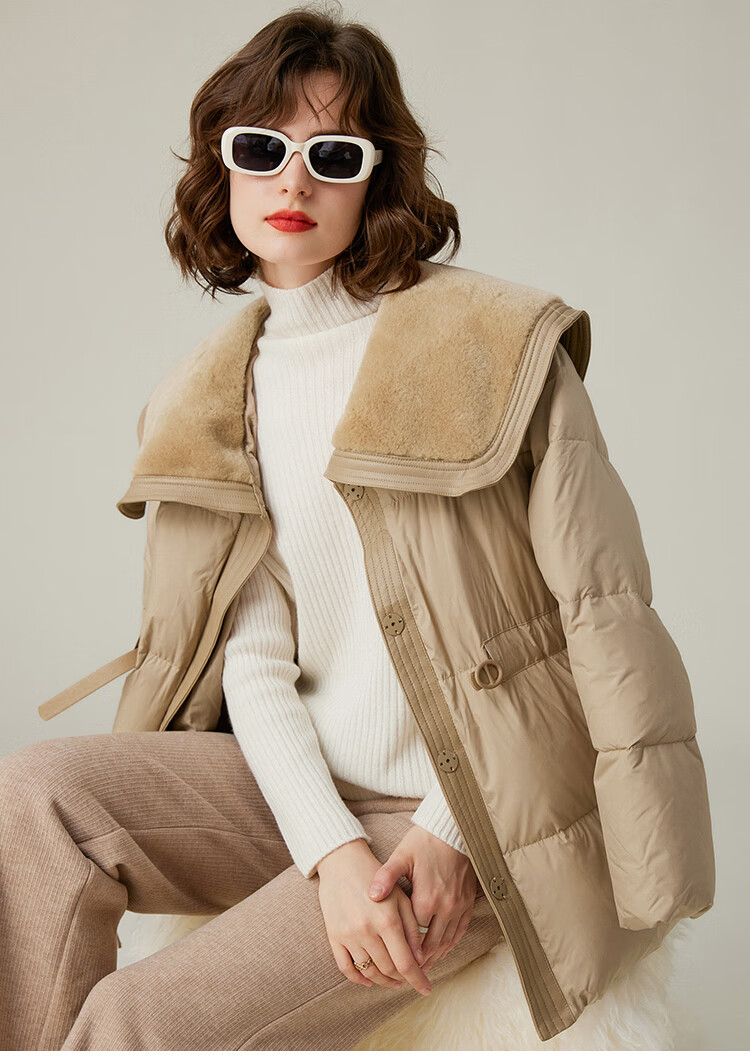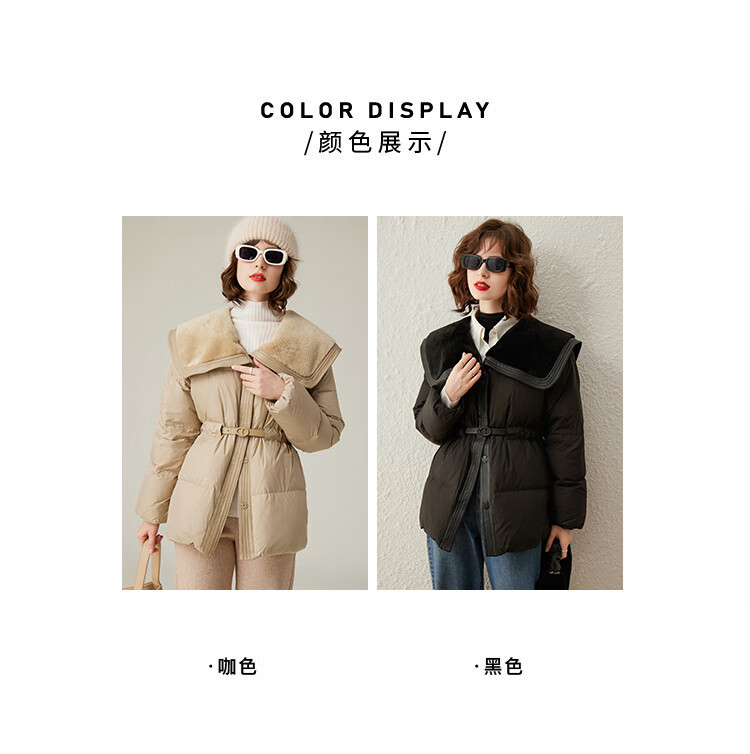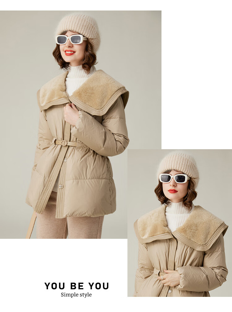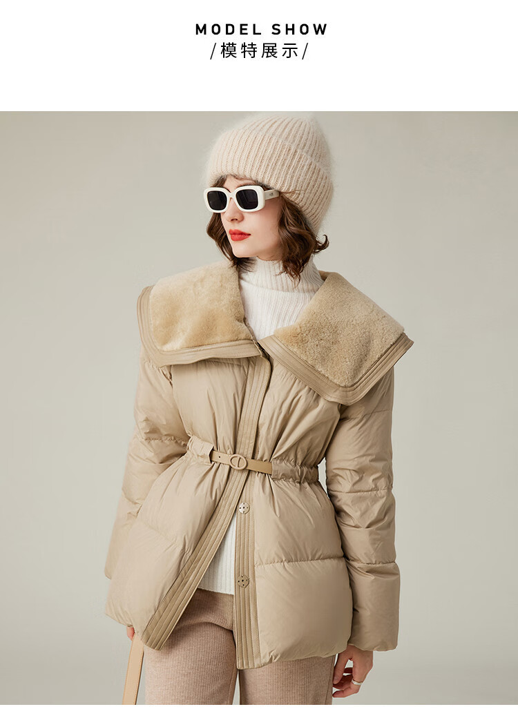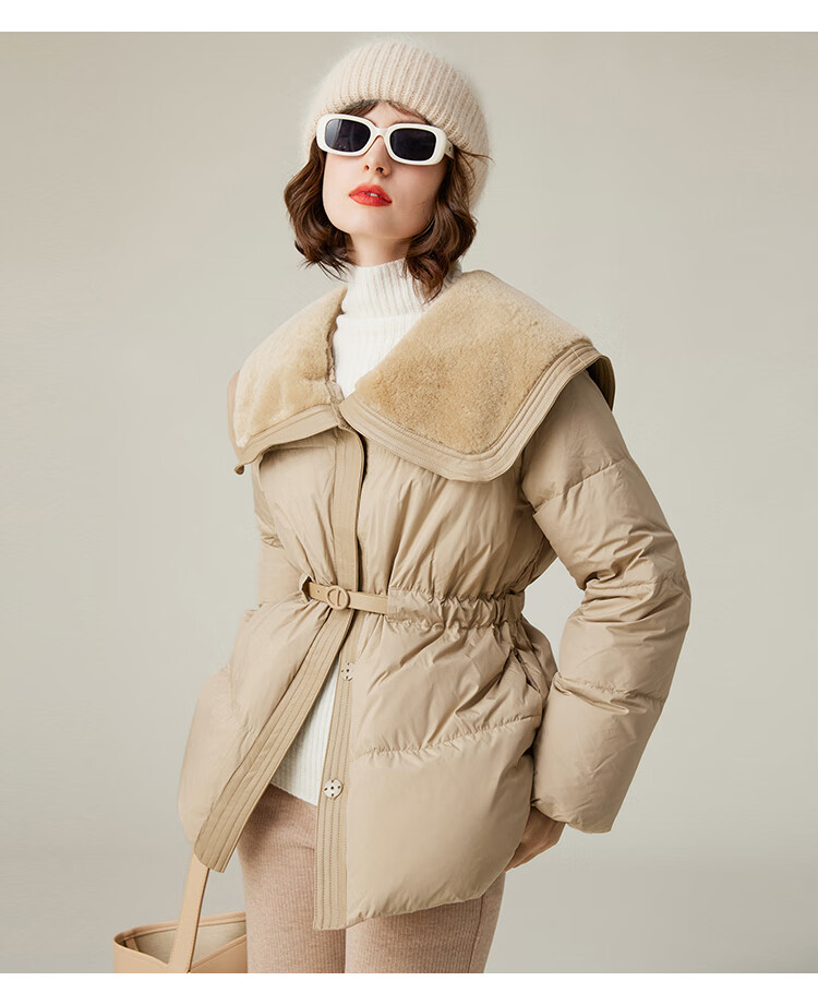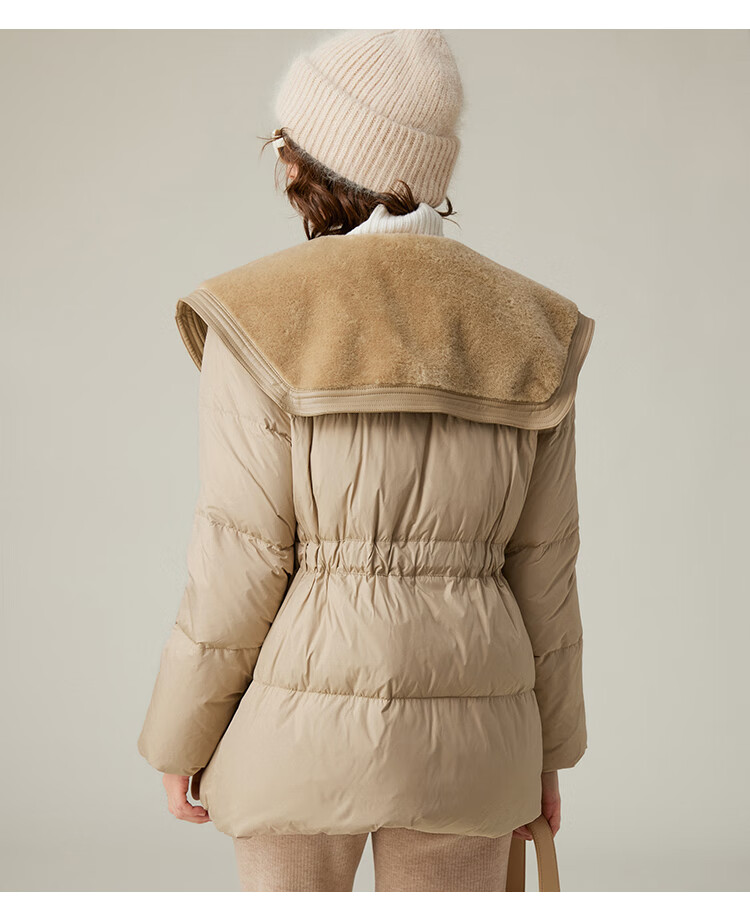 白鹿语冬季翻领简约鸭绒加厚羽绒服拼接收腰面包服外套女 卡其1 S