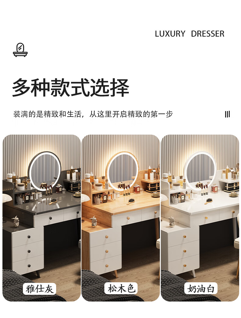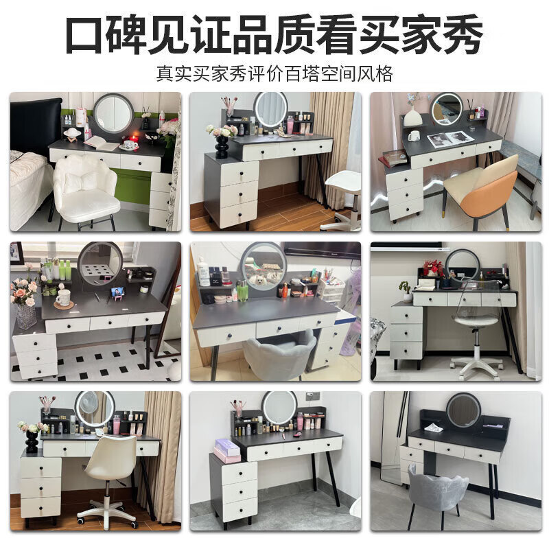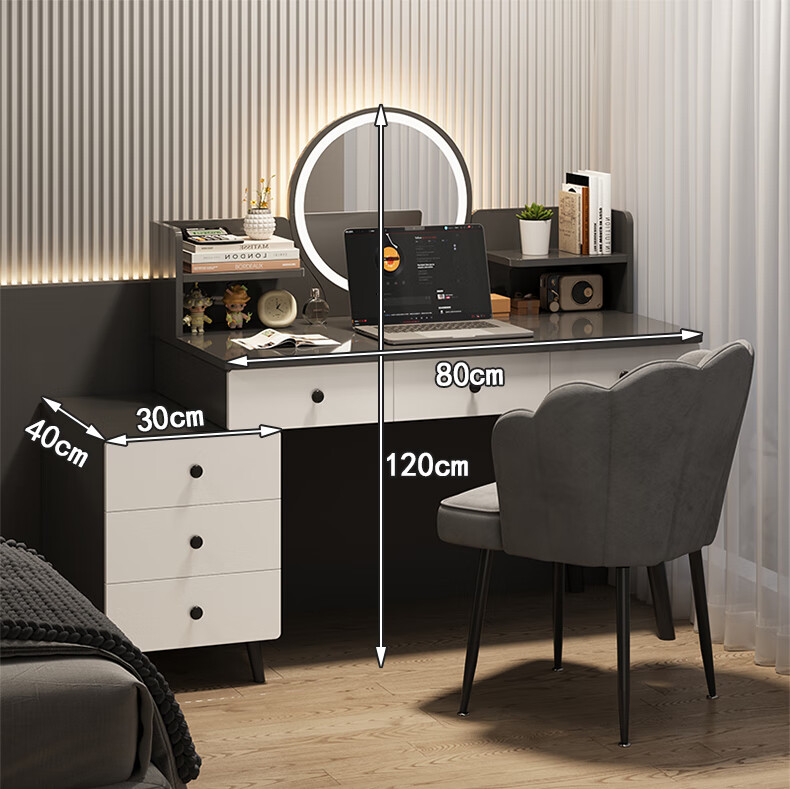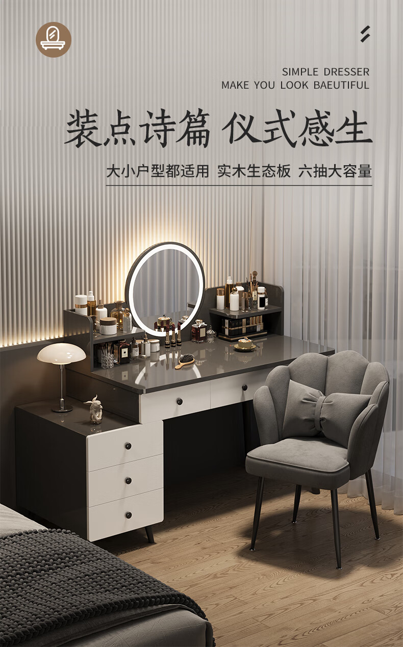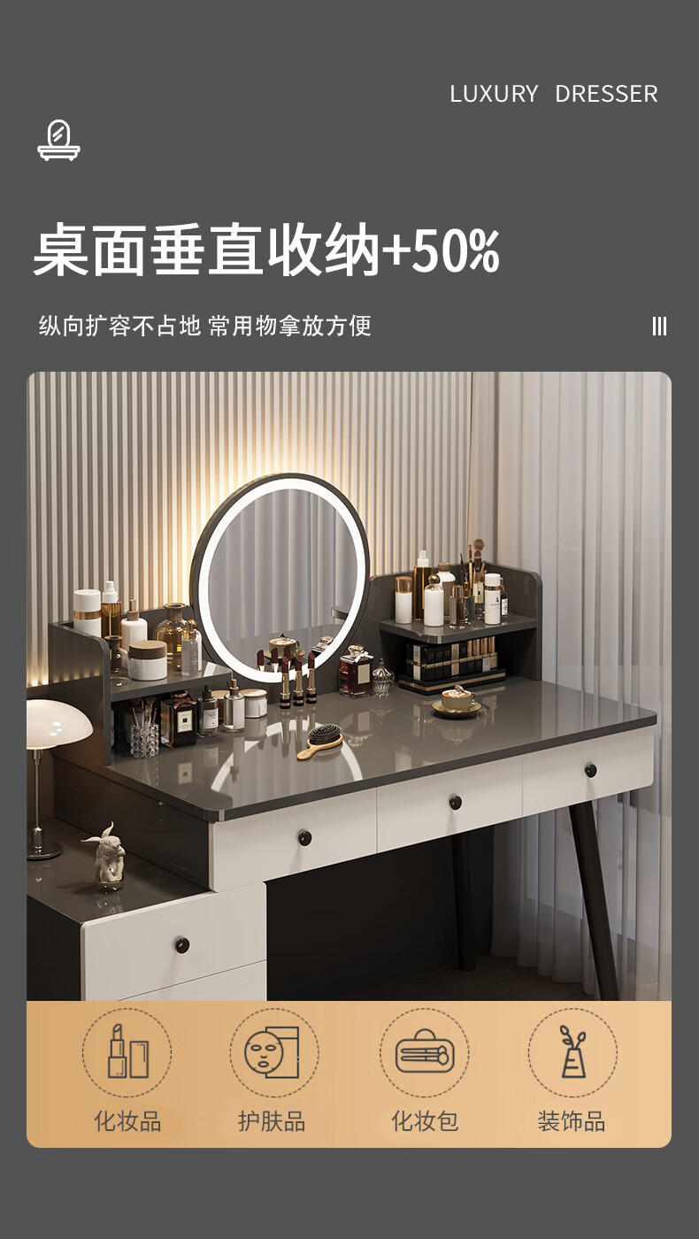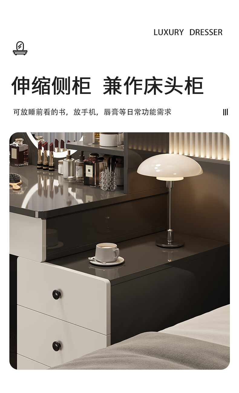 富禾梳妆台卧室斗柜收纳一体化妆桌床头梳妆台可伸缩灯镜桌椅组合桌子 推荐【五斗柜 】80-100cm奶油白 单桌