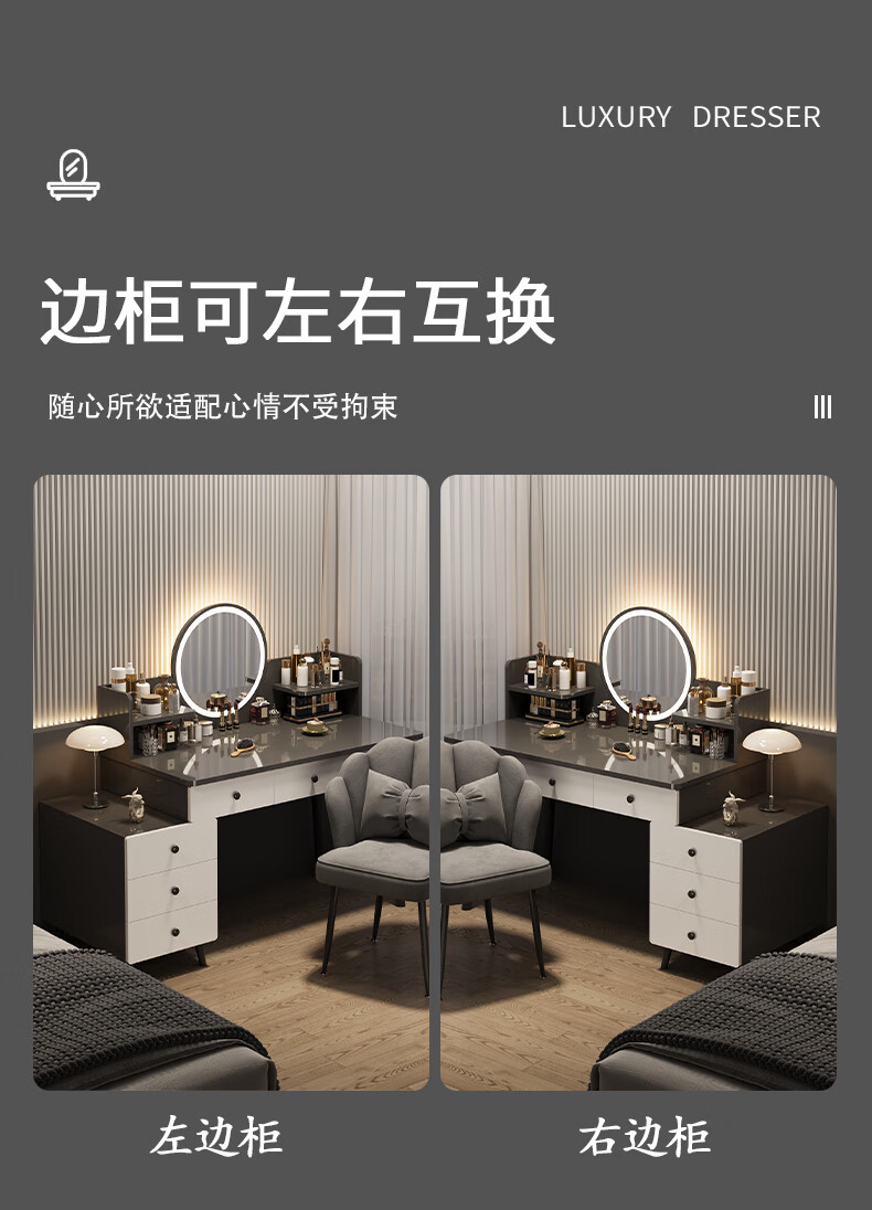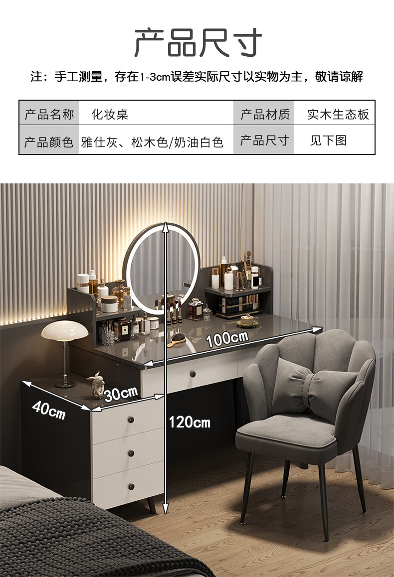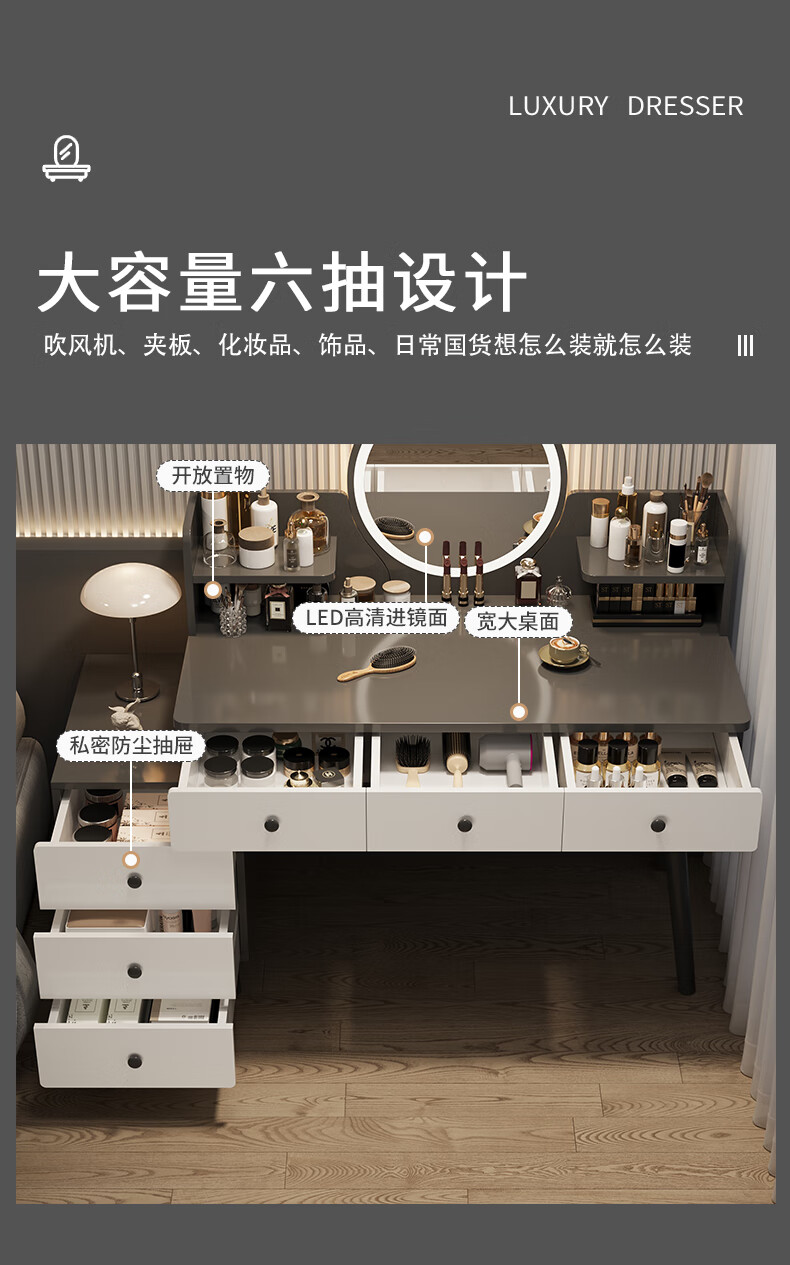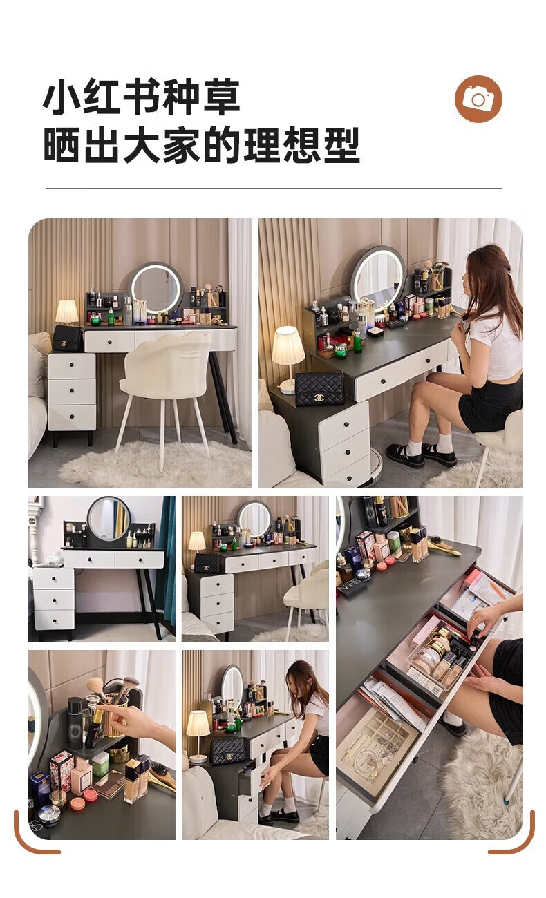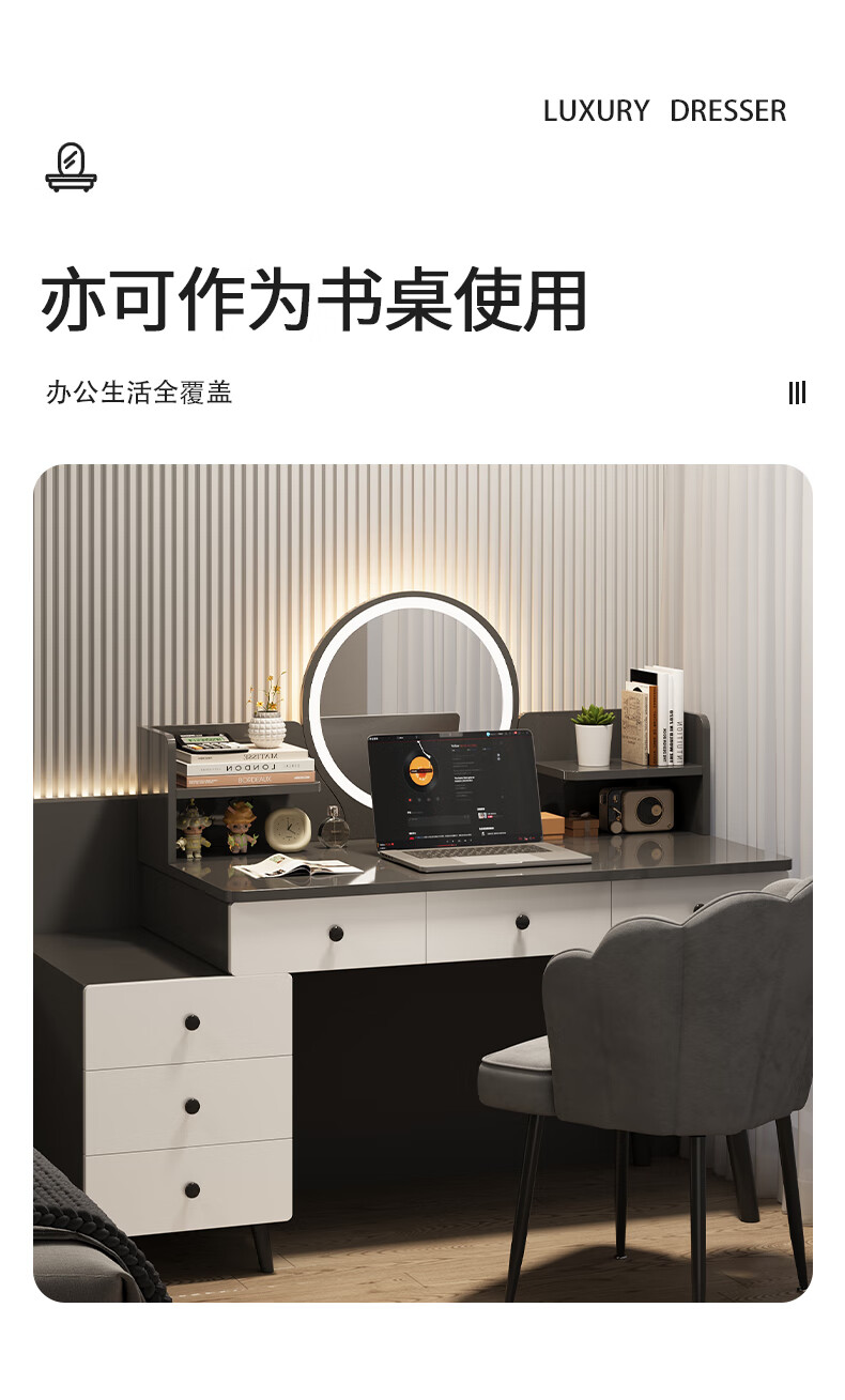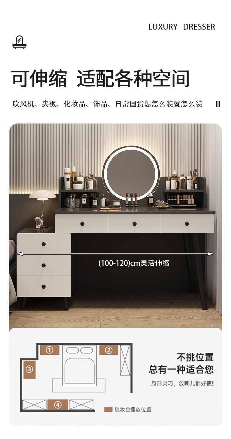 富禾梳妆台卧室斗柜收纳一体化妆桌床头梳妆台可伸缩灯镜桌椅组合桌子 推荐【五斗柜 】80-100cm奶油白 单桌