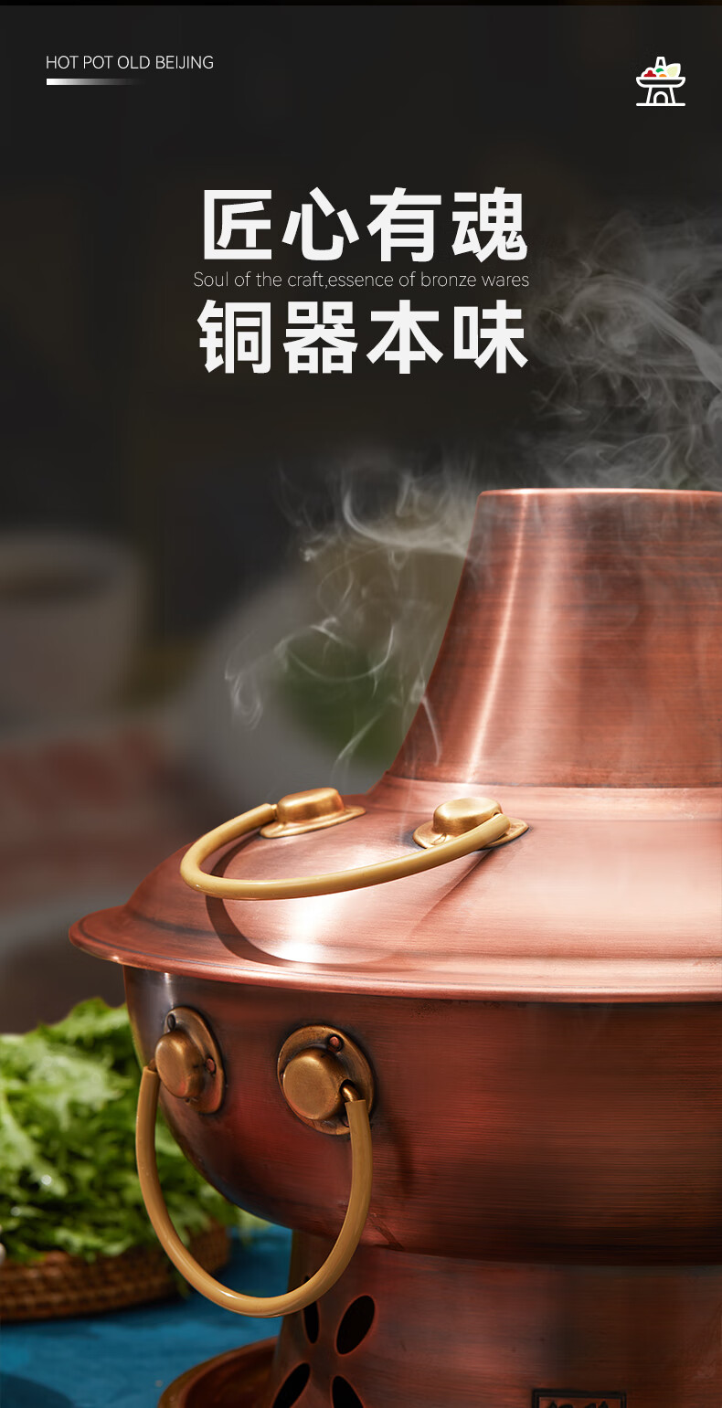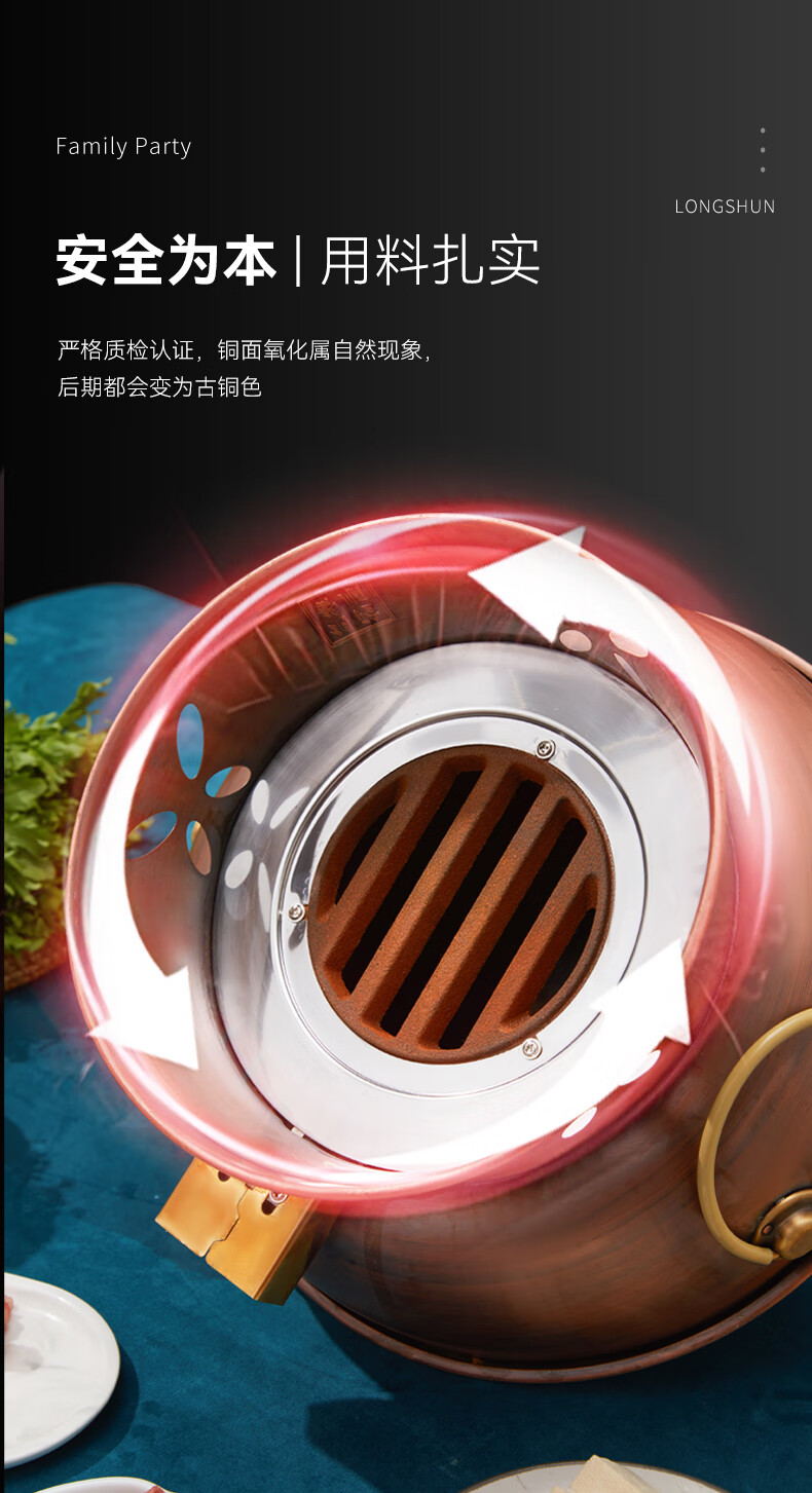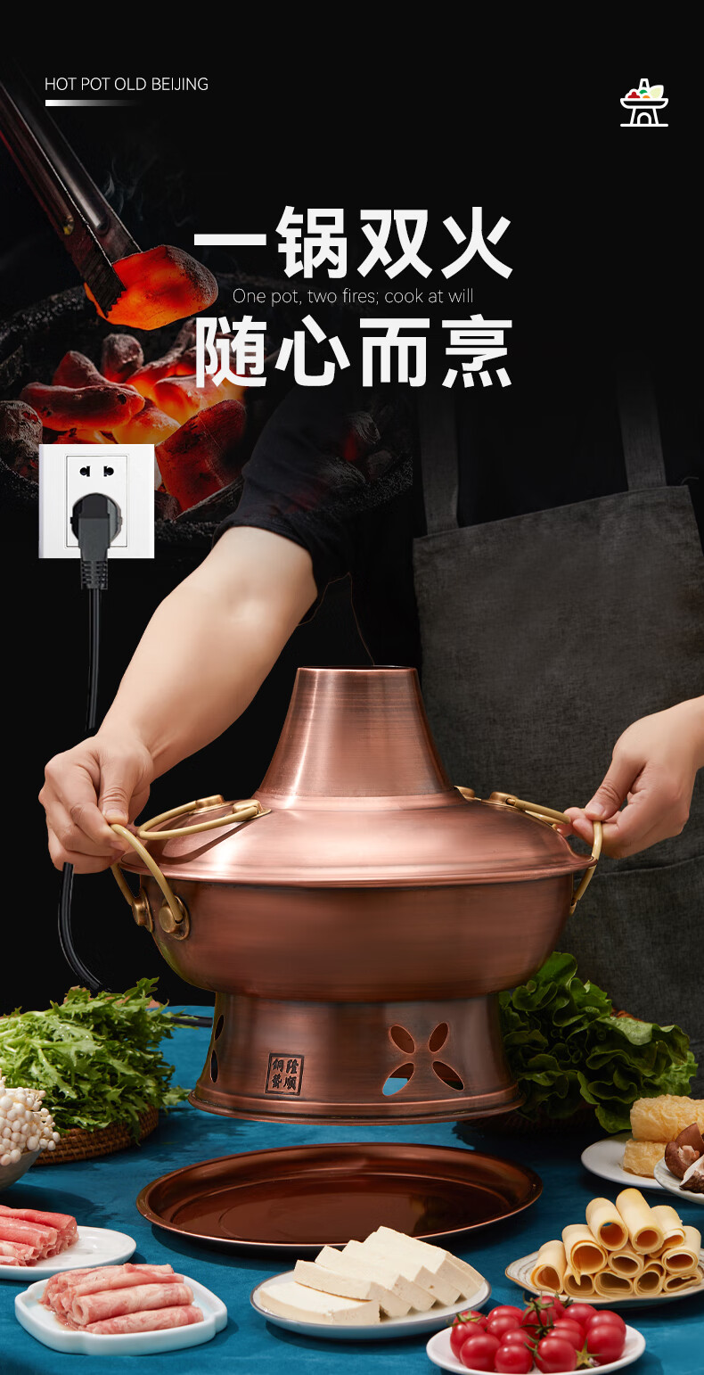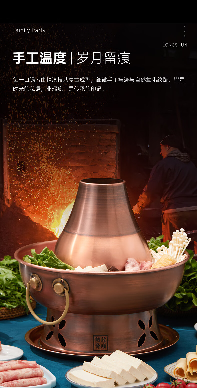 隆顺铜艺 铜火锅紫铜电炭两用插电木碳火锅家用加厚老北京涮肉铜锅火锅 6-8人鸳鸯锅【加厚防水】 34cm