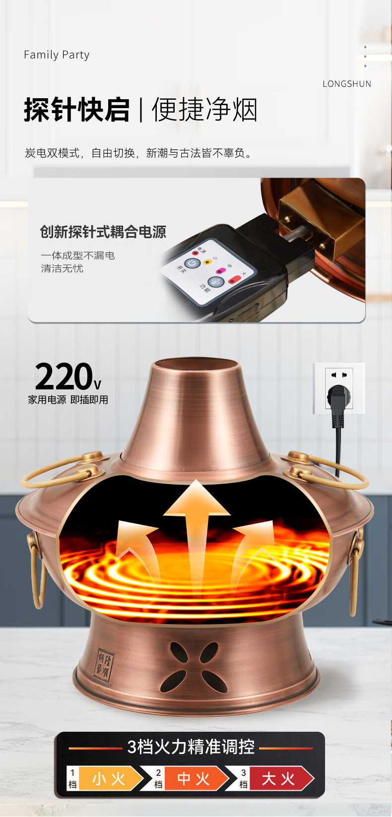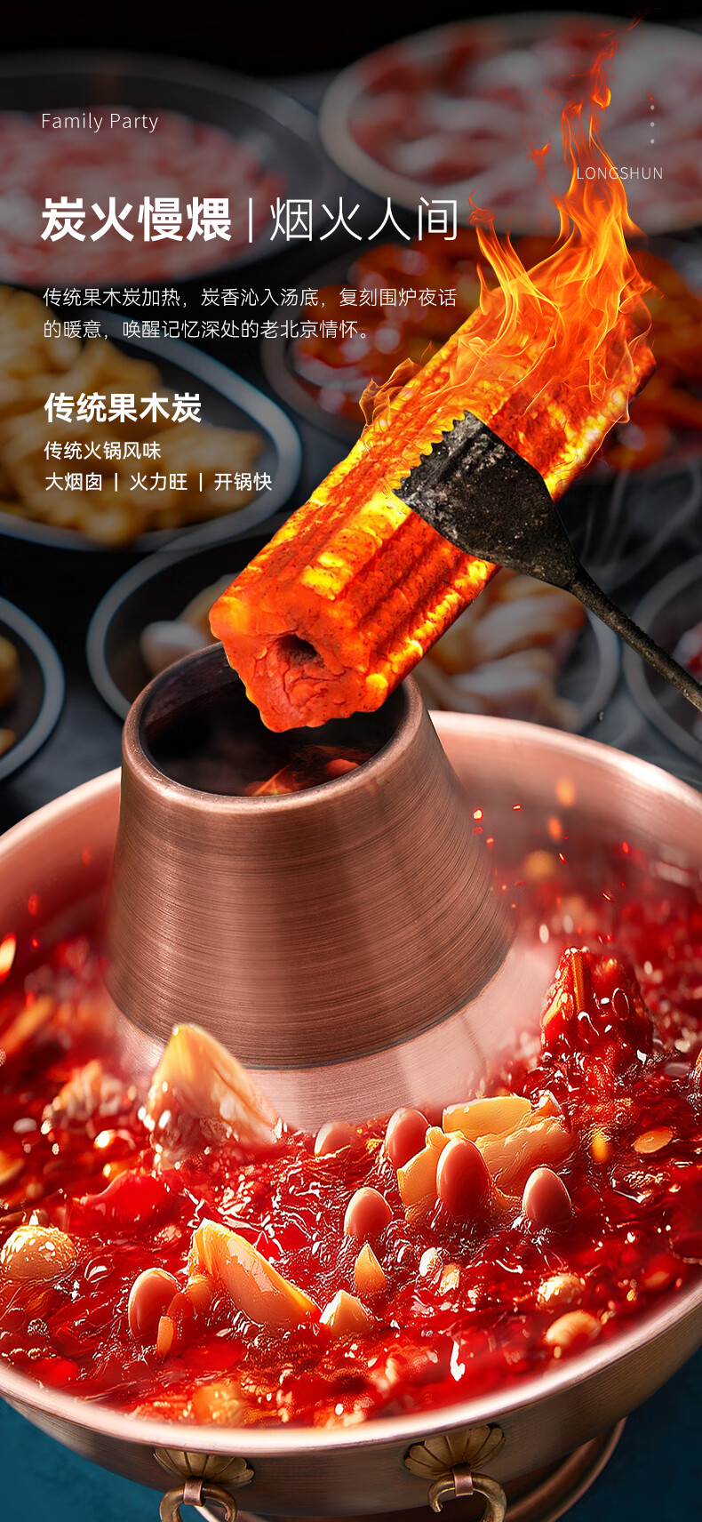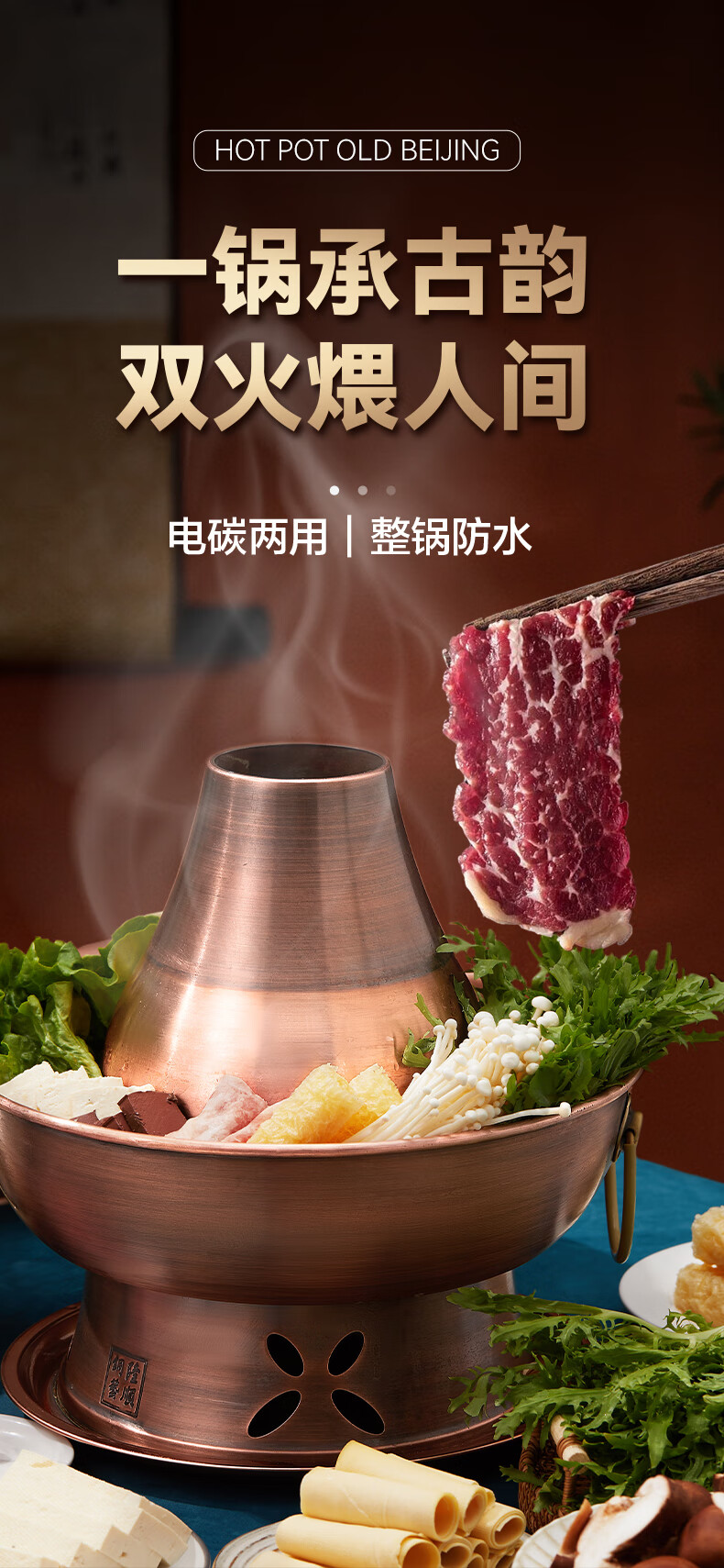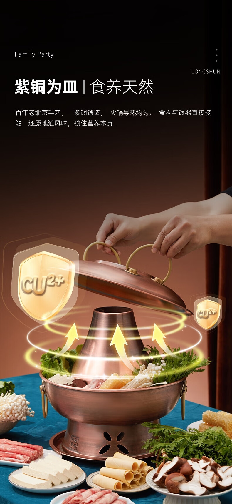 隆顺铜艺 铜火锅紫铜电炭两用插电木碳火锅家用加厚老北京涮肉铜锅火锅 6-8人鸳鸯锅【加厚防水】 34cm