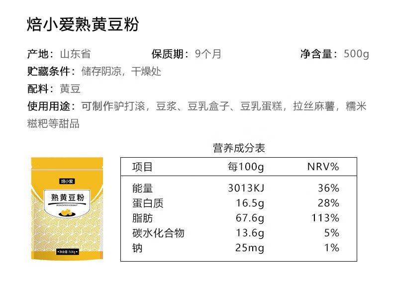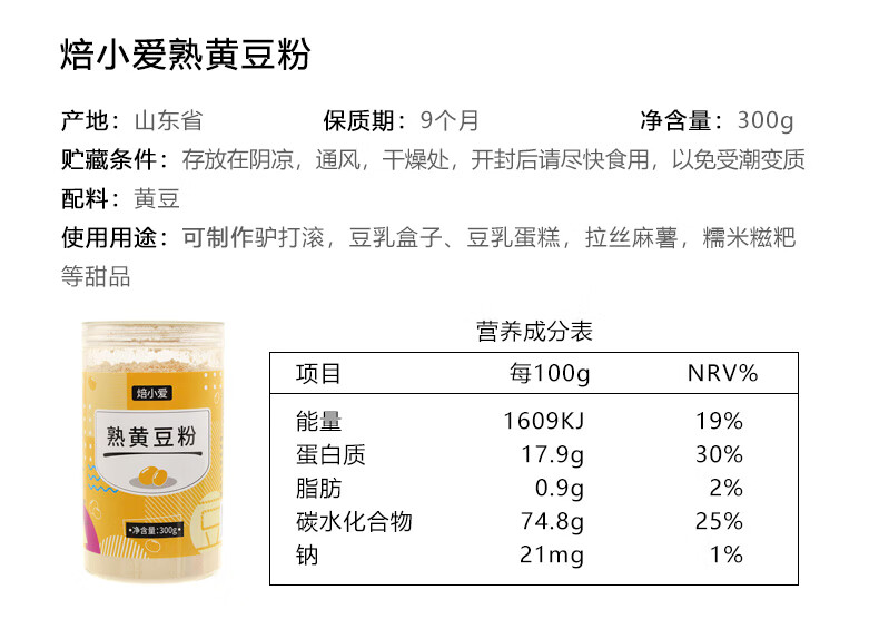 焙小爱 熟黄豆粉驴打滚纯黄豆面糍粑年糕烧烤商用冲泡烘焙即食 甄食纯良熟黄豆粉20g*5袋
