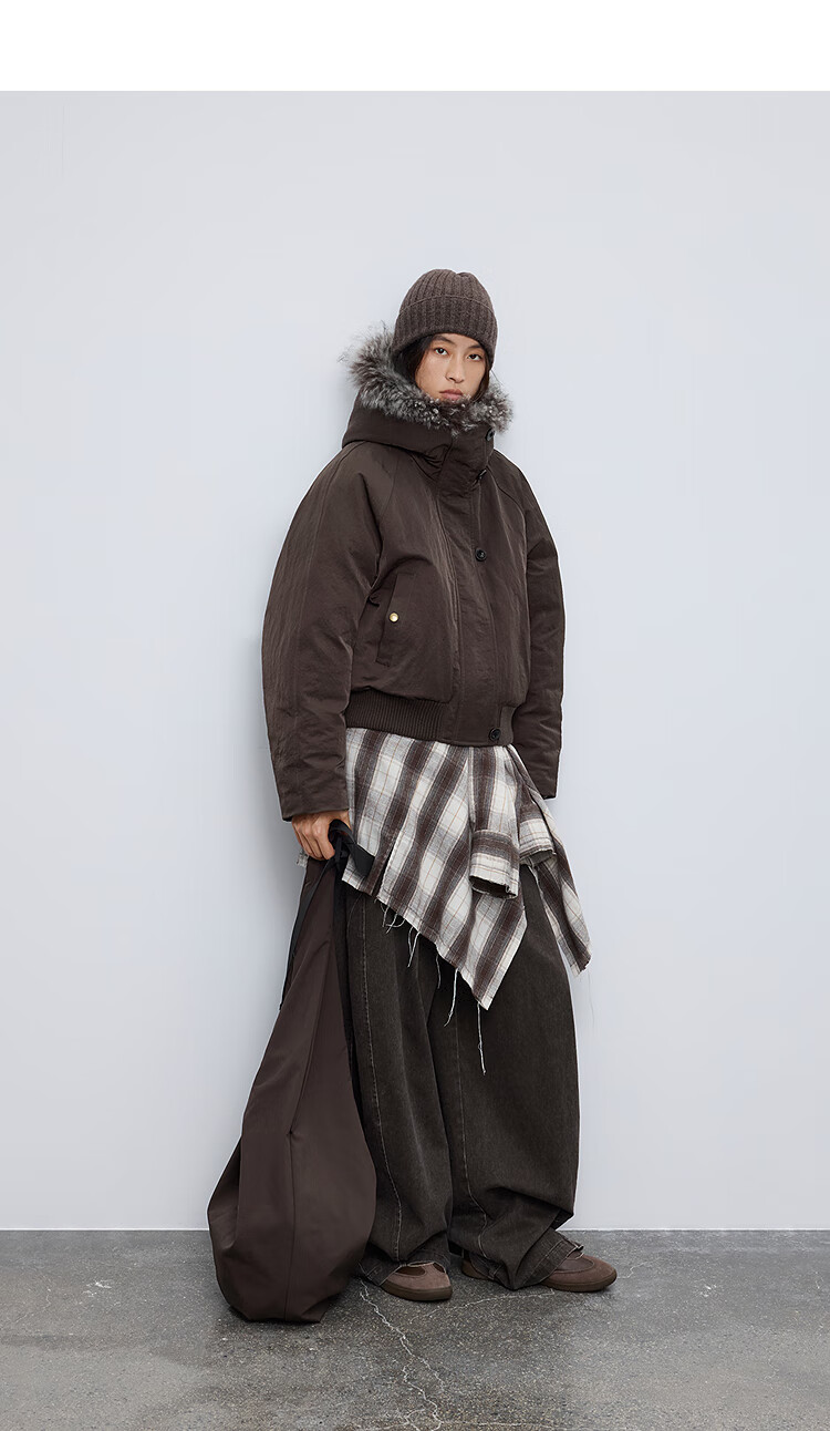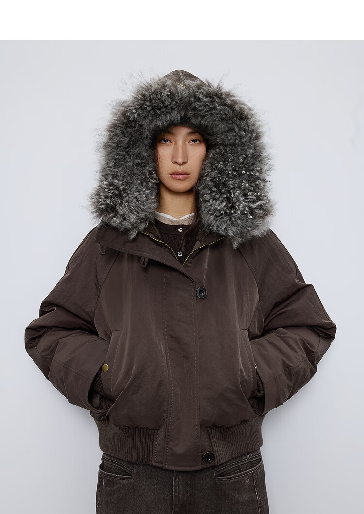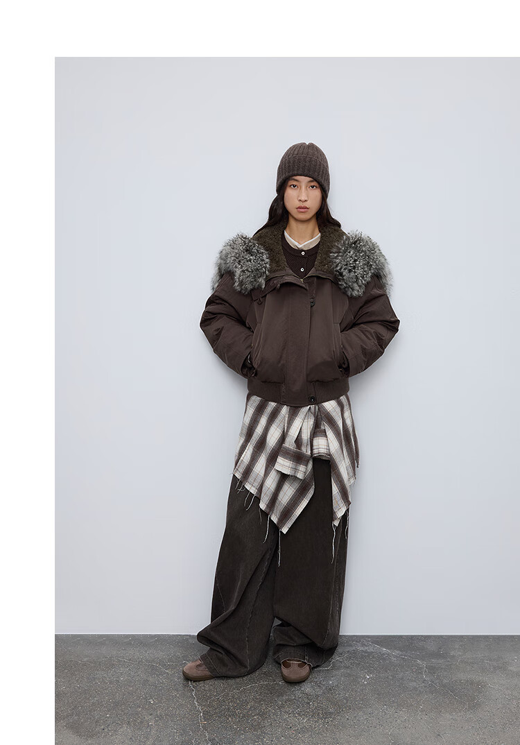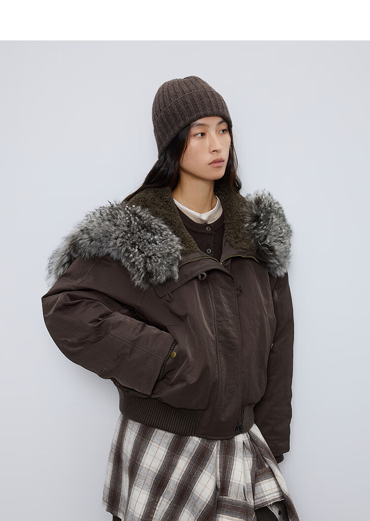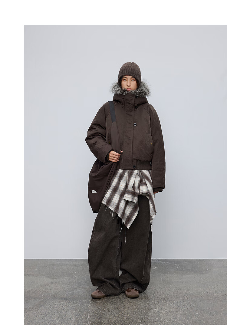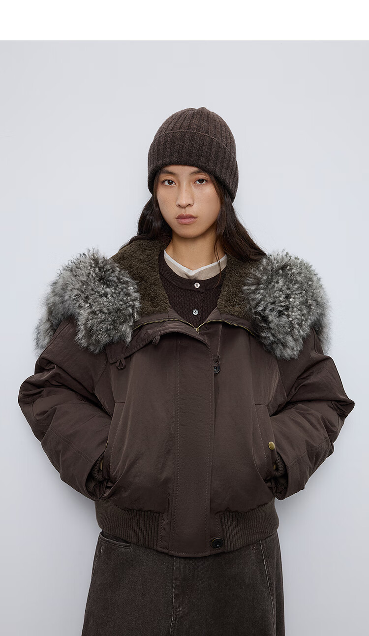 半圆女装[运动]2025秋冬休闲拼接松露棕滩羊毛领宽松短款羽绒服女 松露棕 升级拒水白鸭绒 S