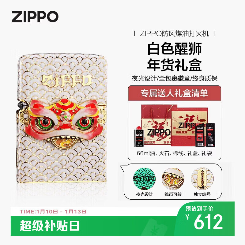 ZIPPO打火机之宝防风煤油 白色醒狮 年货礼盒生日礼物男 含油套装