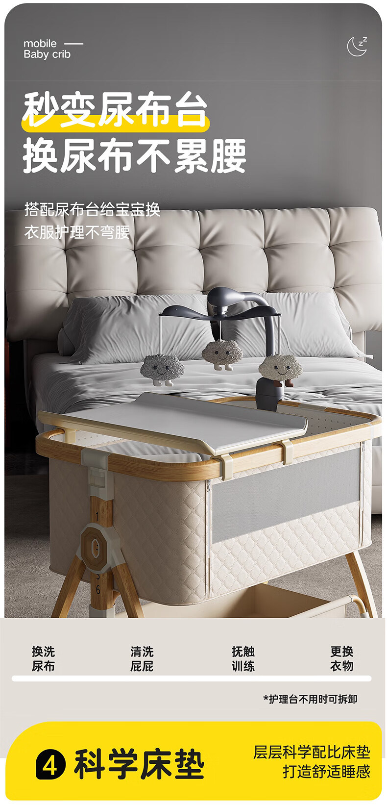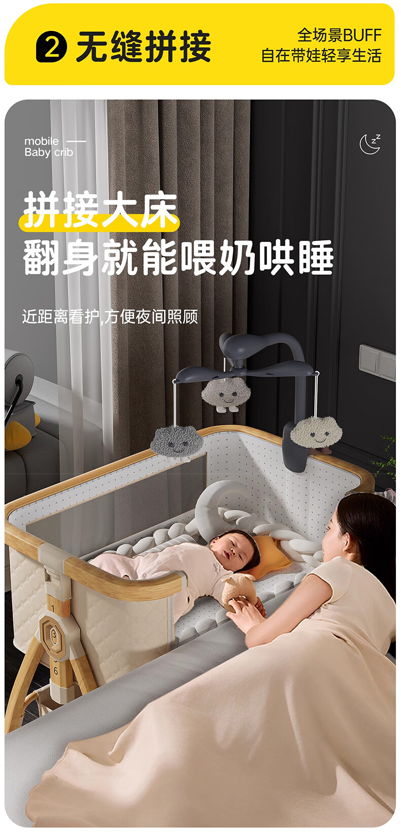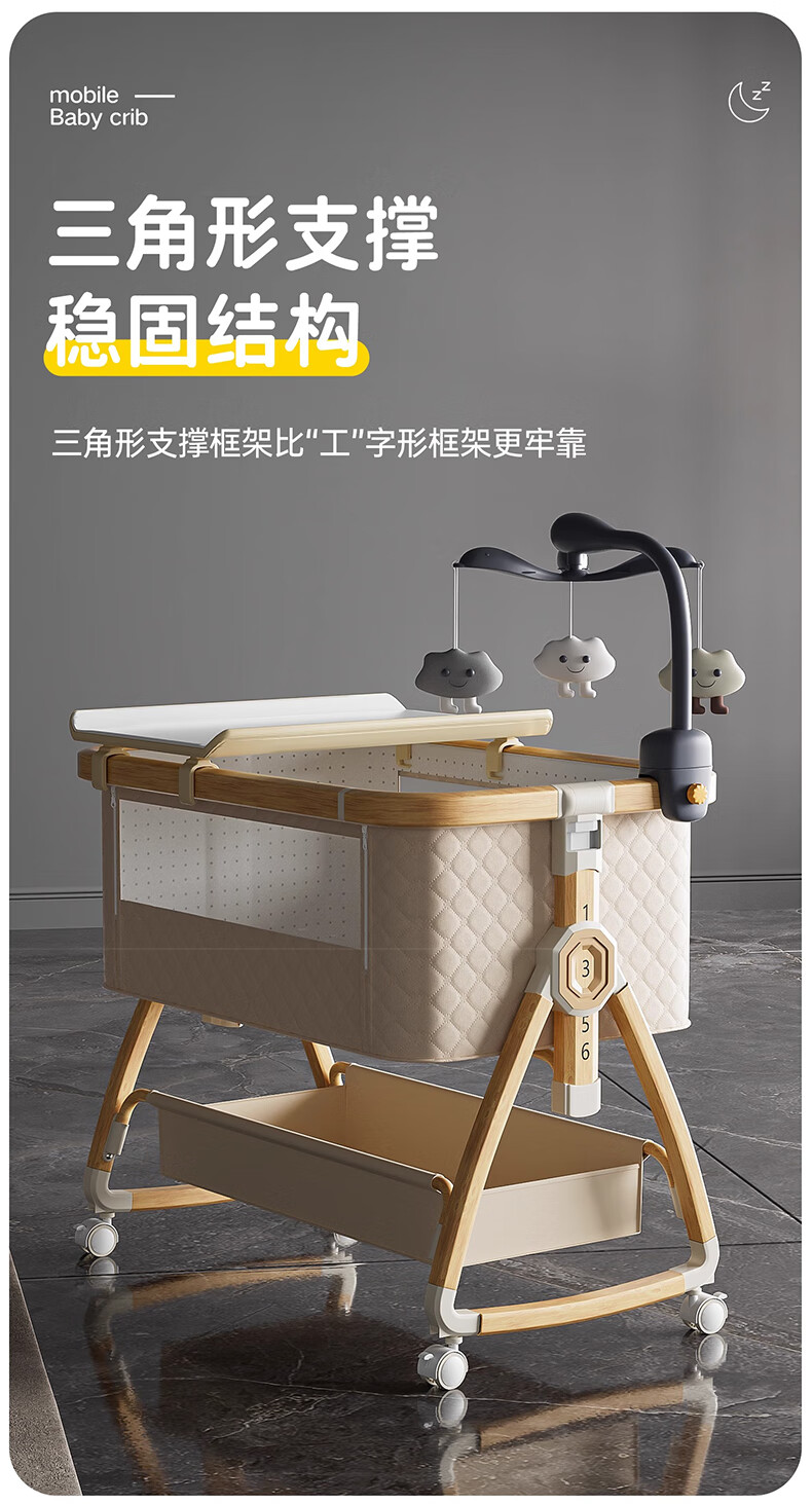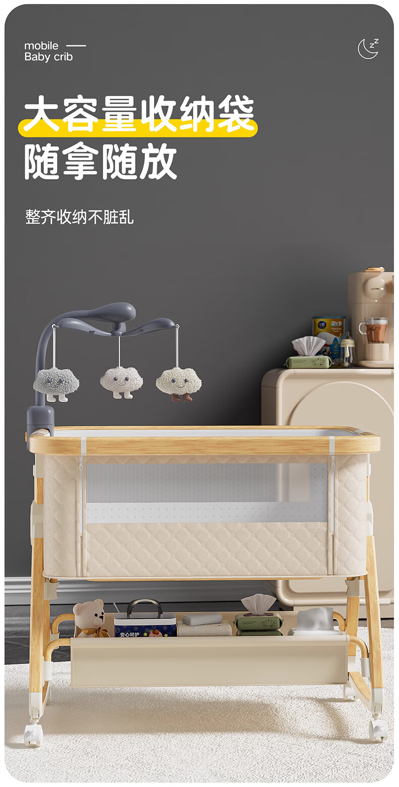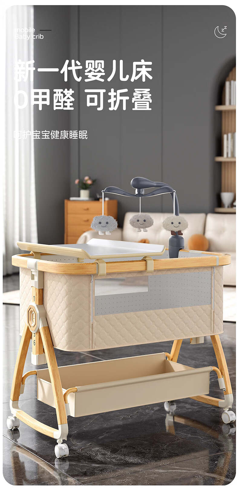 ANGI BABY新生儿婴儿床可移动0-3岁多功能带尿布台可拼接大床宝宝摇摇床 木纹铝合金【4cm椰棕乳胶垫+尿布台+床头铃+蚊帐】 ANGIBABY婴儿床可折叠可移动带尿布台拼接床