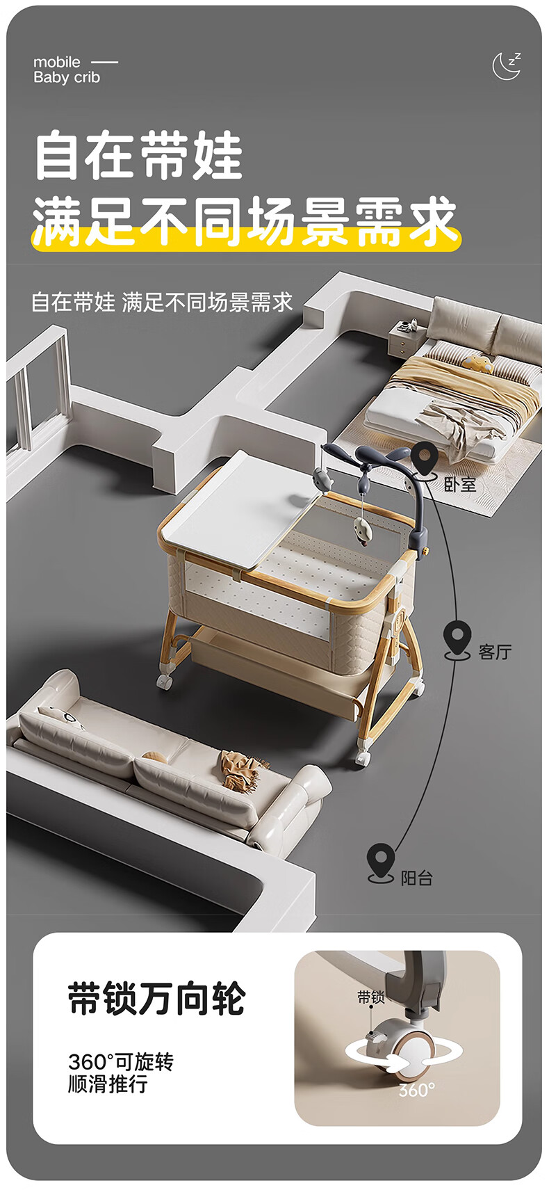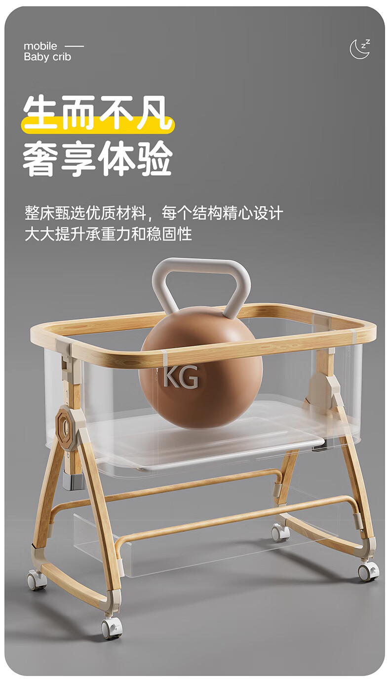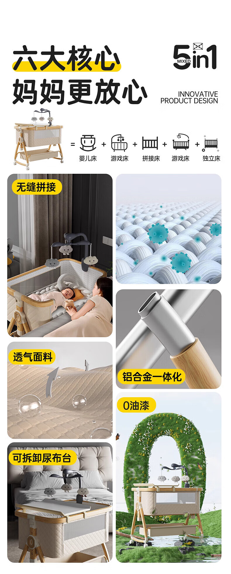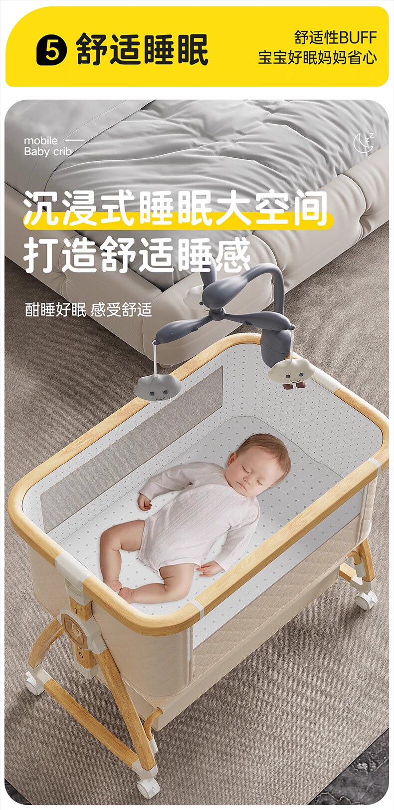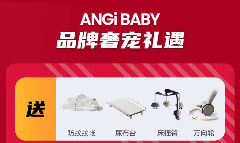 ANGI BABY新生儿婴儿床可移动0-3岁多功能带尿布台可拼接大床宝宝摇摇床 木纹铝合金【4cm椰棕乳胶垫+尿布台+床头铃+蚊帐】 ANGIBABY婴儿床可折叠可移动带尿布台拼接床