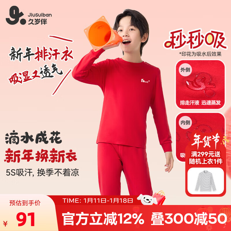 久岁伴秒秒吸排汗衣儿童保暖内衣套装大红色本命年秋冬季男女童秋衣秋裤 男童/红色套装 170 /身高160-172体重105-120斤