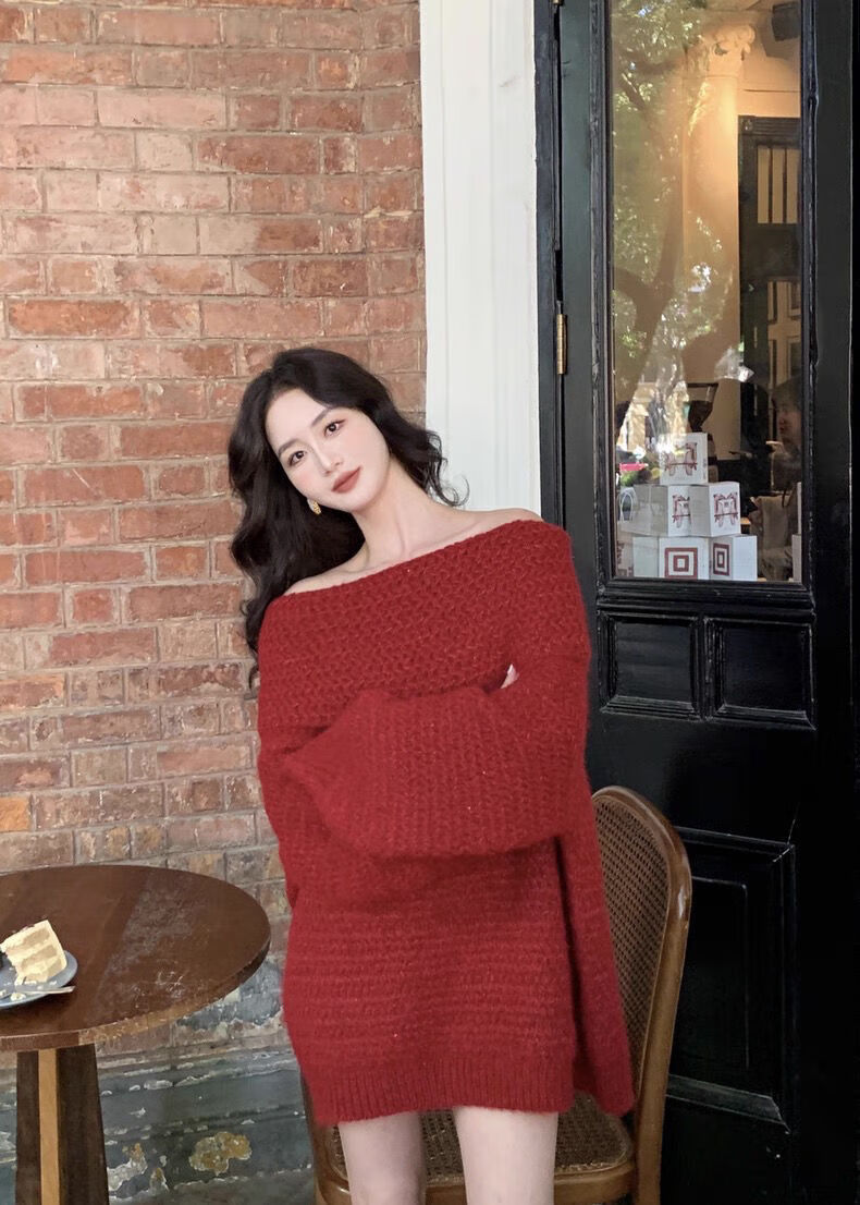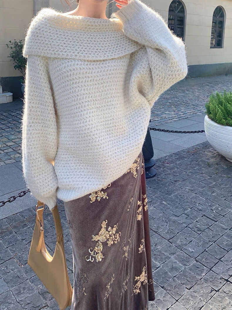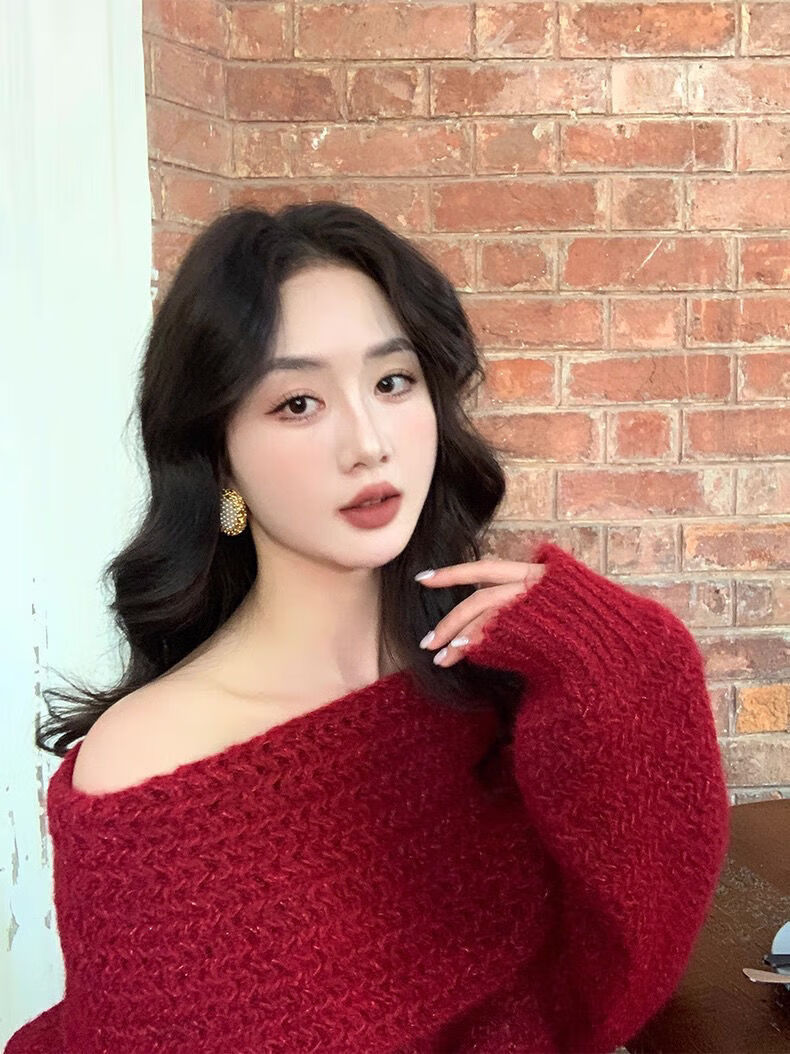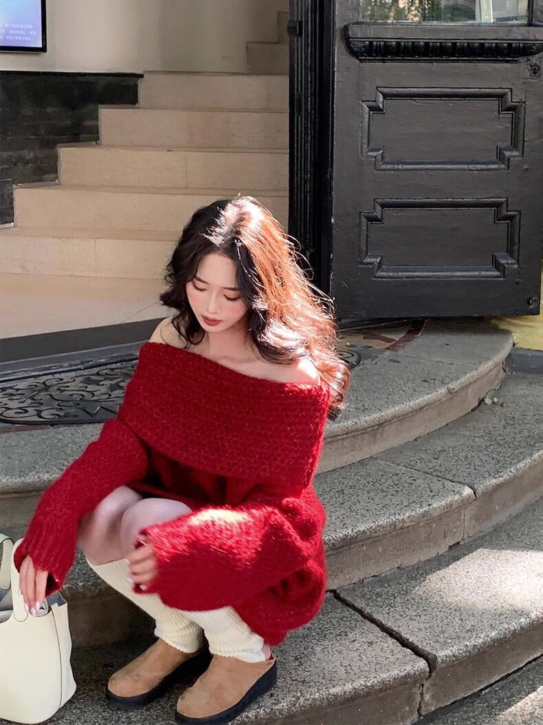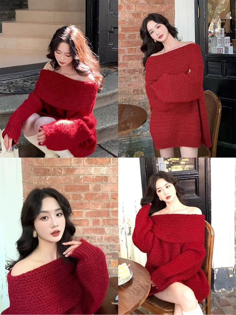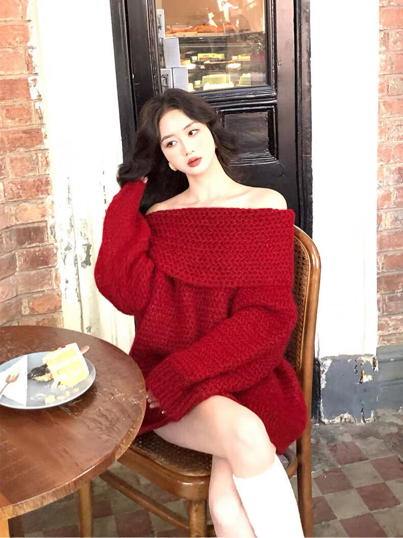 AEMAPE濮院毛衫厂大翻领一字肩粗线毛衣女冬季新款加厚螺纹套头针织衫女 红色 均码 (建议75-130斤)