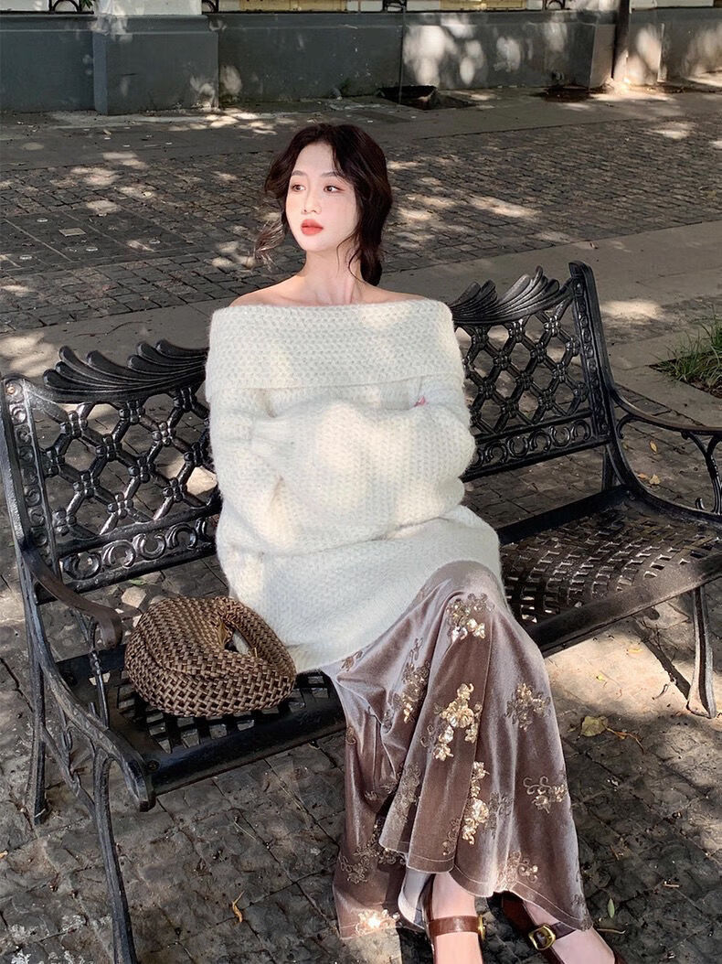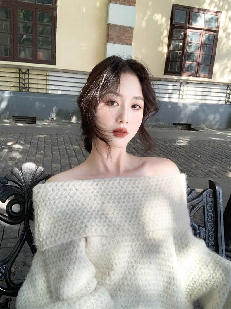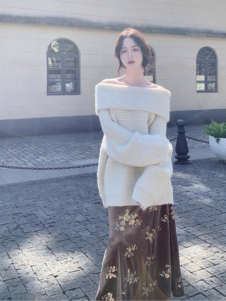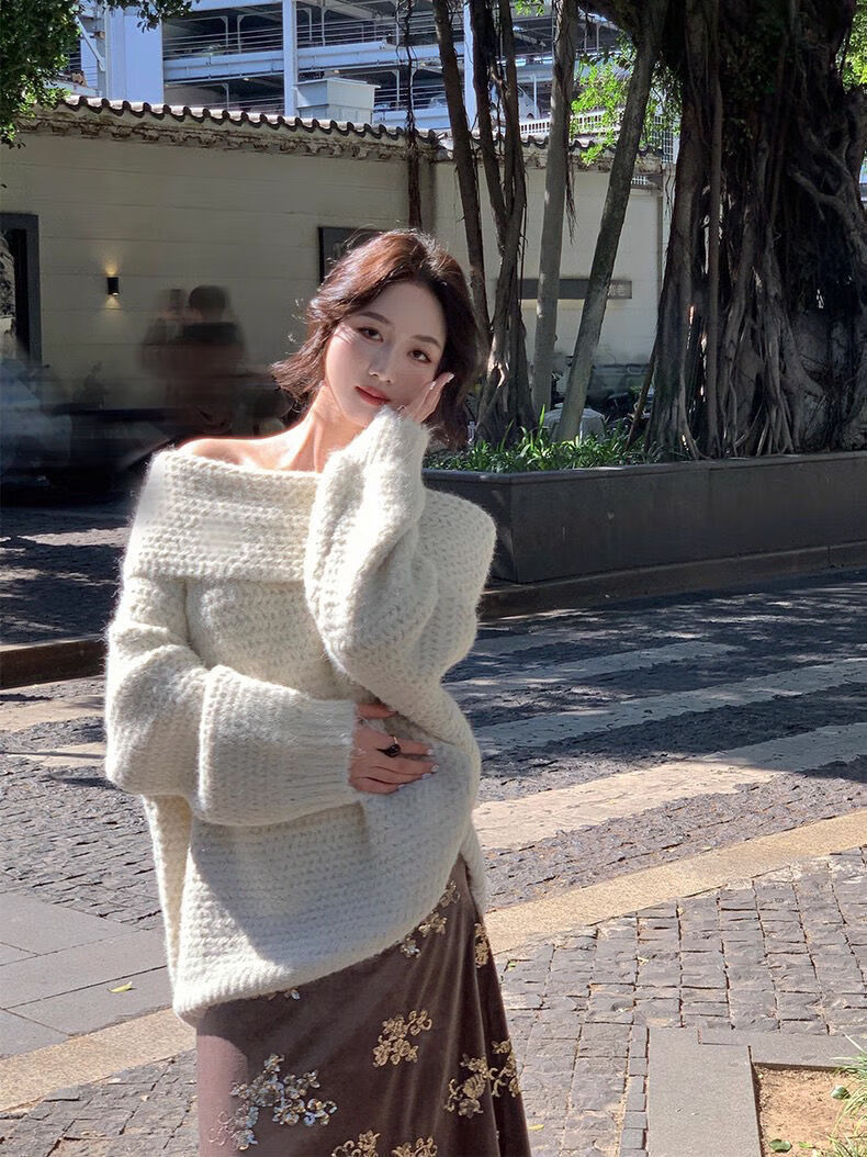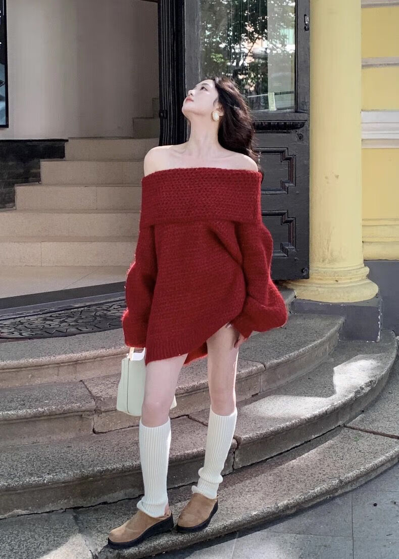 AEMAPE濮院毛衫厂大翻领一字肩粗线毛衣女冬季新款加厚螺纹套头针织衫女 红色 均码 (建议75-130斤)