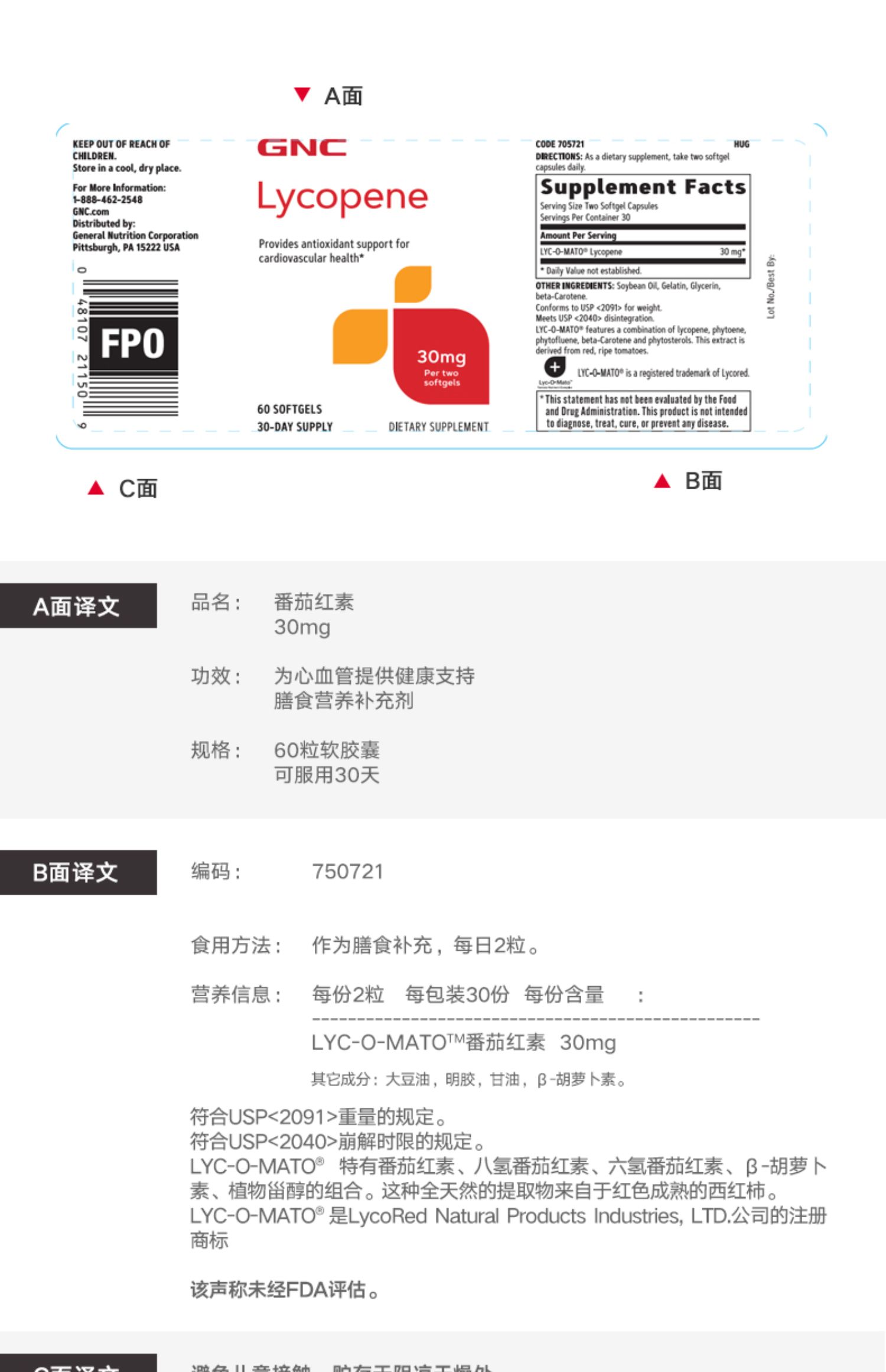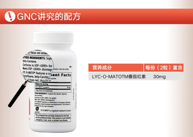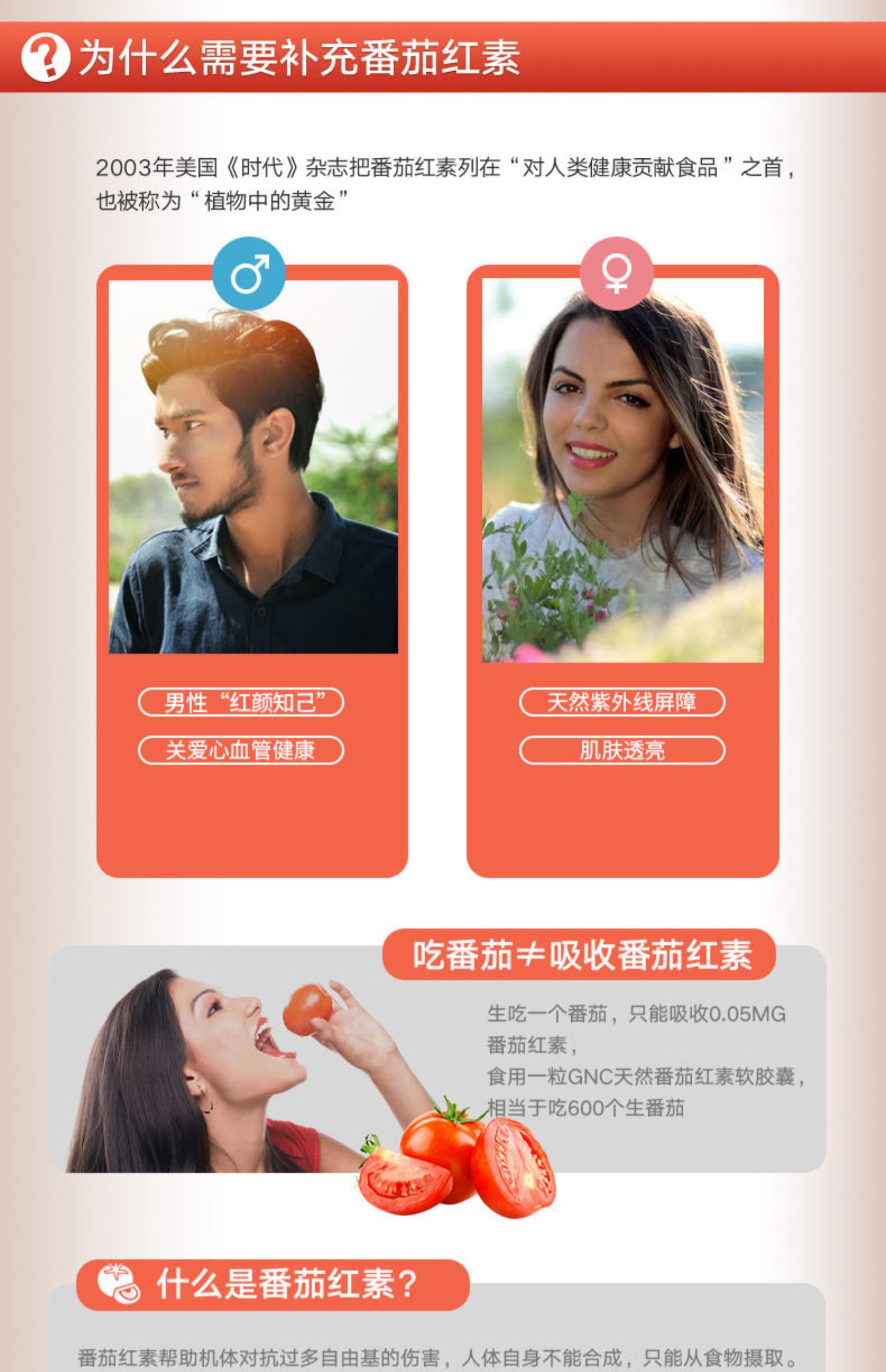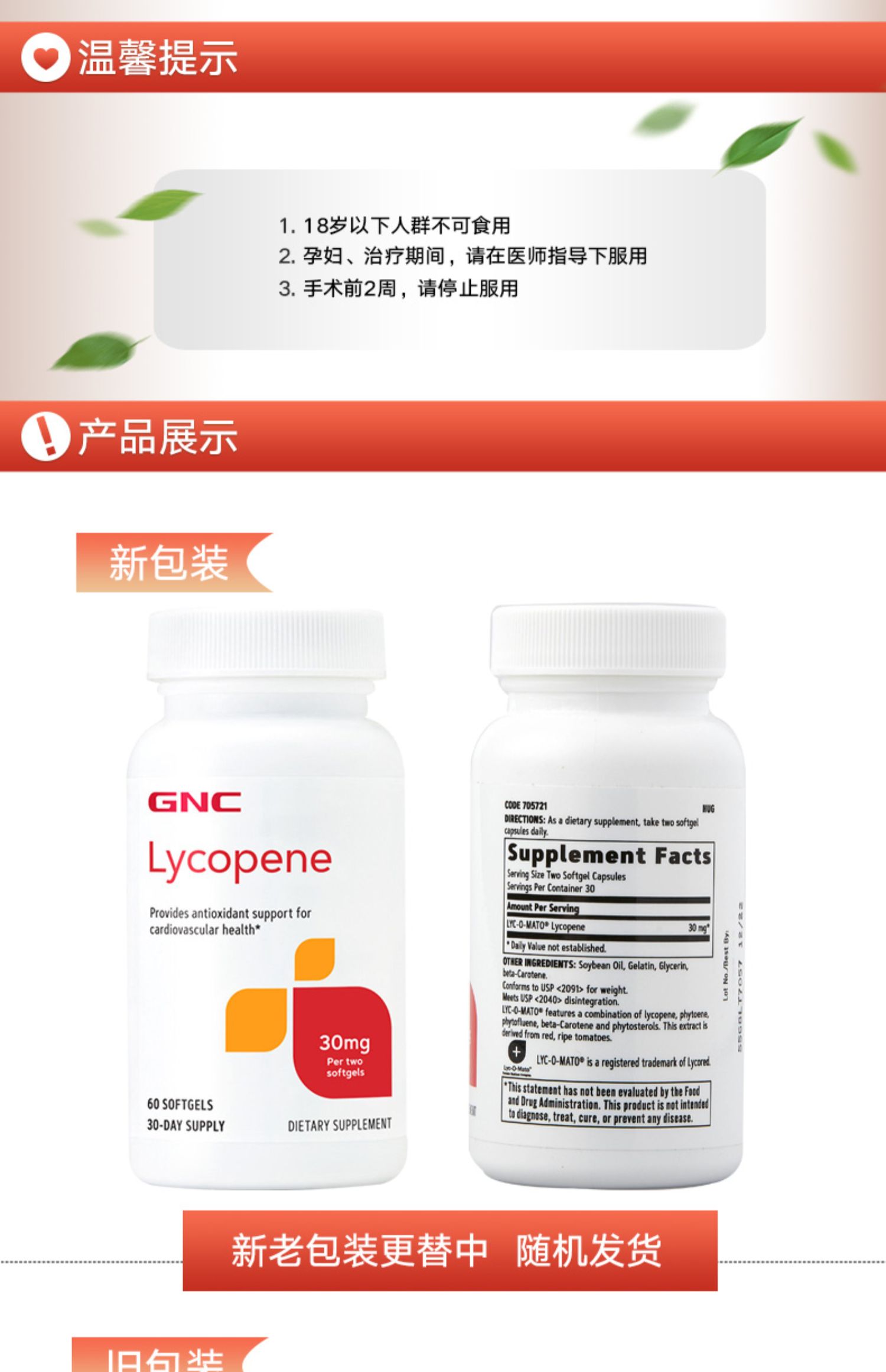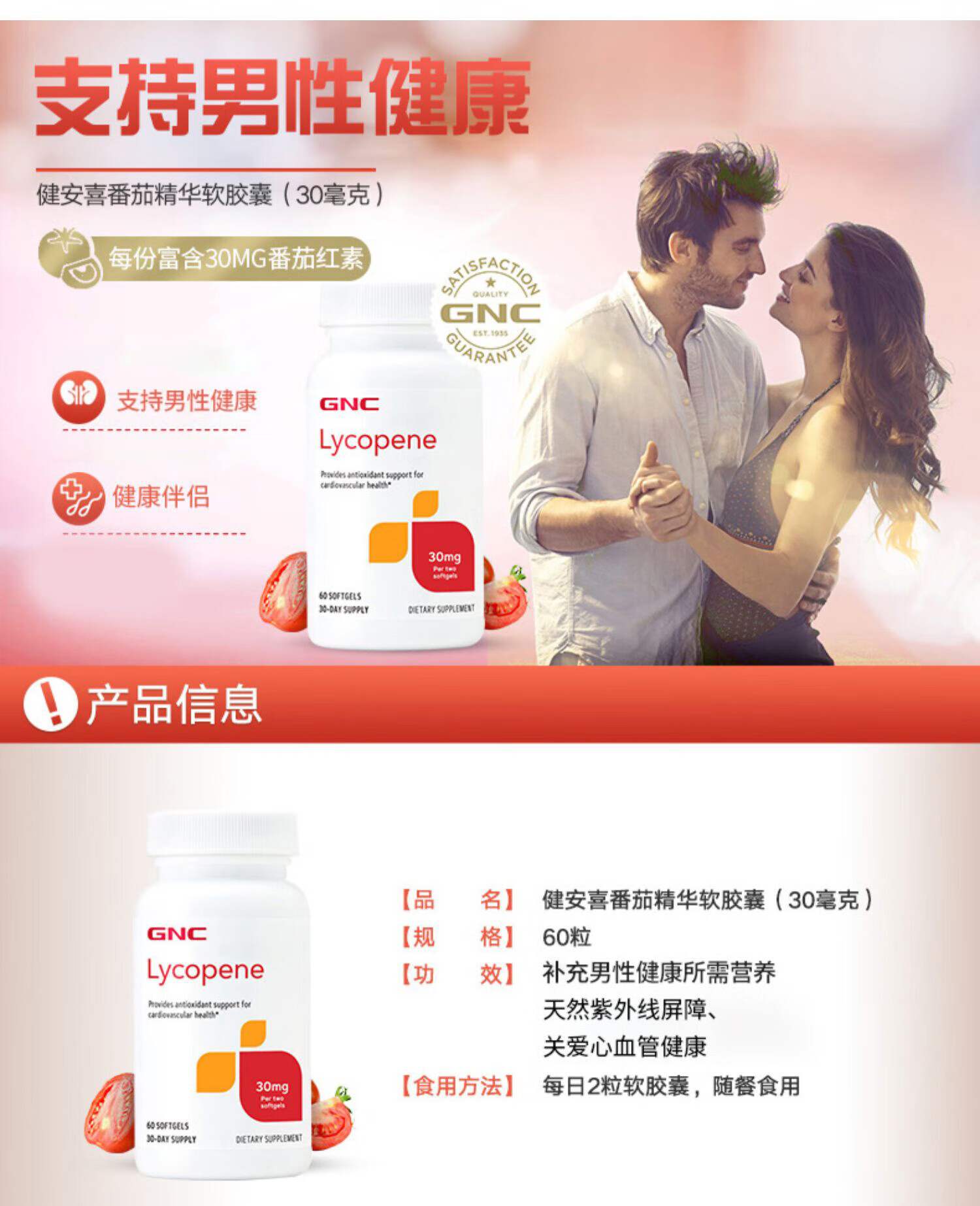 GNC健安喜 番茄红素软胶囊30mg60粒(两粒含量) 呵护男士成人健康保健