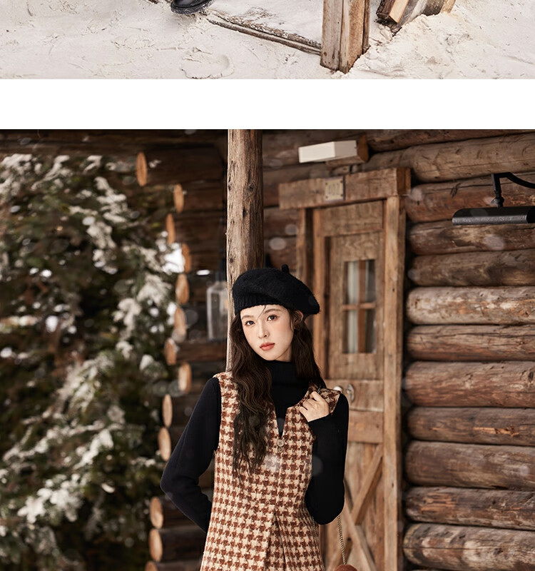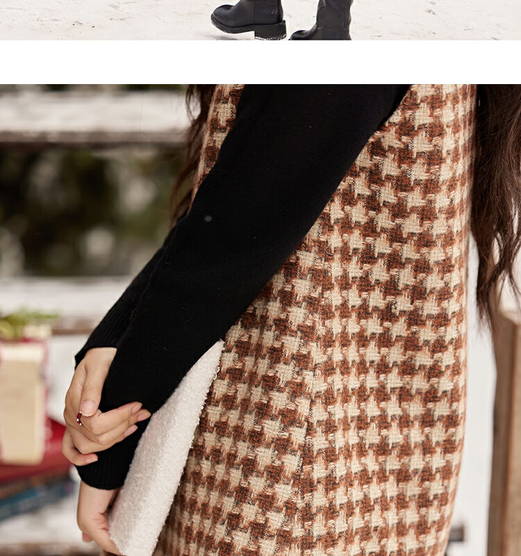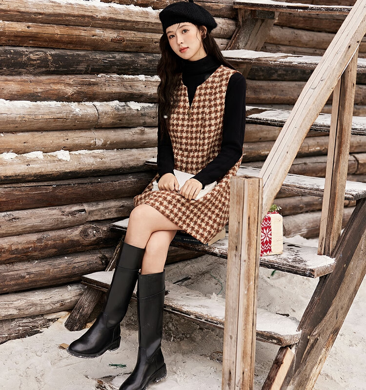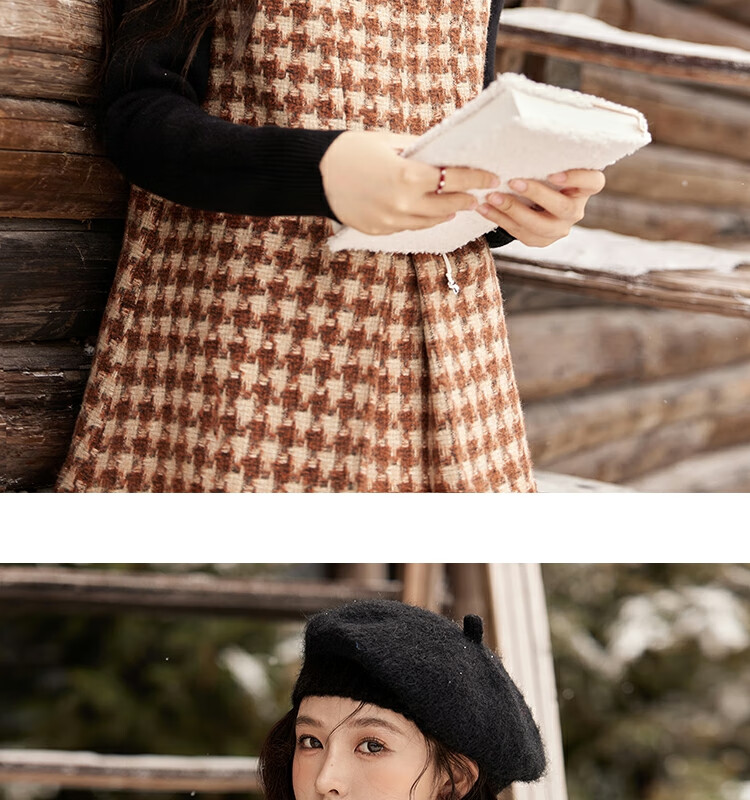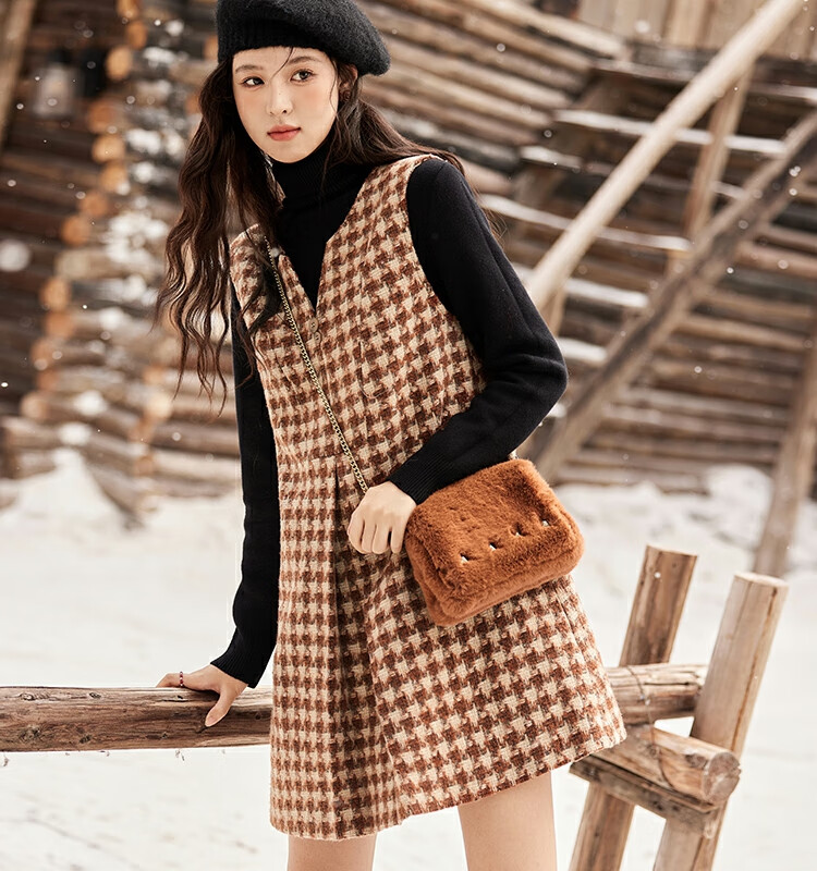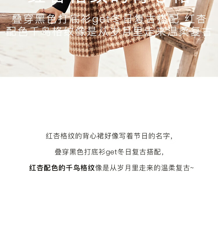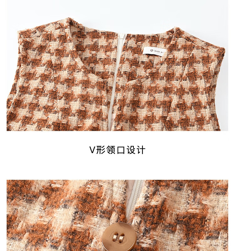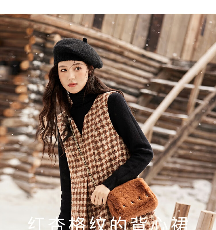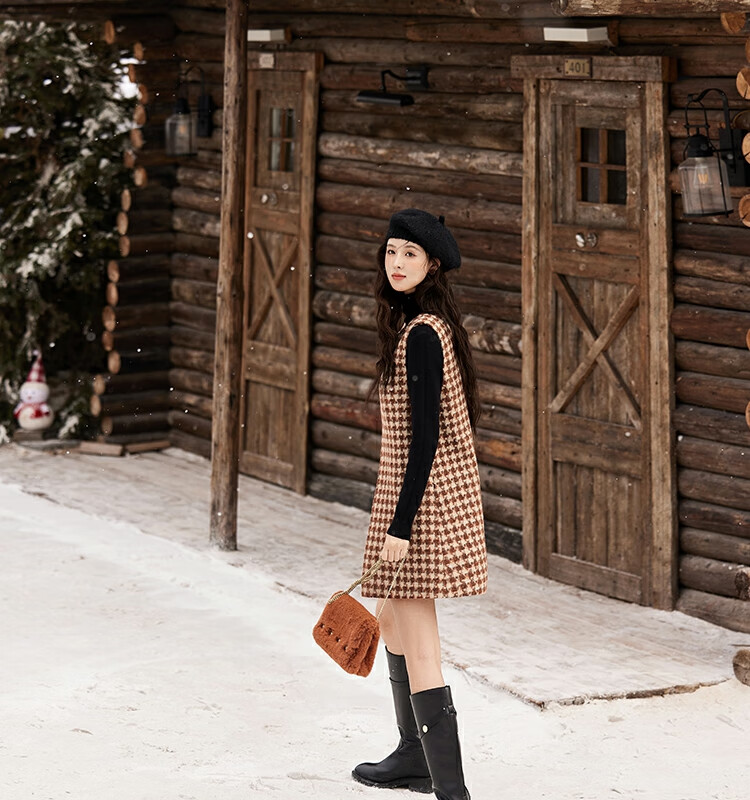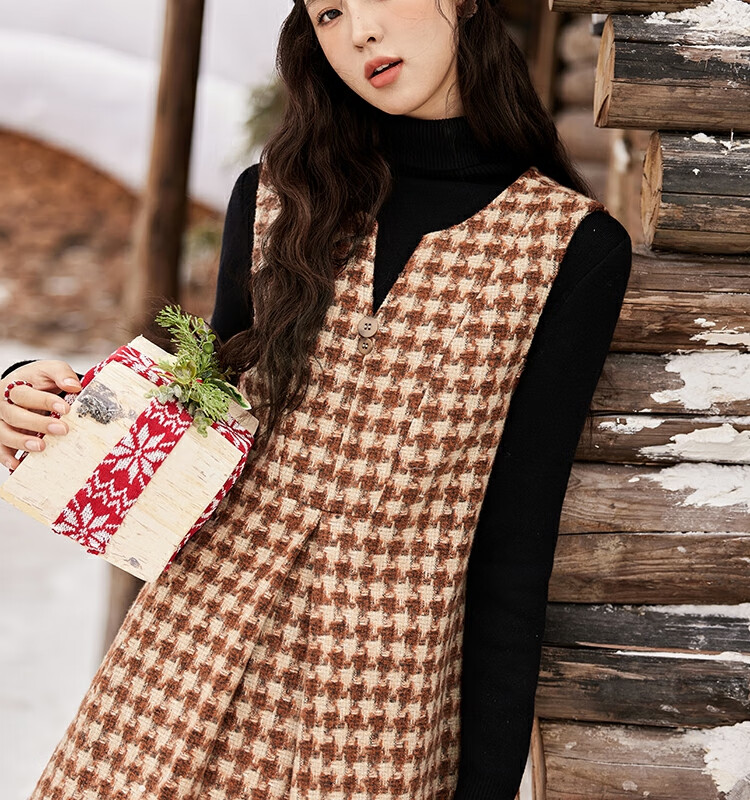谜秀小香风红色新年红千鸟格背心连衣裙女2025冬复古无袖V领裙子 复古红格 背心连衣裙 M