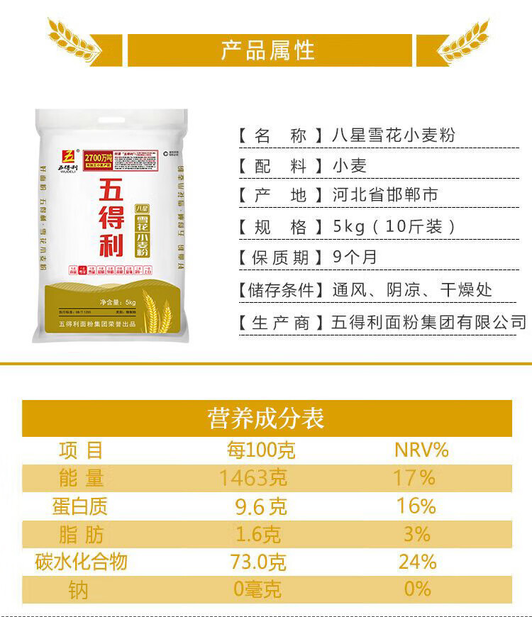 五得利面粉八星雪花麦芯小麦粉10斤 中筋多用途馒头饼面条