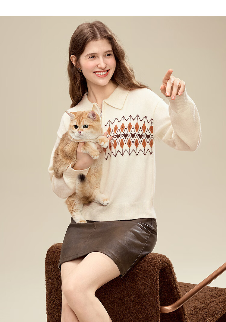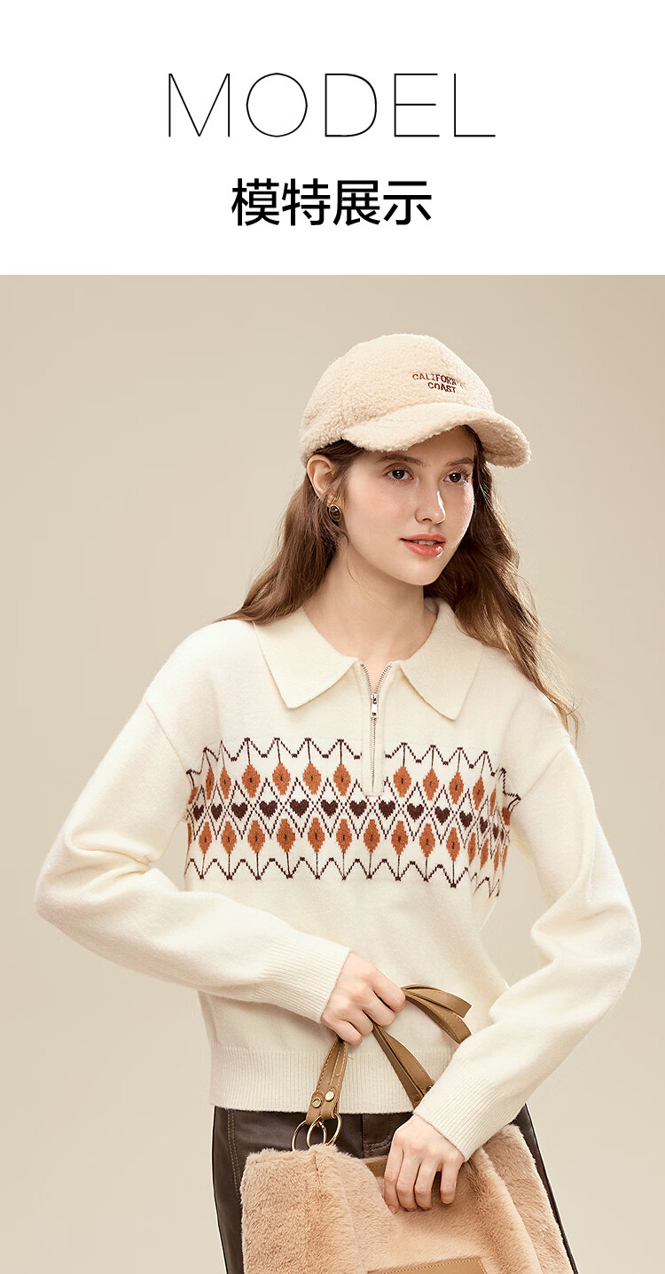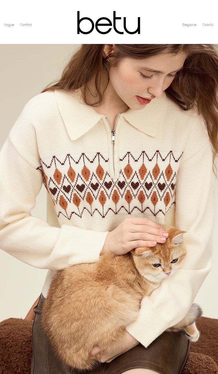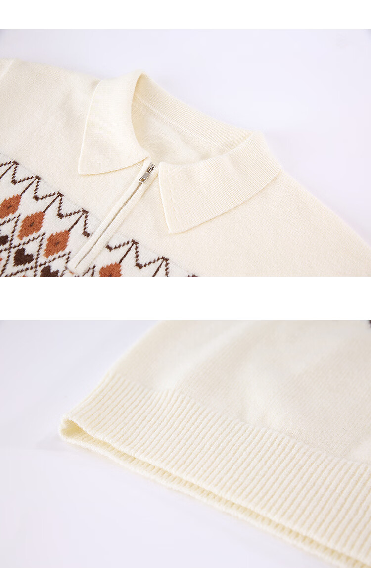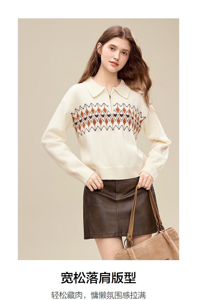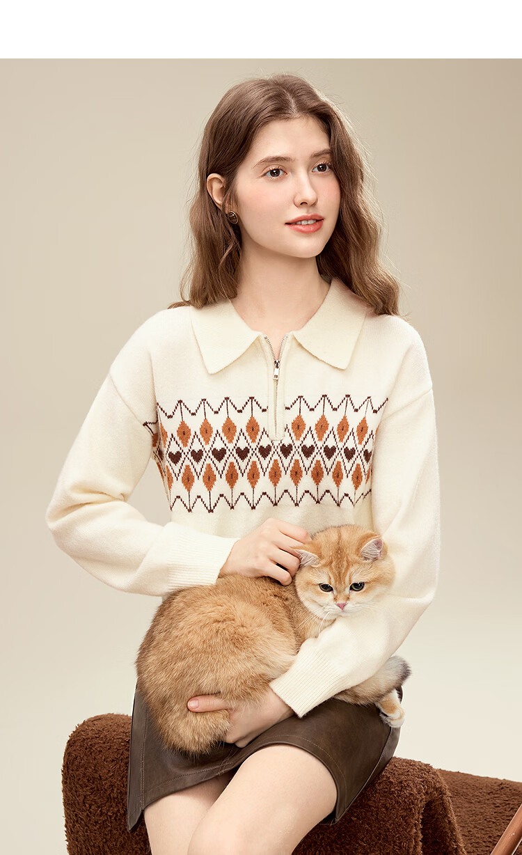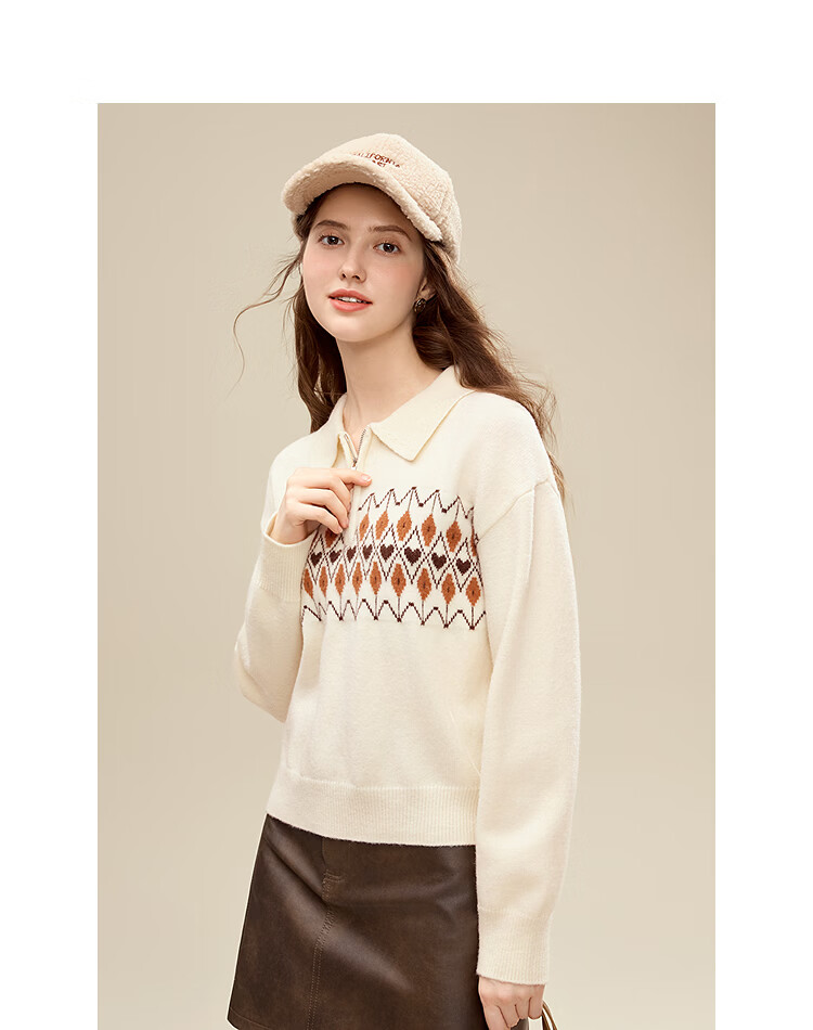 百图(betu)女装2025年冬季新款毛衣半拉链费尔岛提花设计长袖上衣女2510X12 浅杏色 S