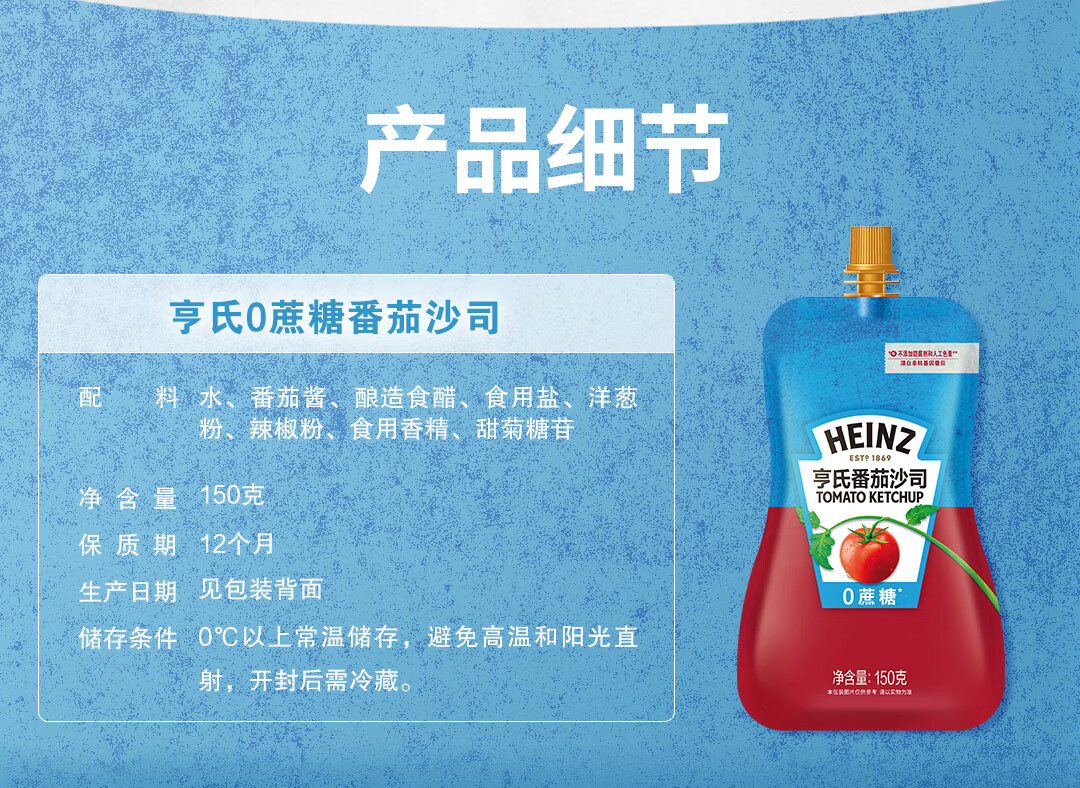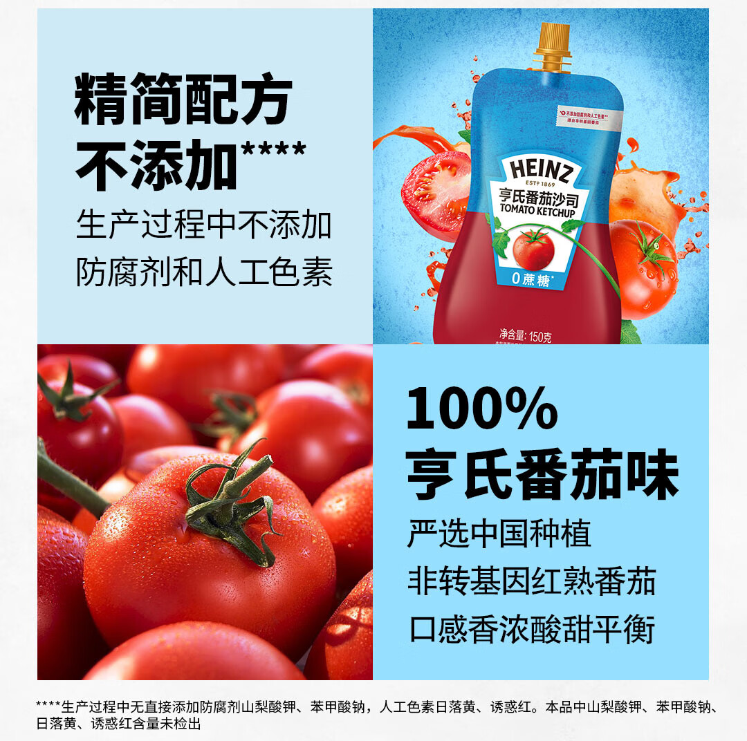 亨氏(Heinz) 番茄酱 0蔗糖0脂肪番茄沙司袋150g意大利面薯条披萨蘸酱