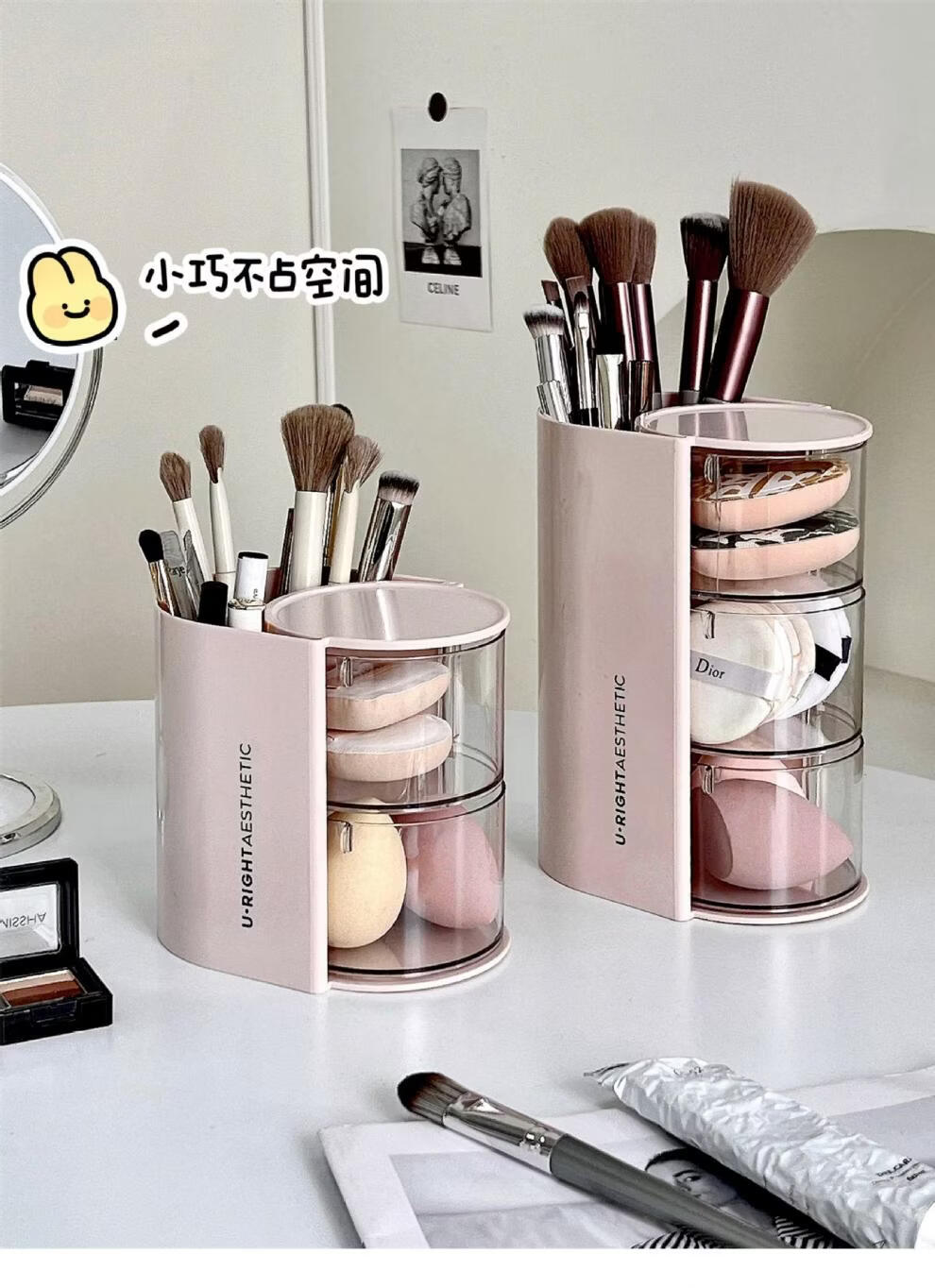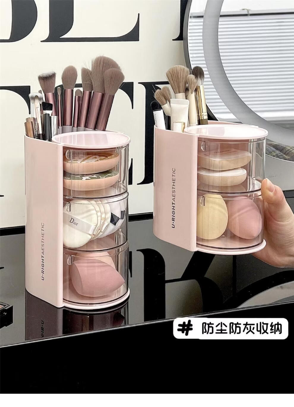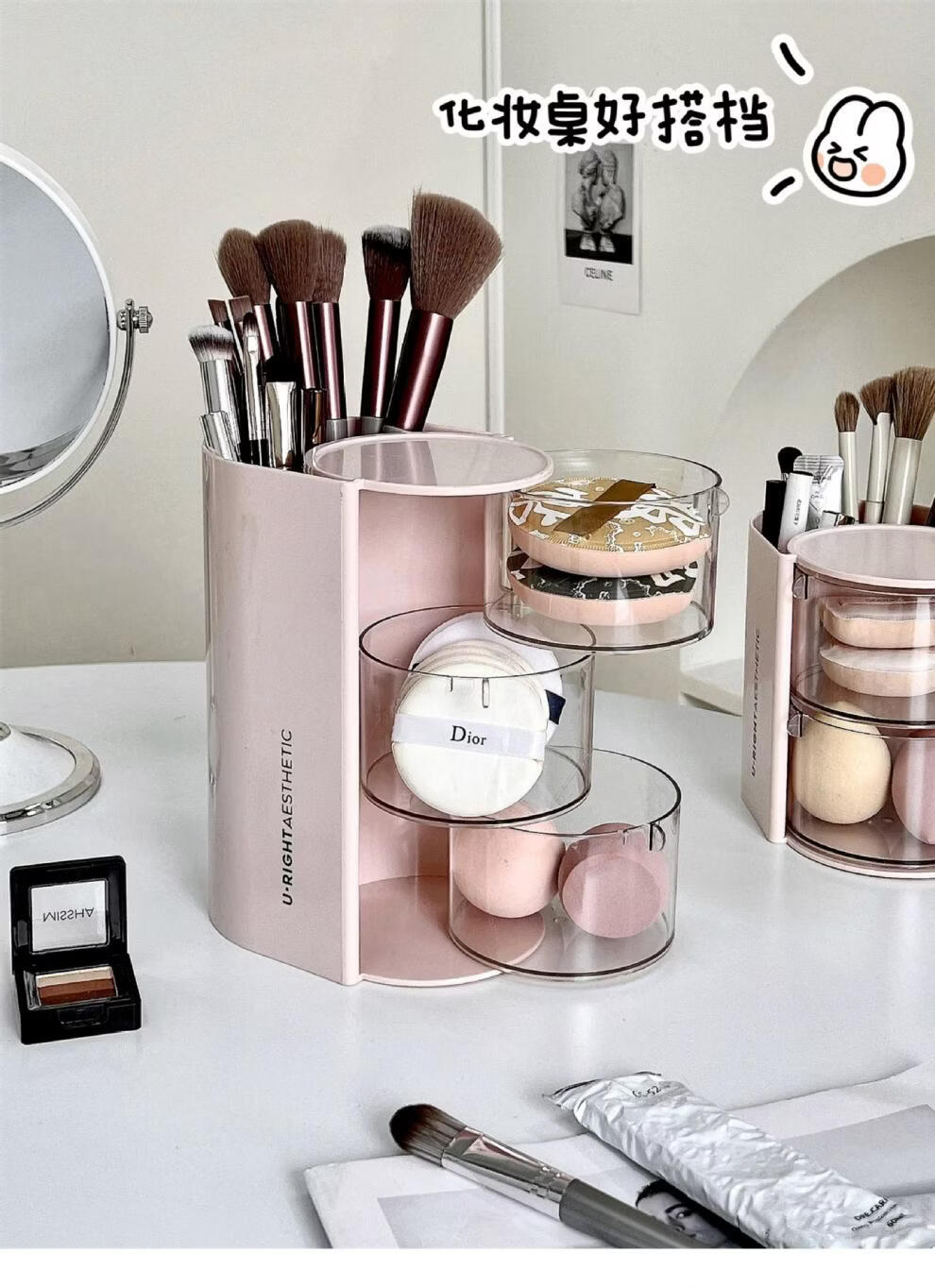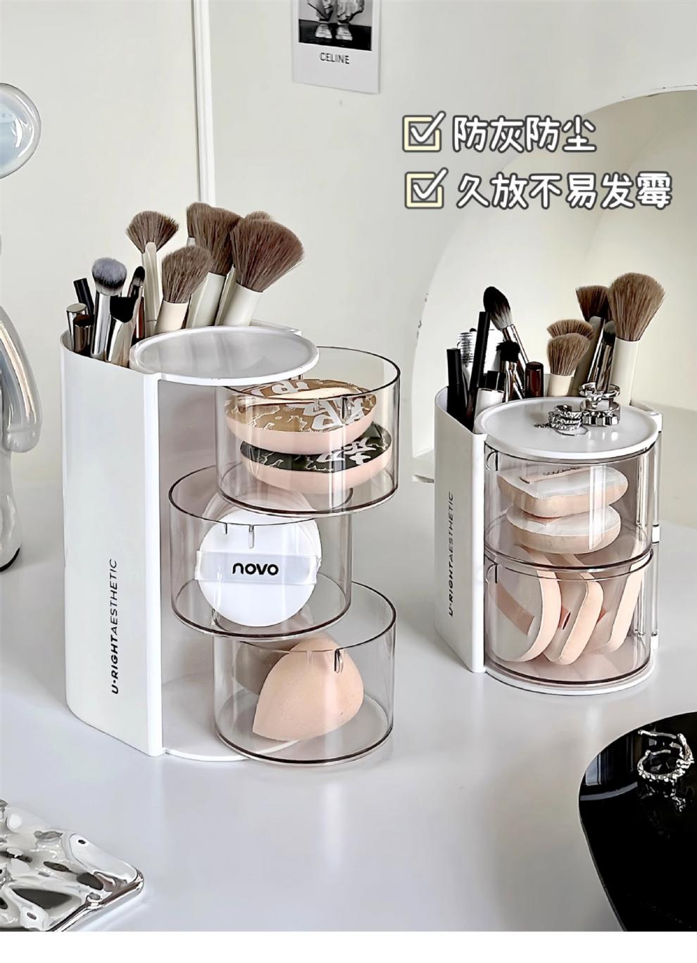 旋转粉扑收纳盒防尘美妆蛋口红刷架 分格旋转收纳盒-3层粉色