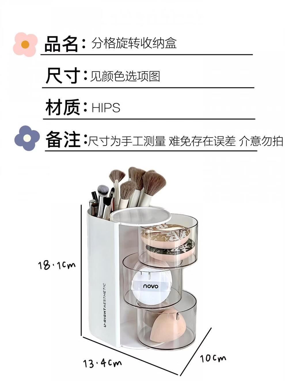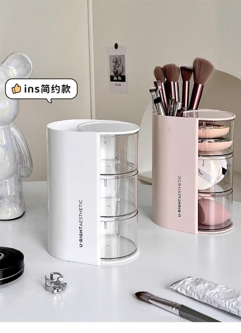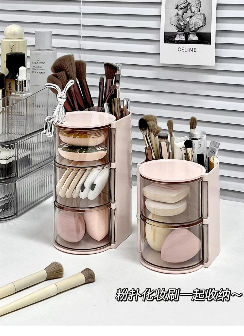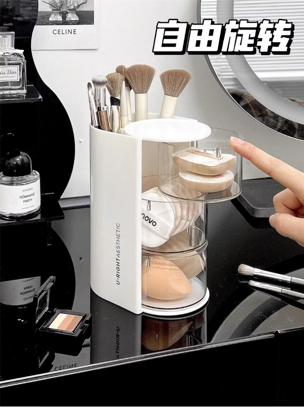 旋转粉扑收纳盒防尘美妆蛋口红刷架 分格旋转收纳盒-3层粉色