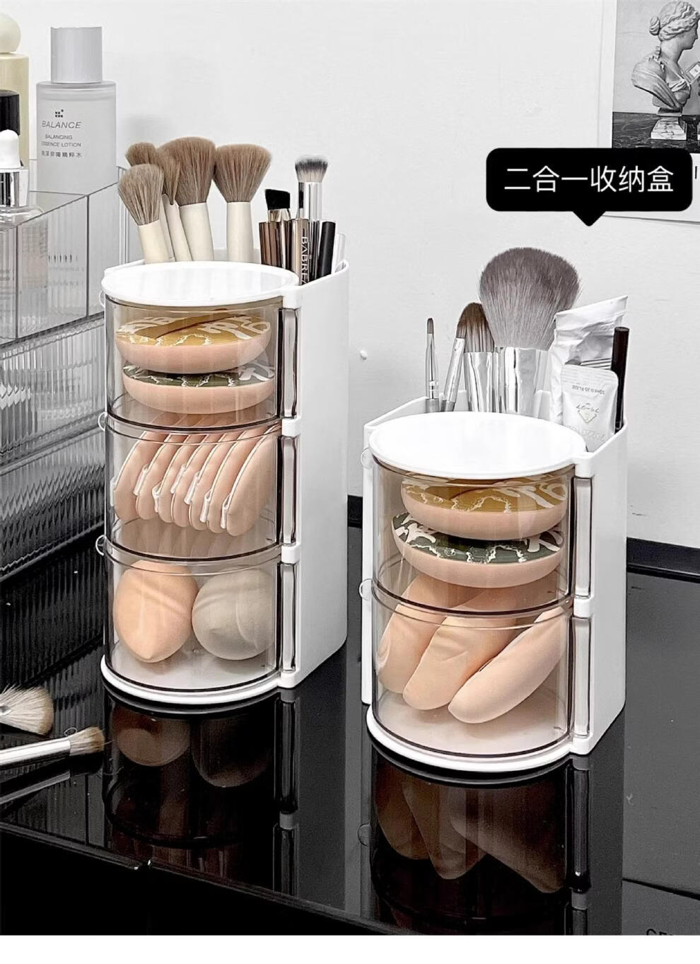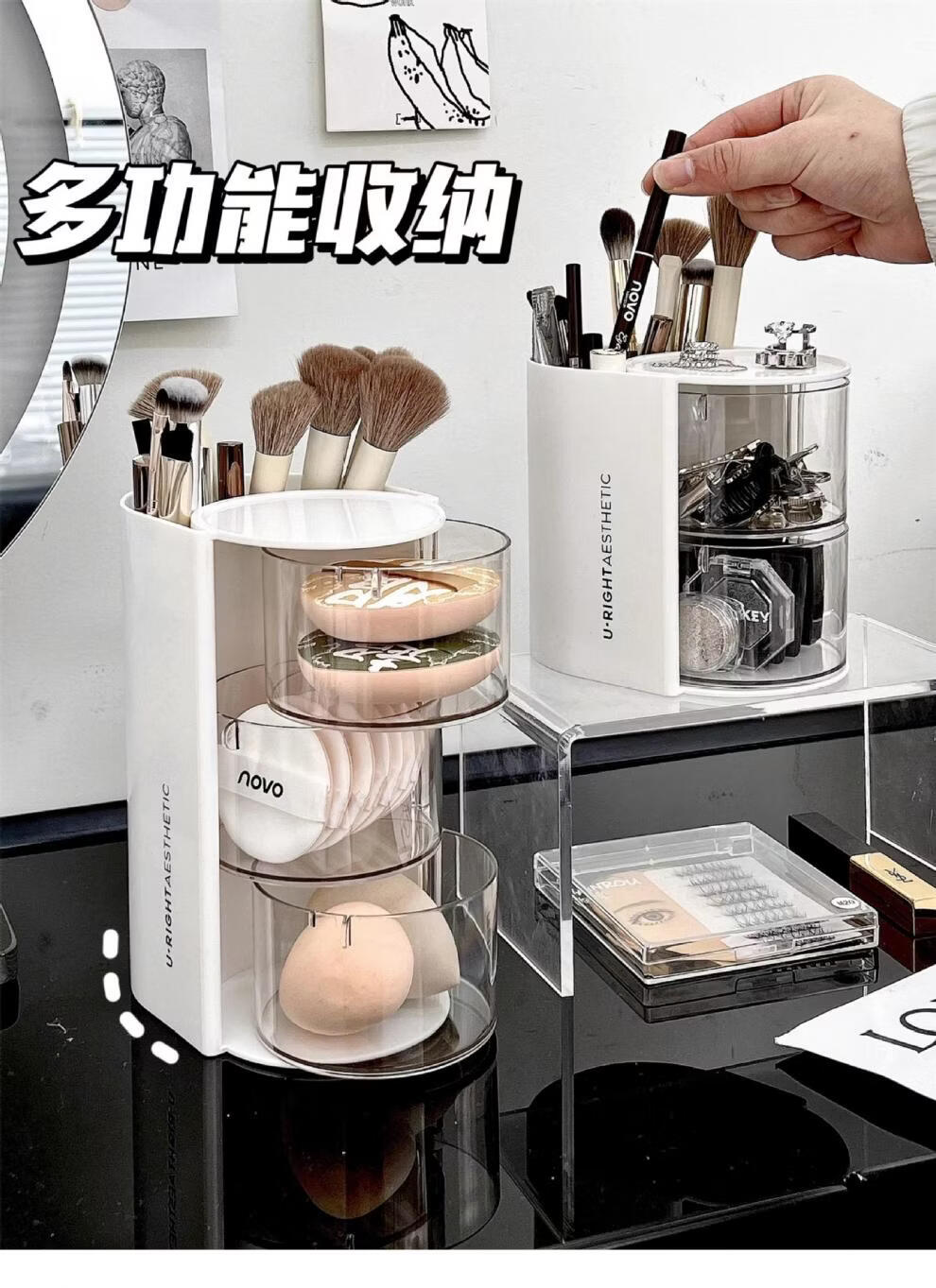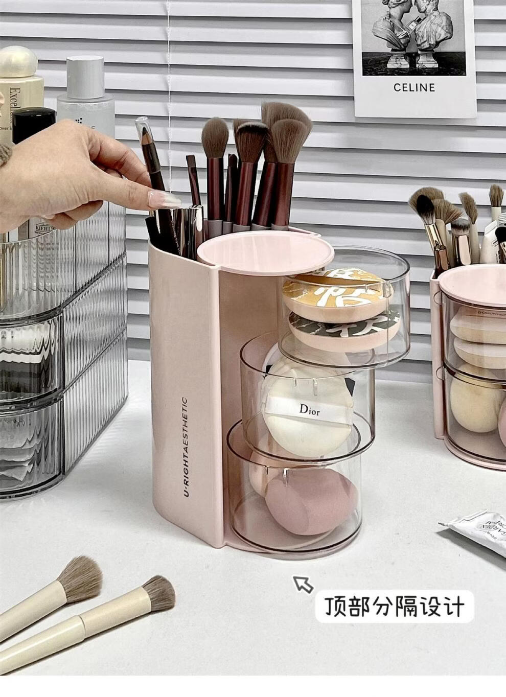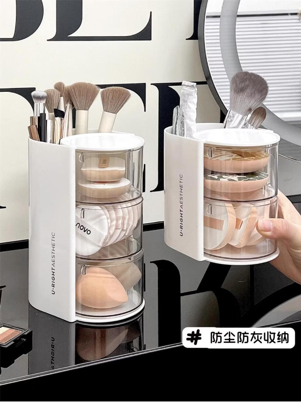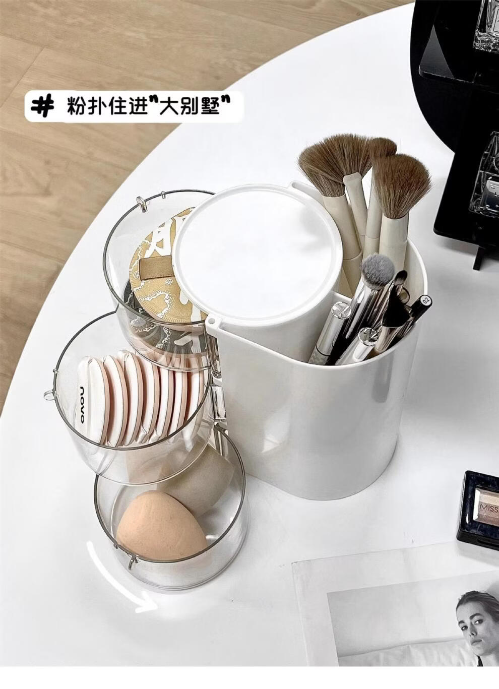 旋转粉扑收纳盒防尘美妆蛋口红刷架 分格旋转收纳盒-3层粉色