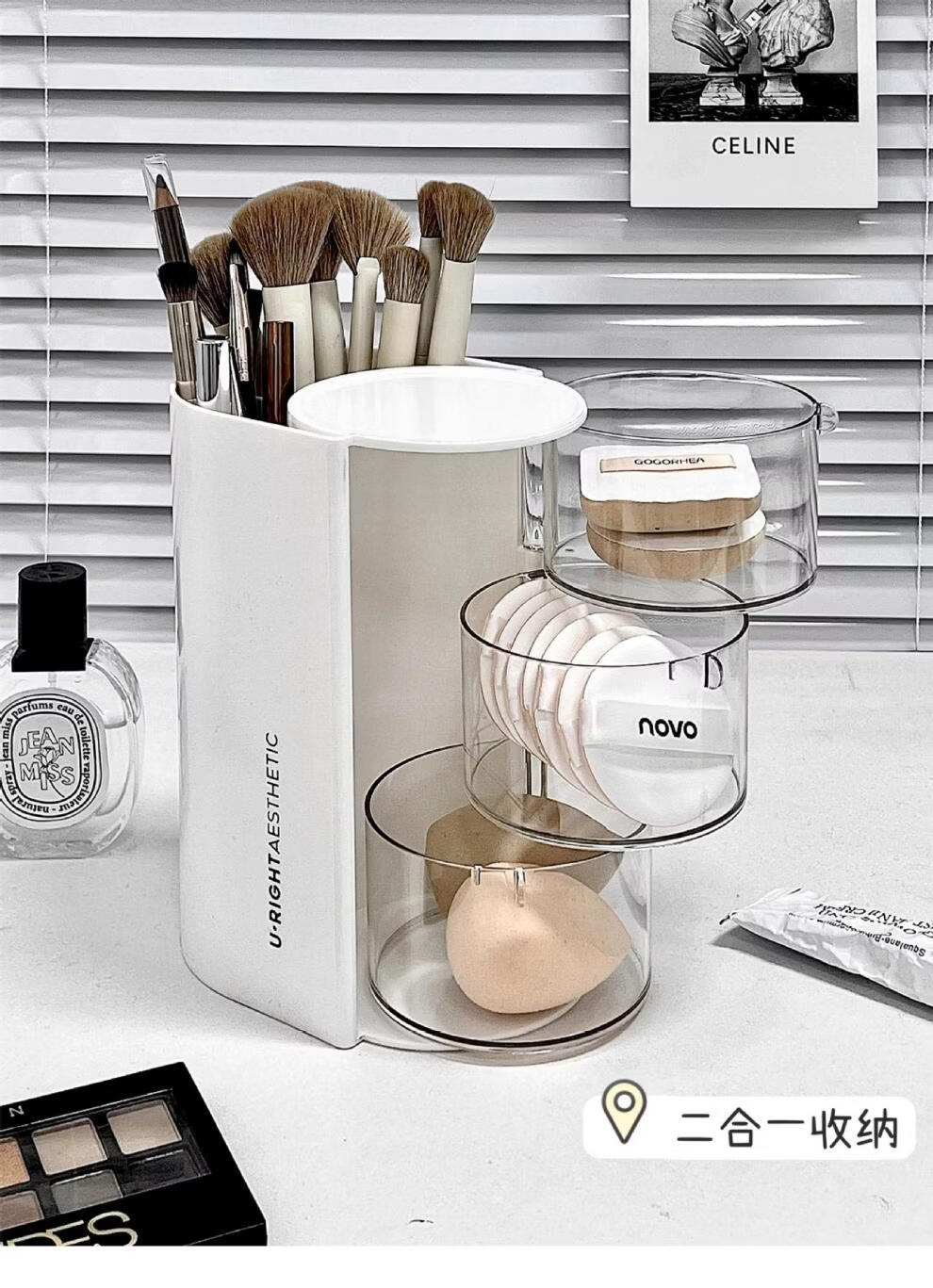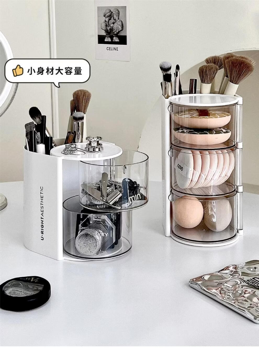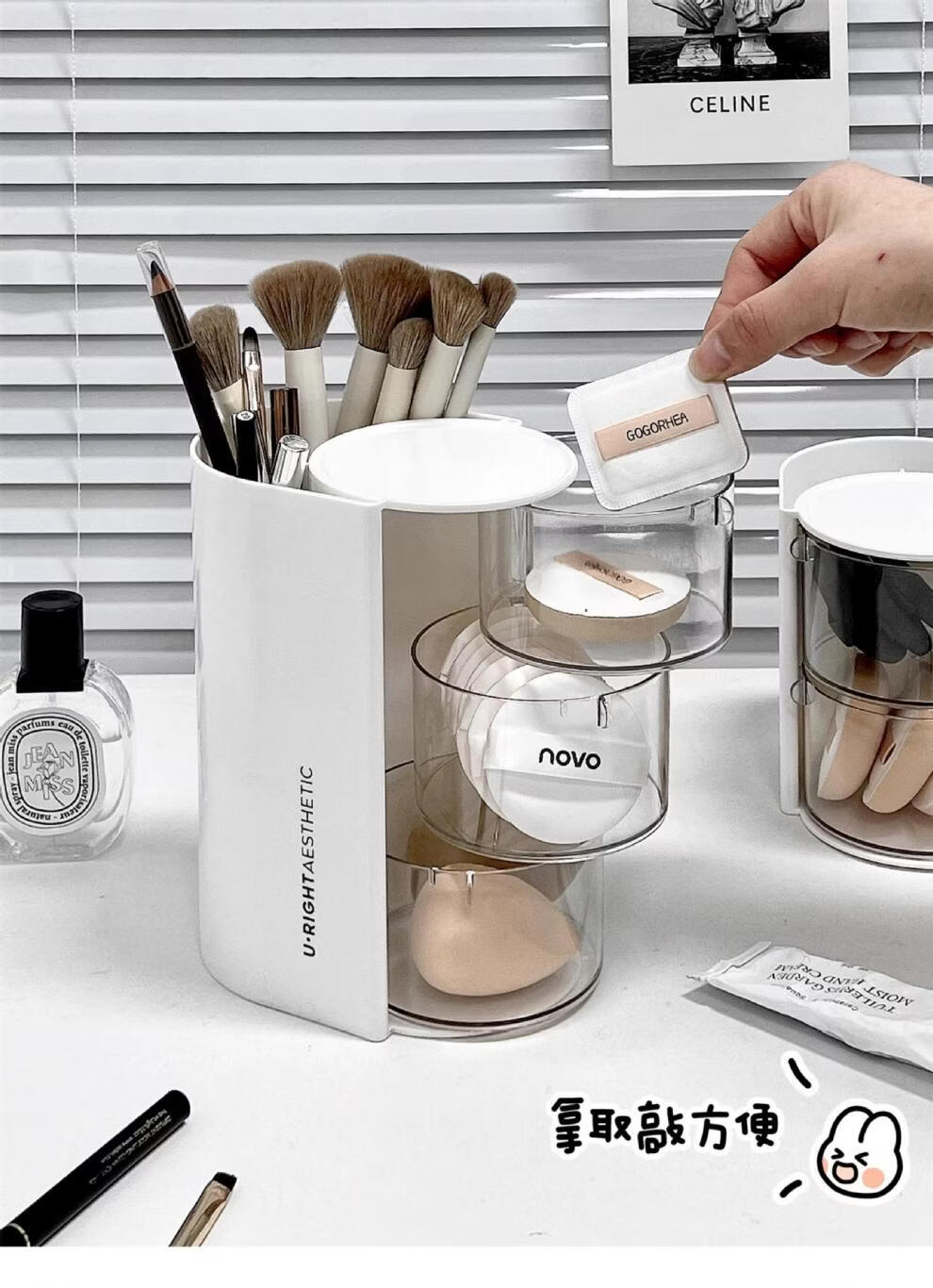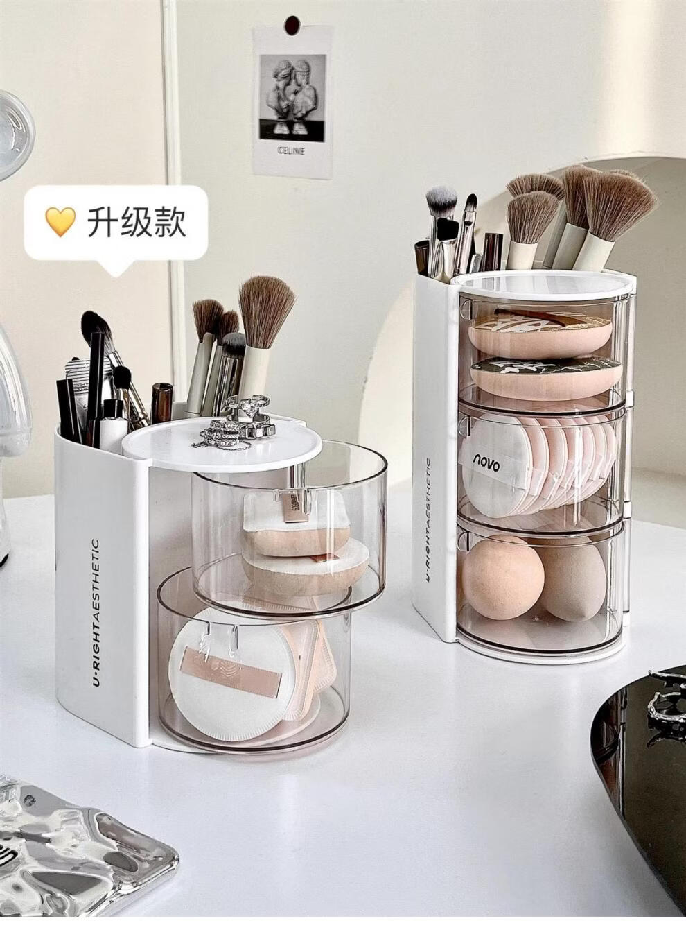 旋转粉扑收纳盒防尘美妆蛋口红刷架 分格旋转收纳盒-3层粉色