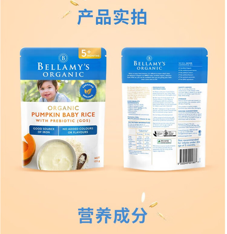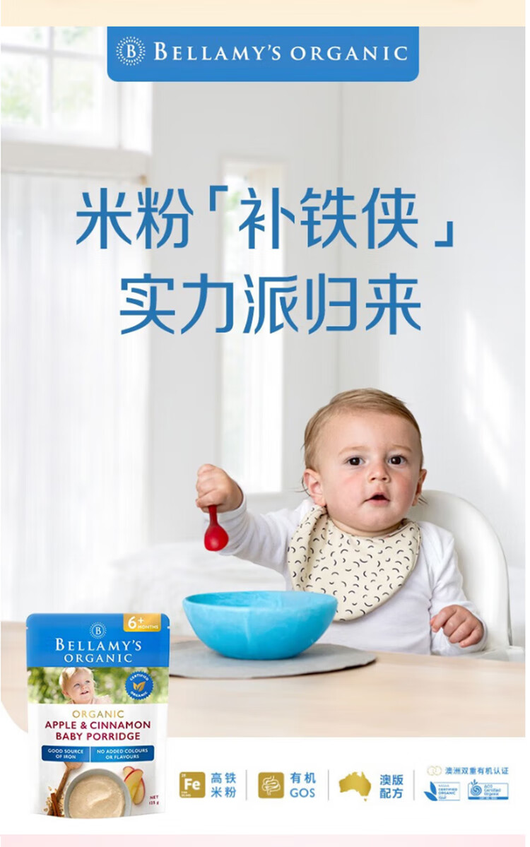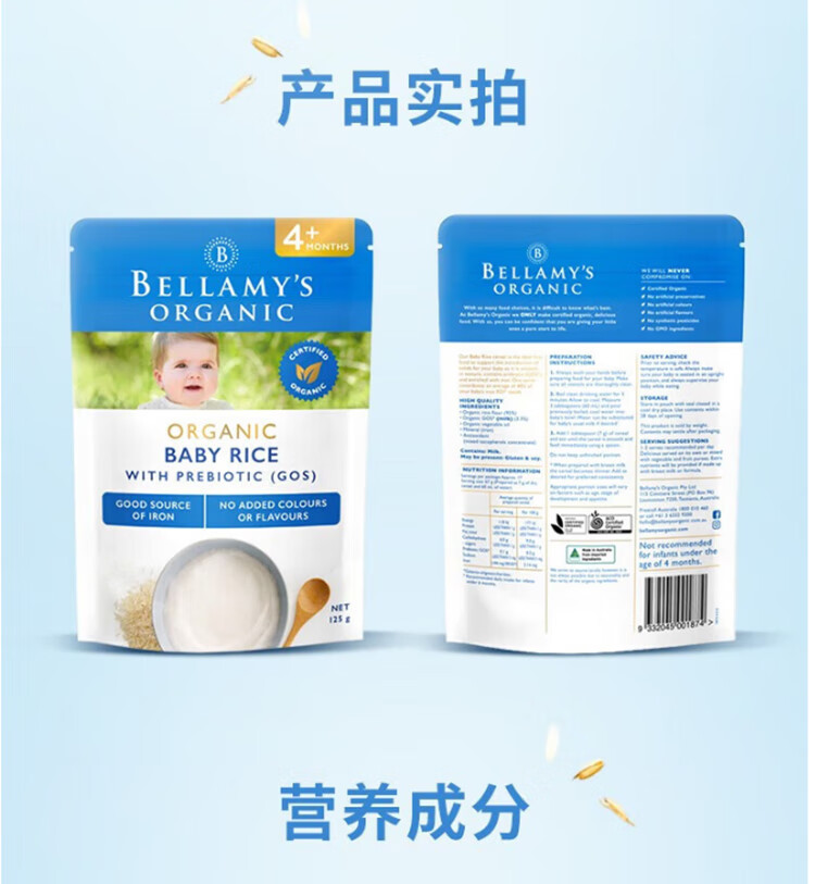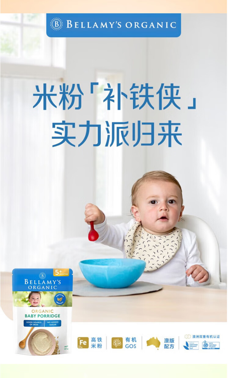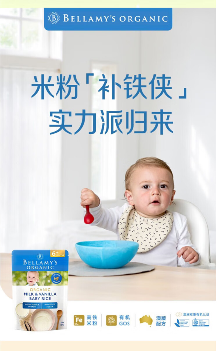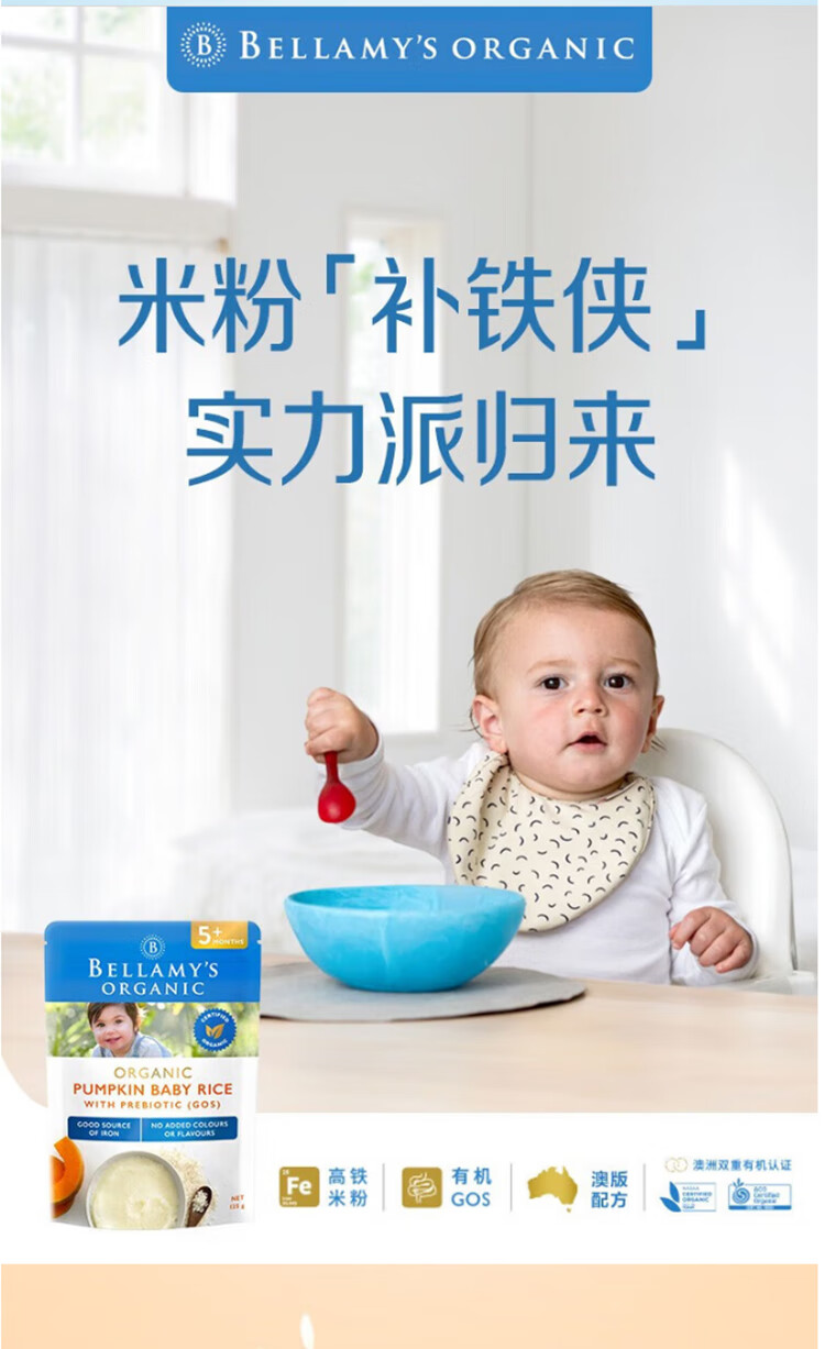 贝拉米(Bellamy's)贝拉米米粉婴儿高铁米糊宝宝营养辅食有机米粉125g澳洲进口 【原味4+】 效期26.11月