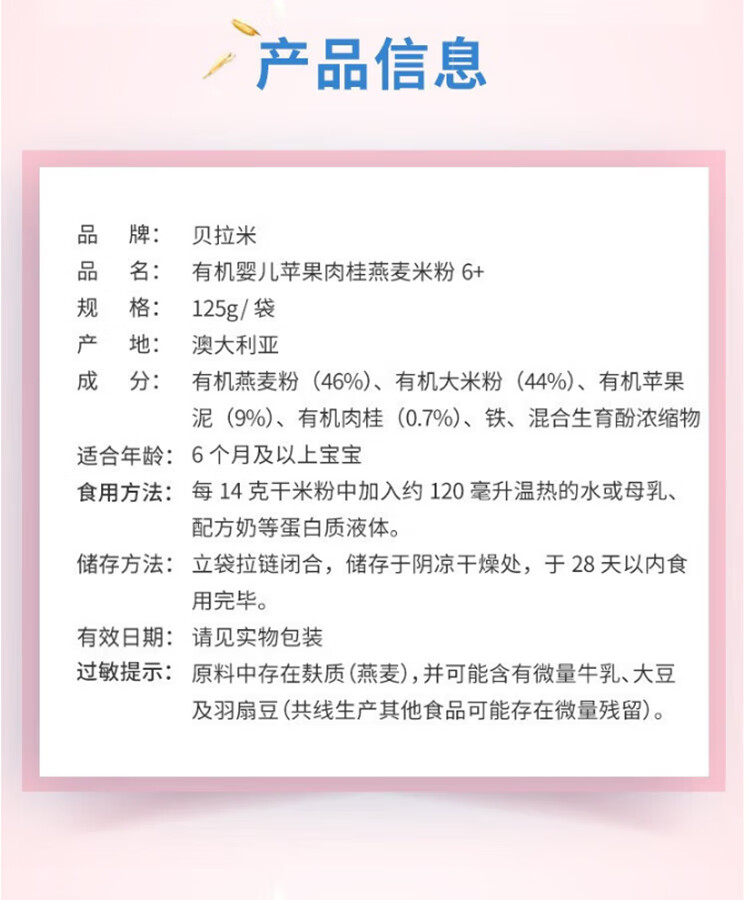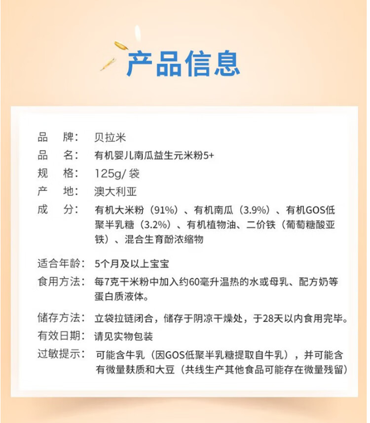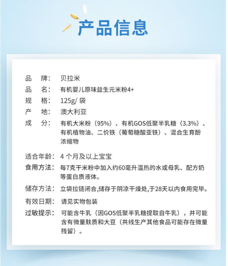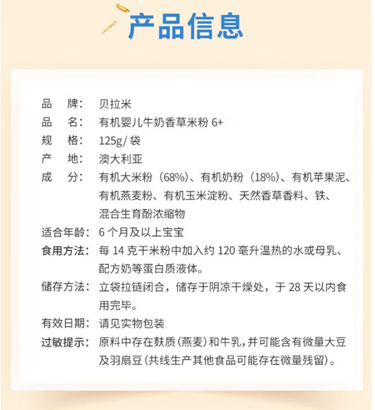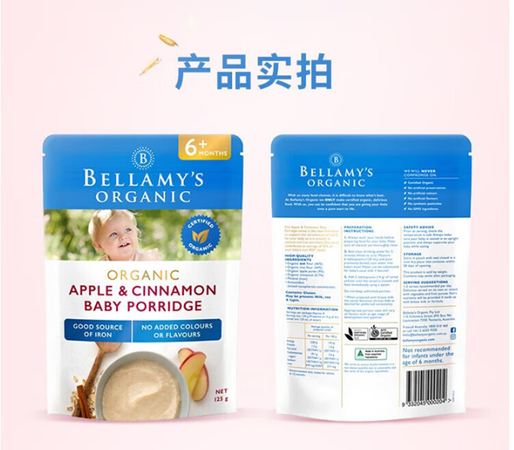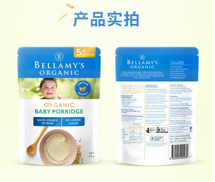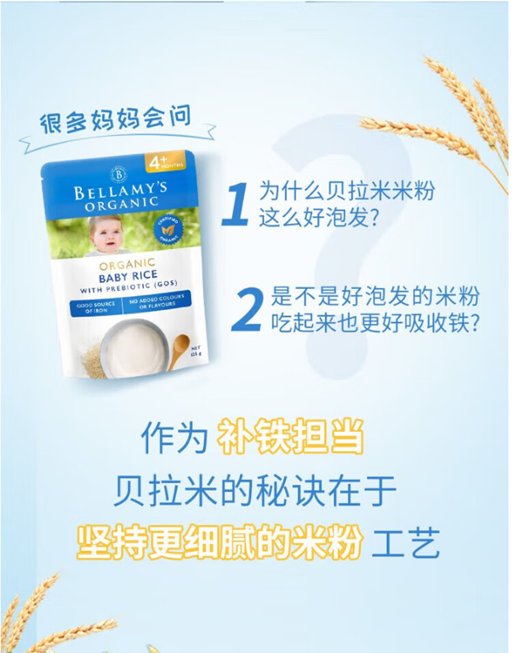 贝拉米(Bellamy's)贝拉米米粉婴儿高铁米糊宝宝营养辅食有机米粉125g澳洲进口 【原味4+】 效期26.11月