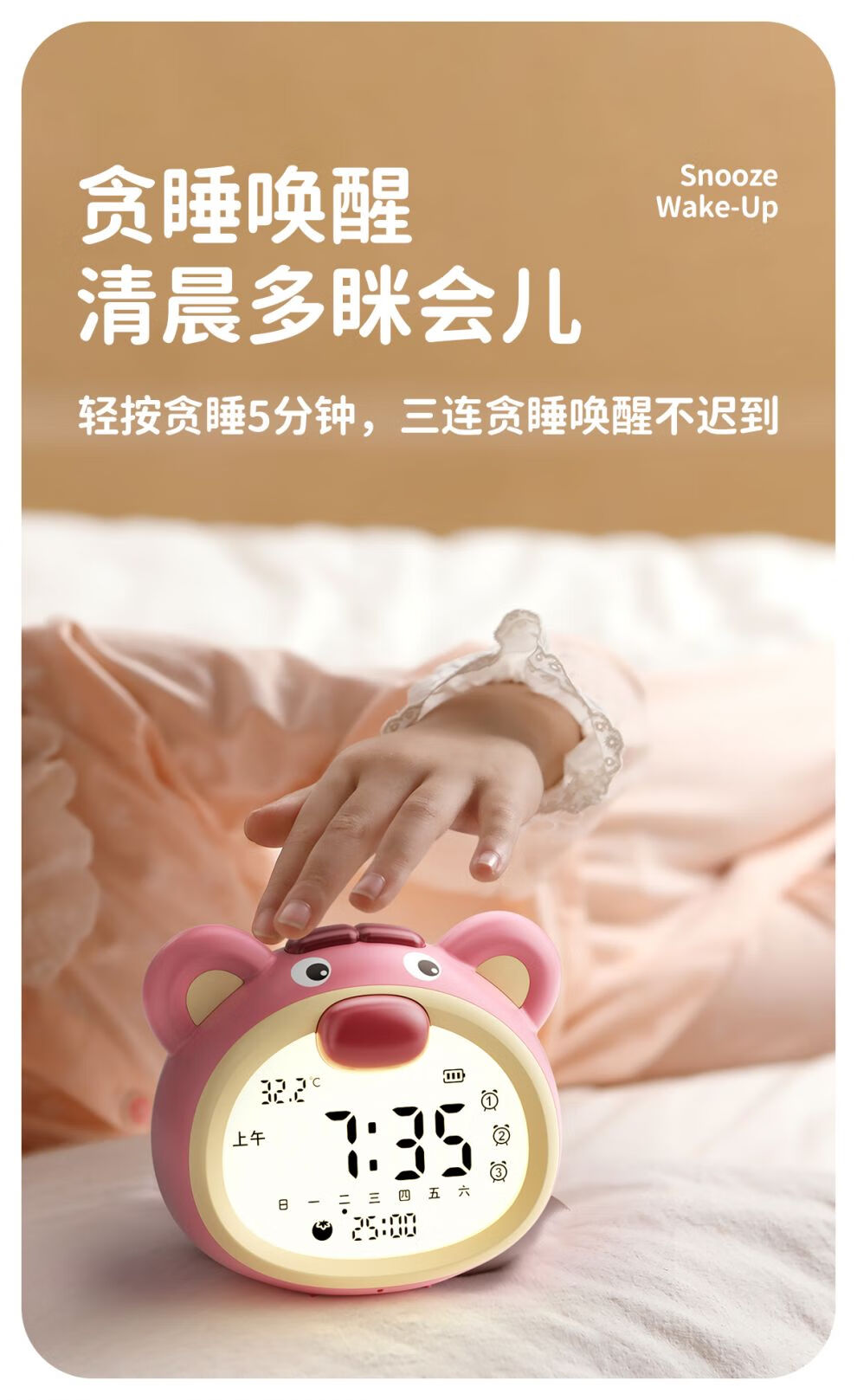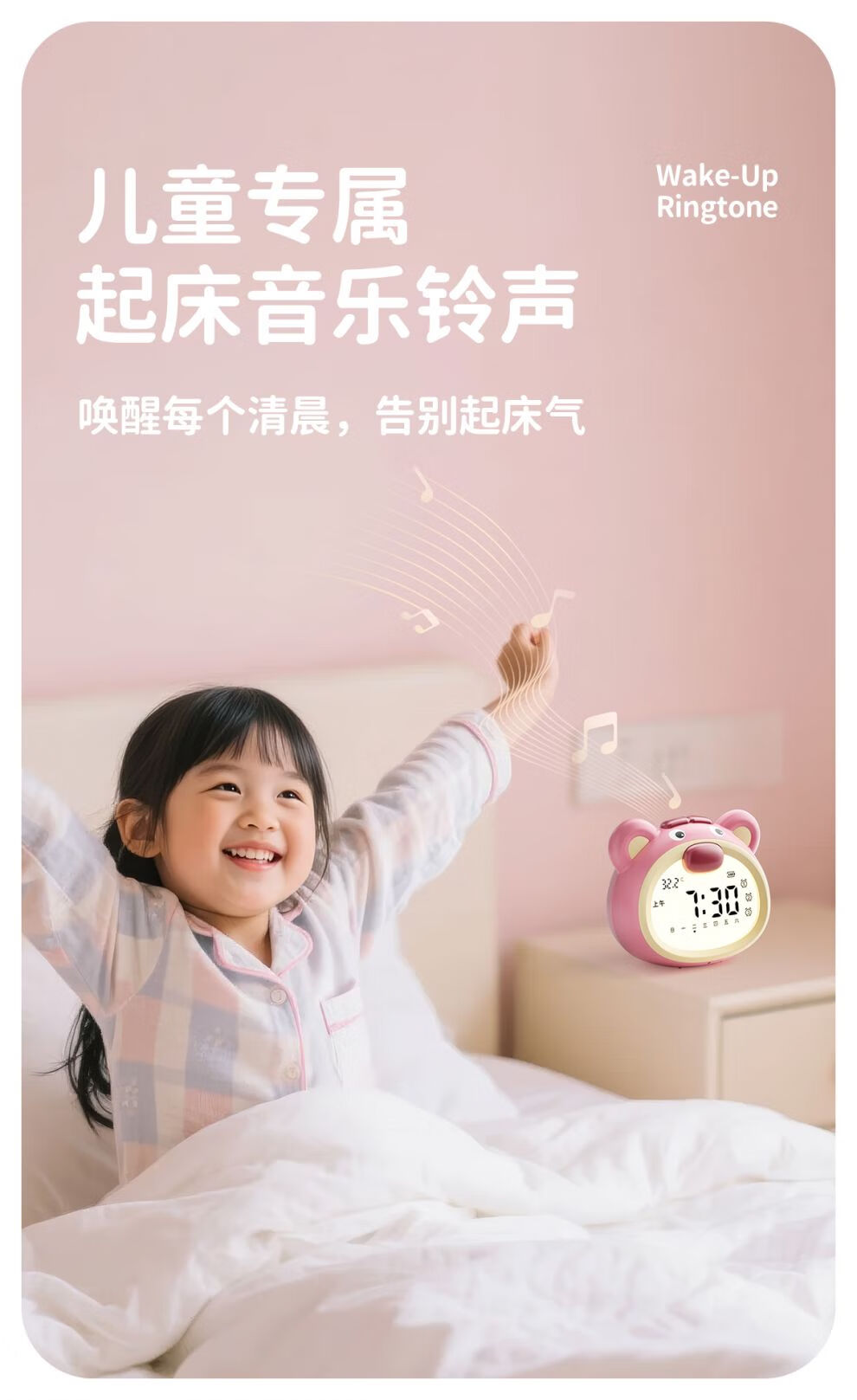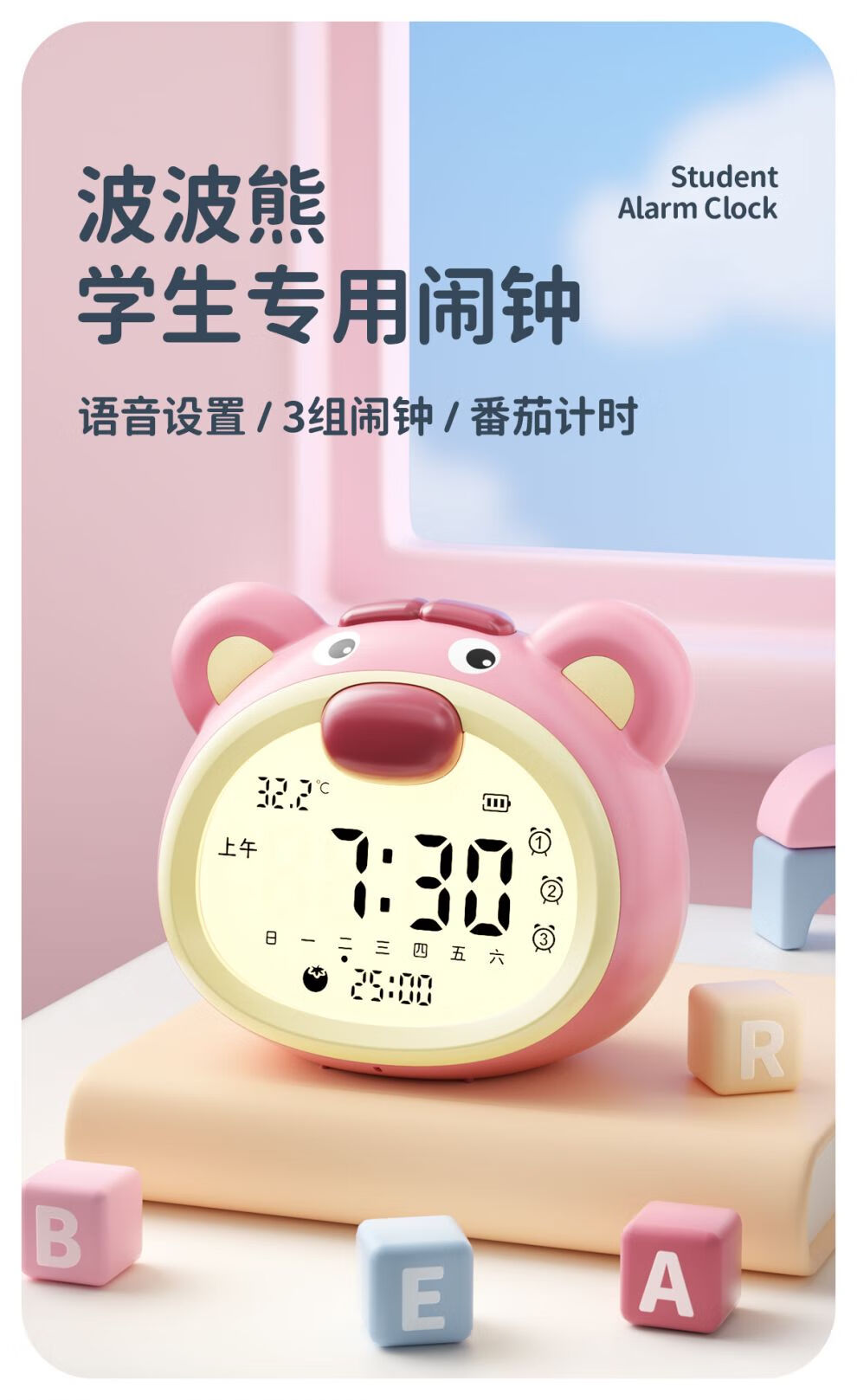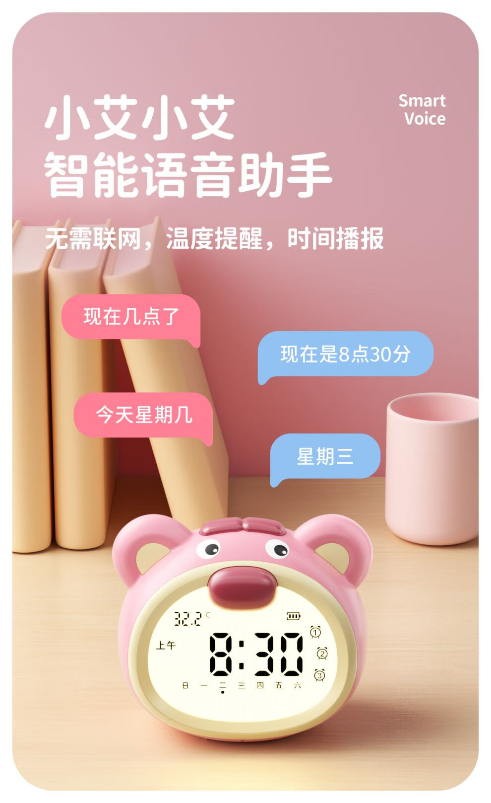 咪咪兔闹钟2025新款智能语音控制学生专用起床神器儿童女孩番茄计时钟 波波熊粉色【语音设置_3组闹钟_a