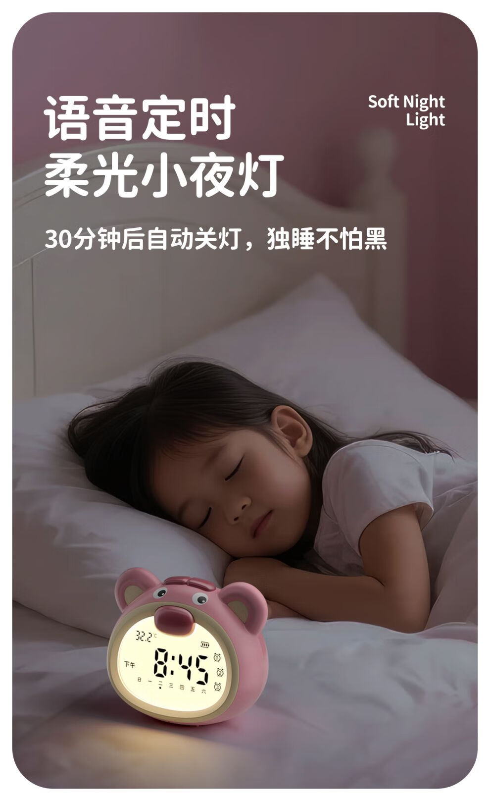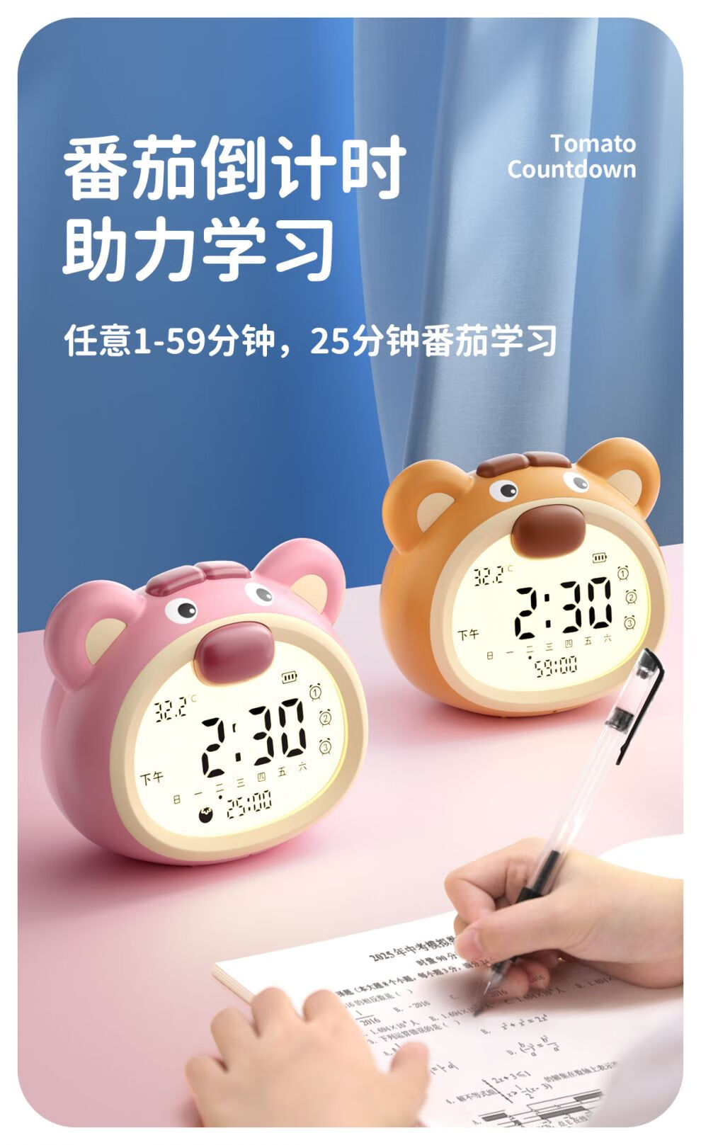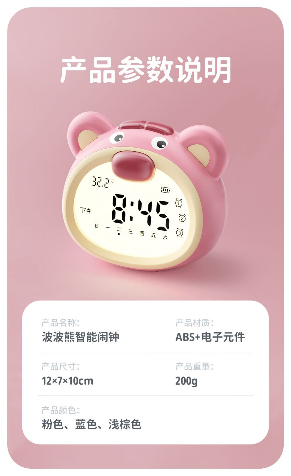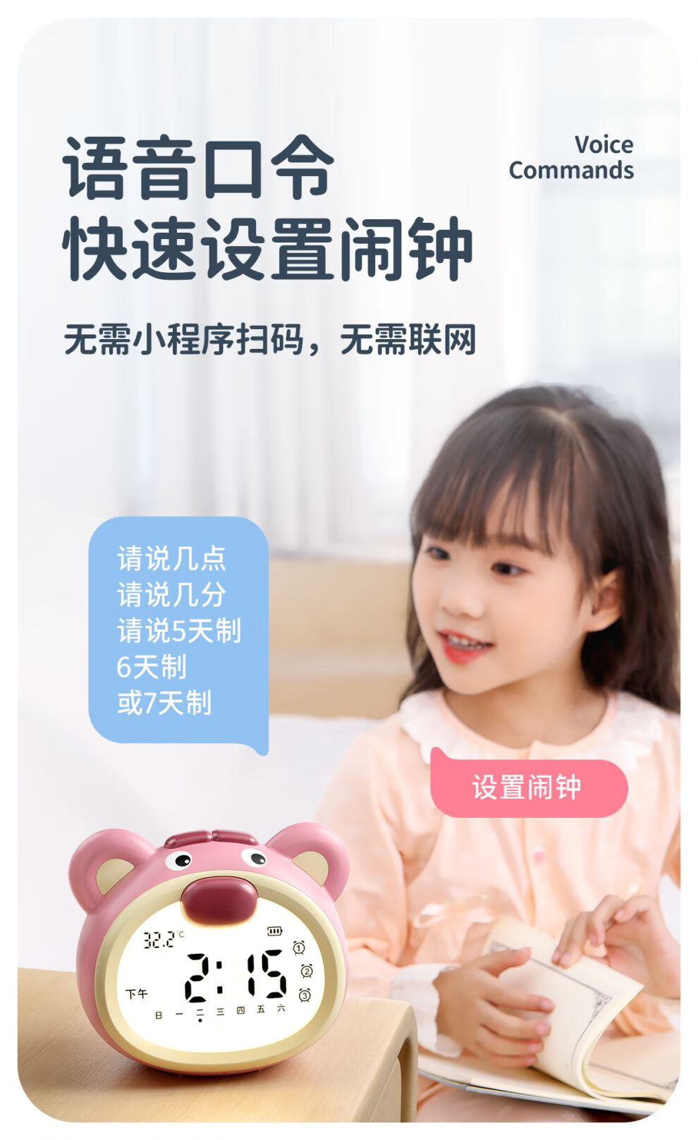 咪咪兔闹钟2025新款智能语音控制学生专用起床神器儿童女孩番茄计时钟 波波熊粉色【语音设置_3组闹钟_a