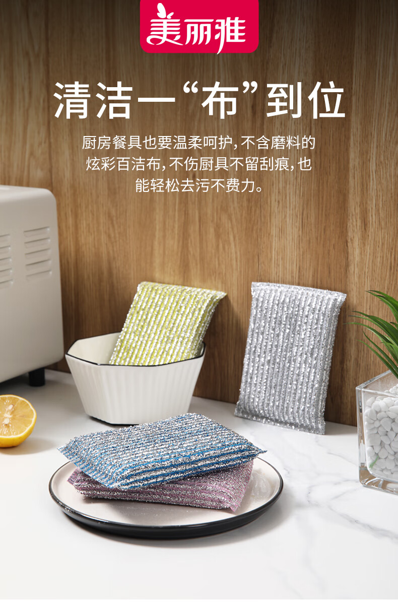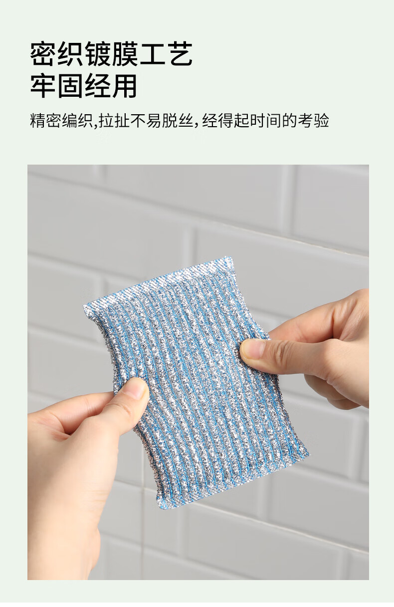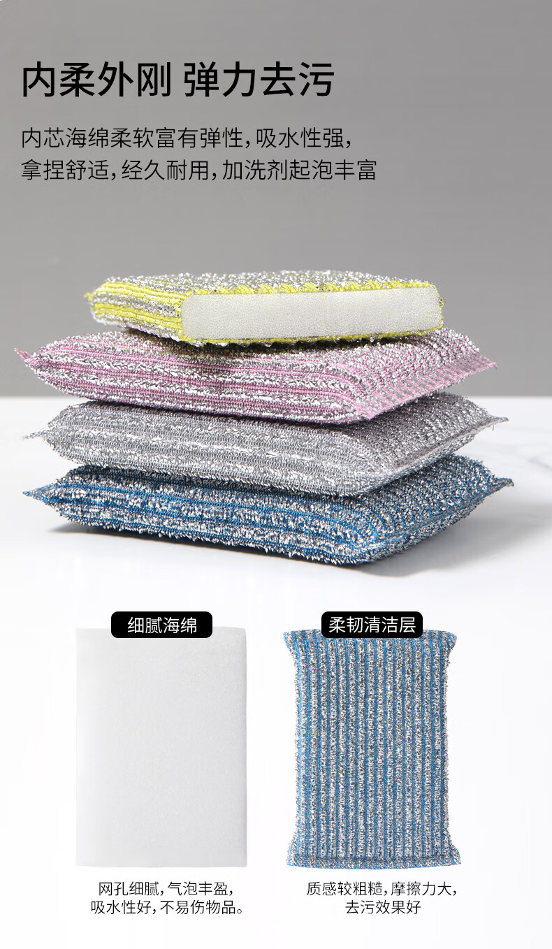 美丽雅洗碗海绵百洁布4块钢丝抹布洗碗不掉丝去油污刷厨具厨房家用神器