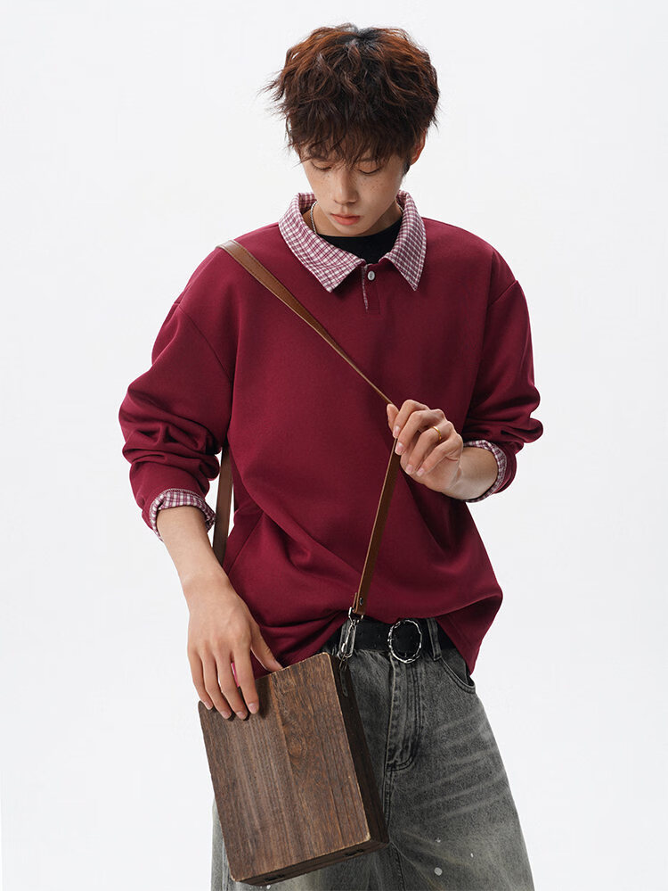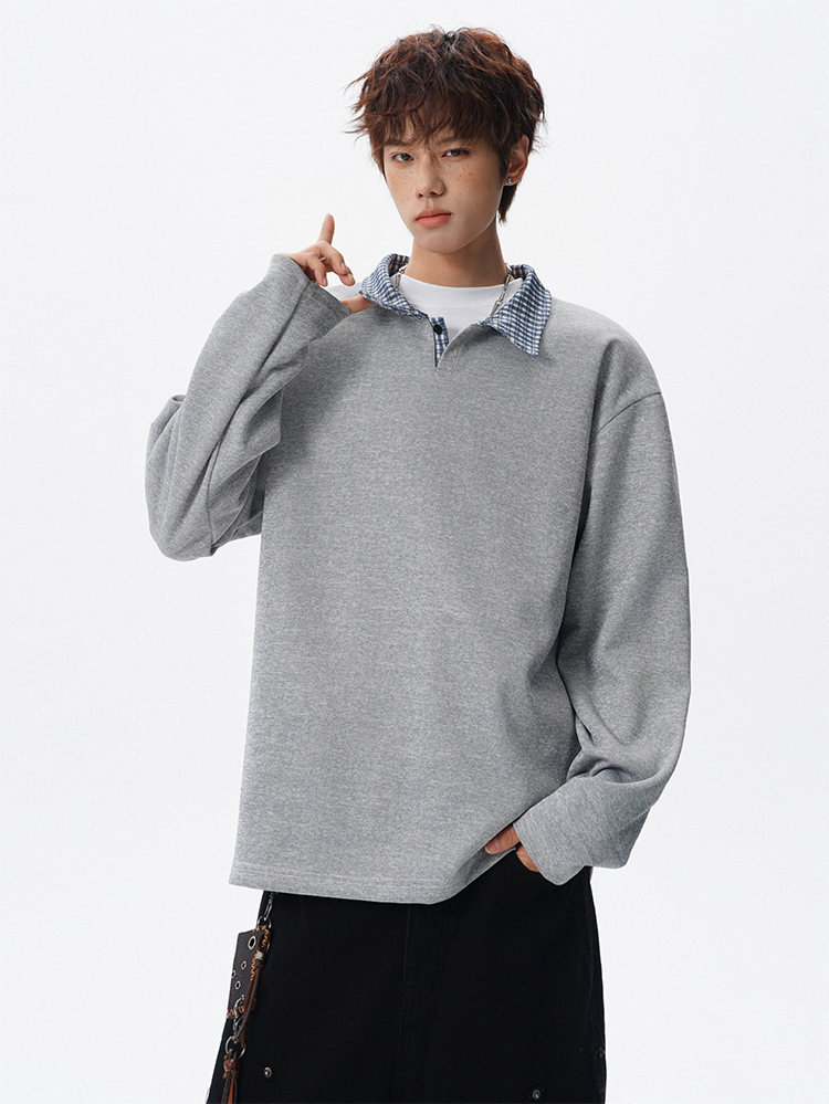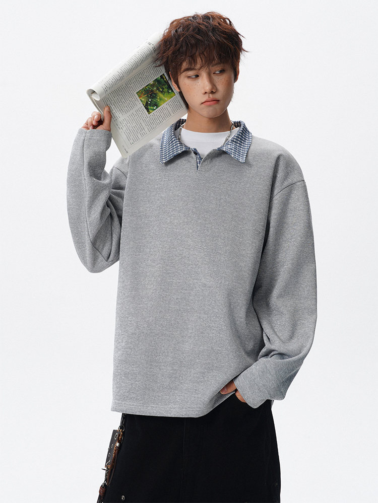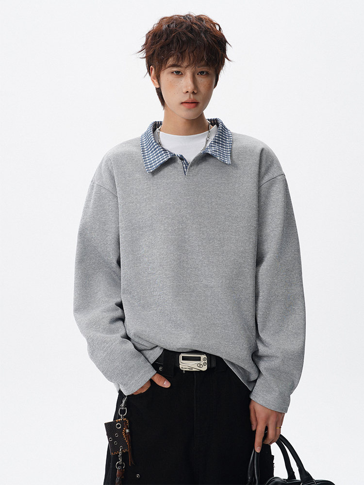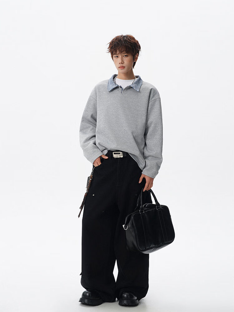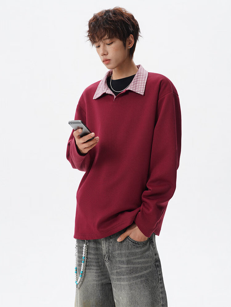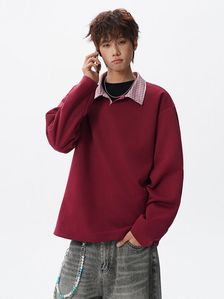 君茵格子撞色翻领卫衣男款春秋季老钱风重磅情侣长袖t恤男宽松上衣服 深灰色 XL