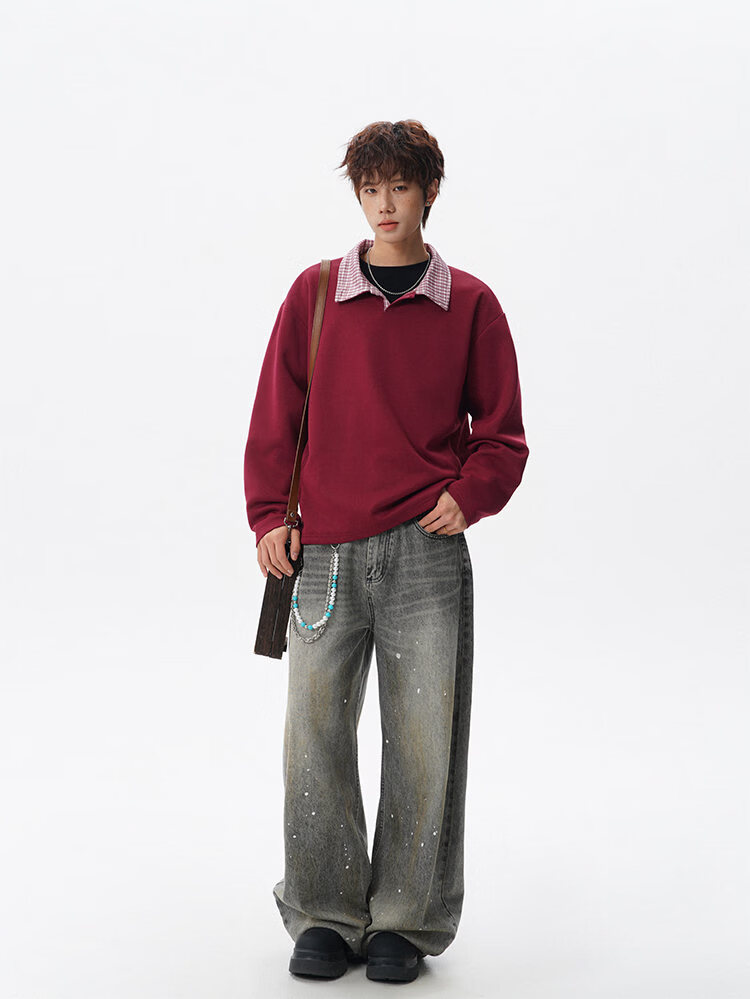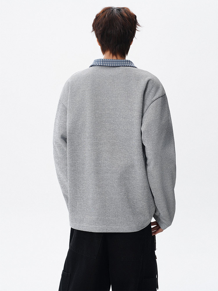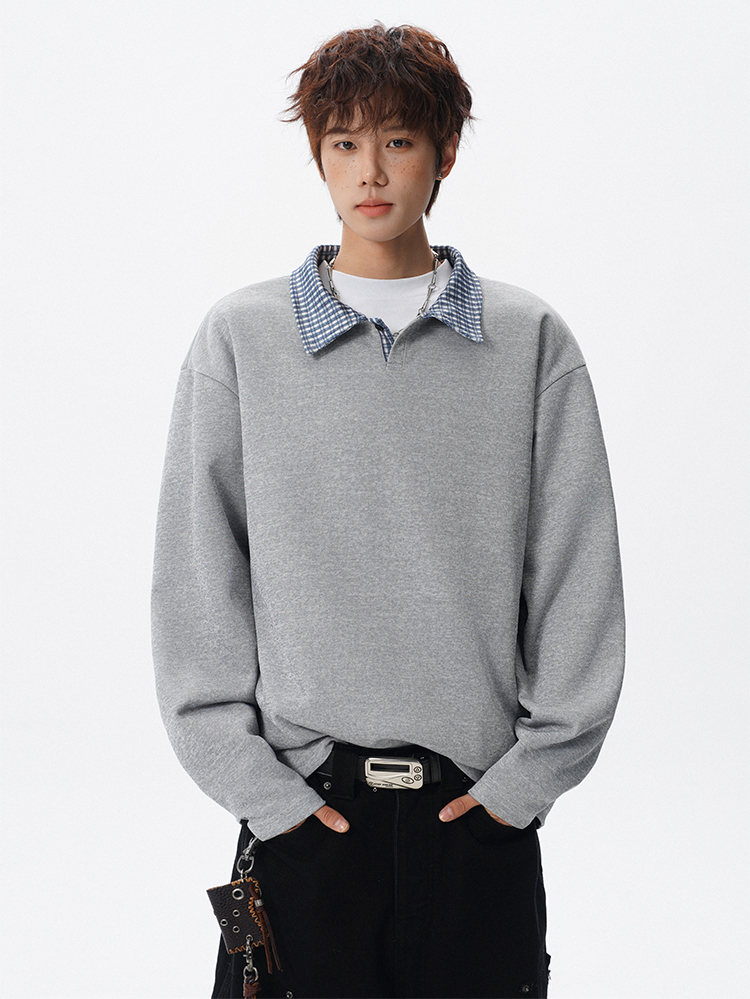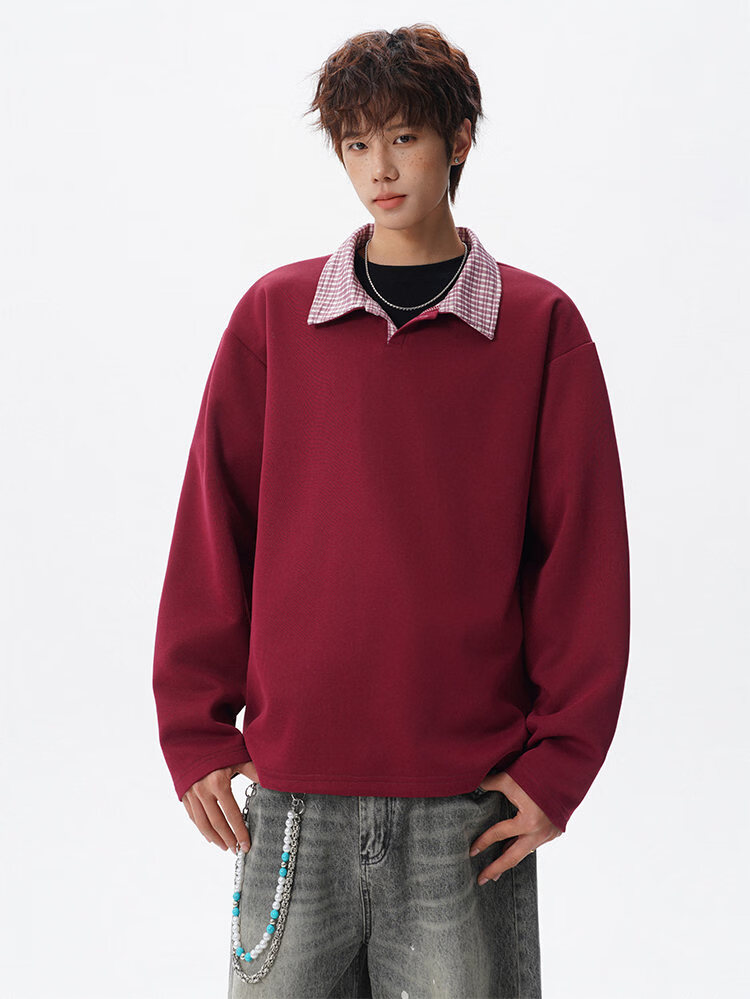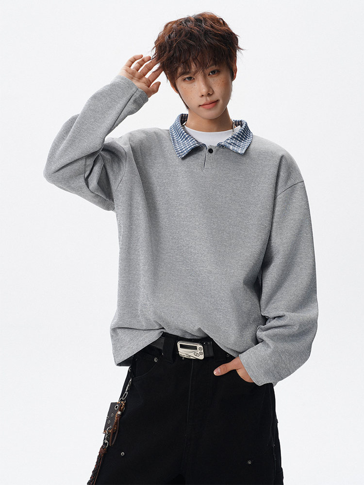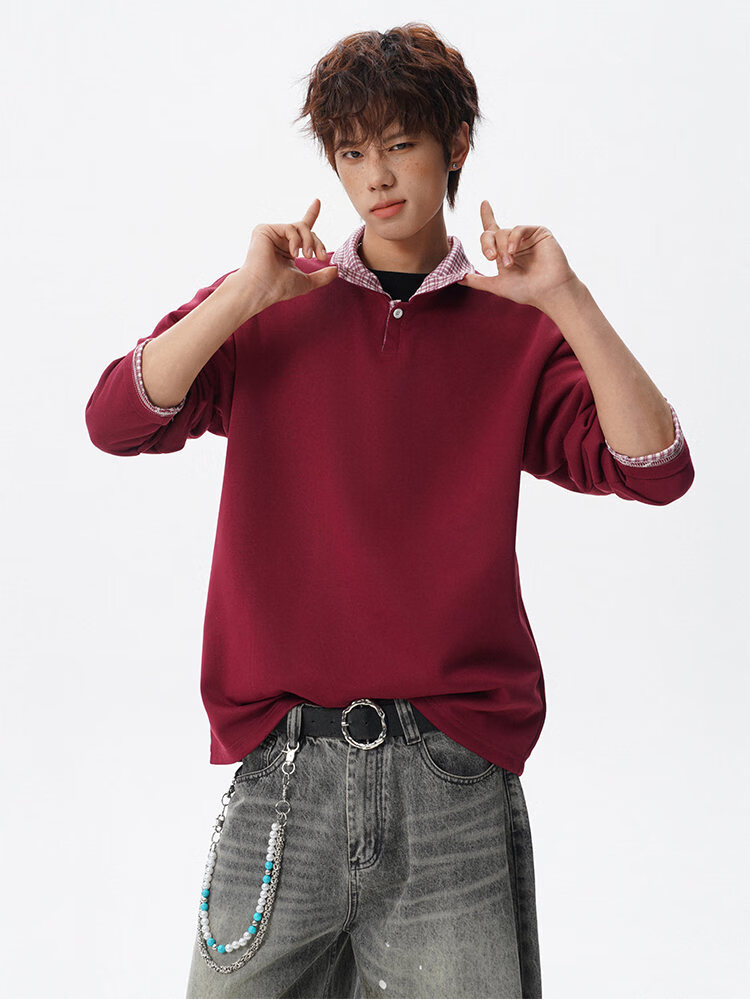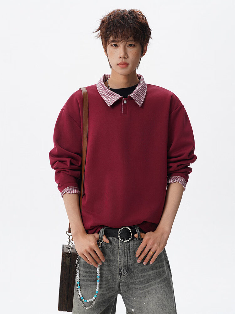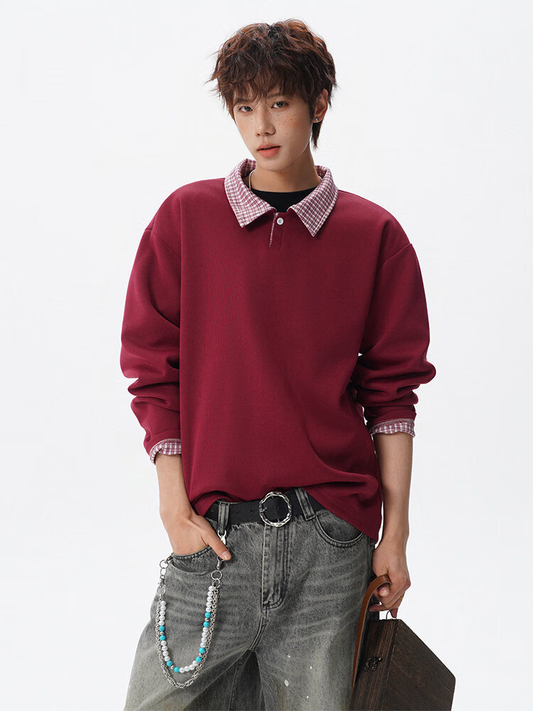 君茵格子撞色翻领卫衣男款春秋季老钱风重磅情侣长袖t恤男宽松上衣服 深灰色 XL