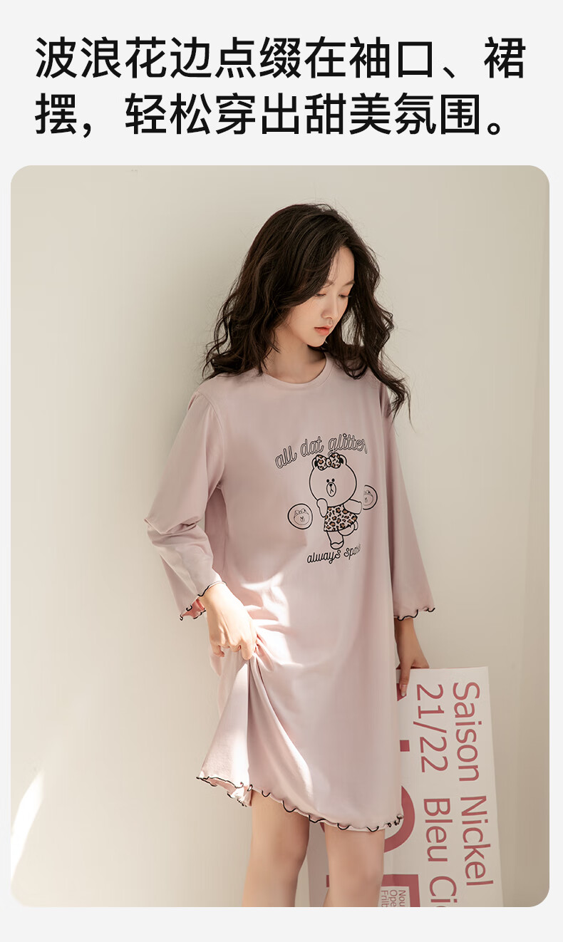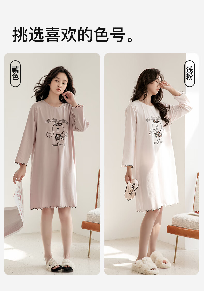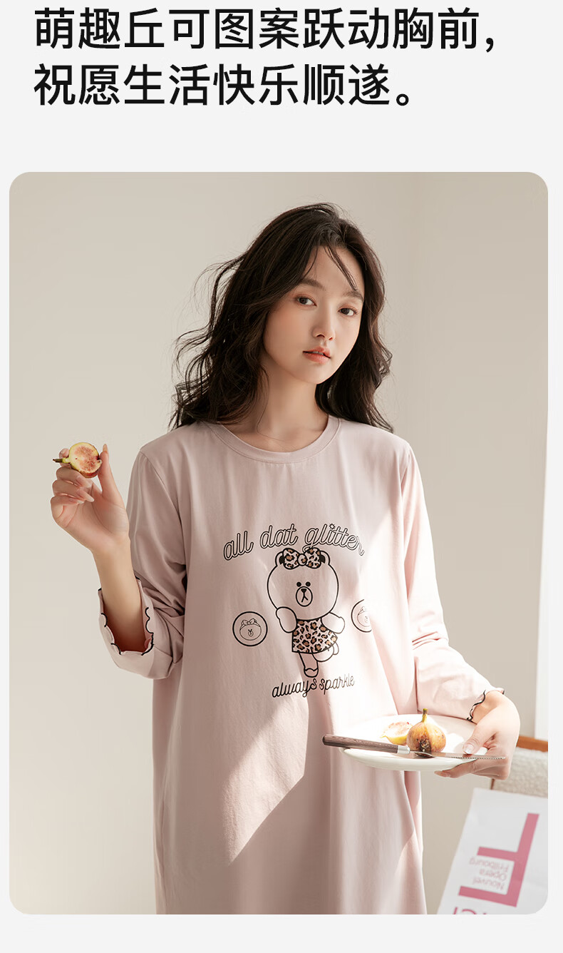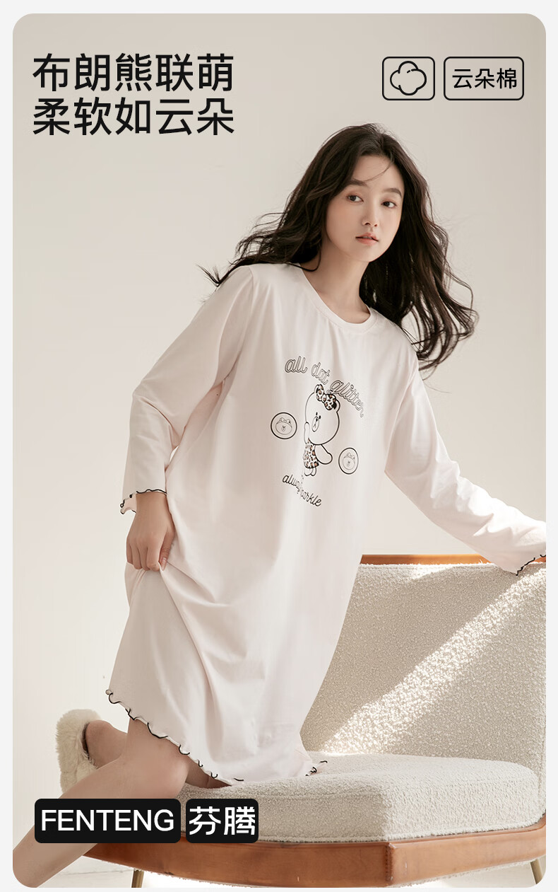 芬腾睡裙女云朵棉秋冬新款布朗熊IP联名亲肤圆领长袖睡裙连衣裙 浅粉 2XL